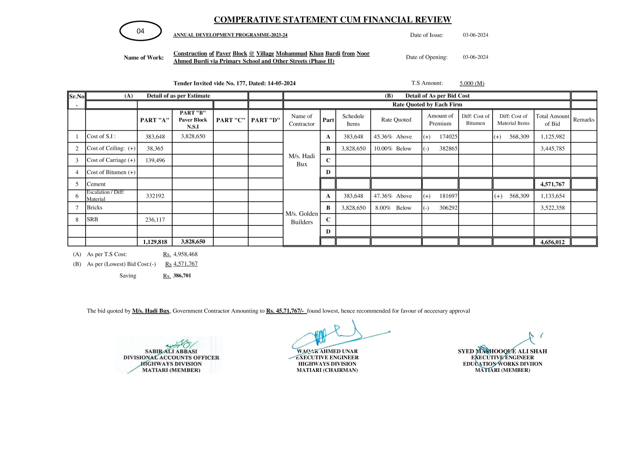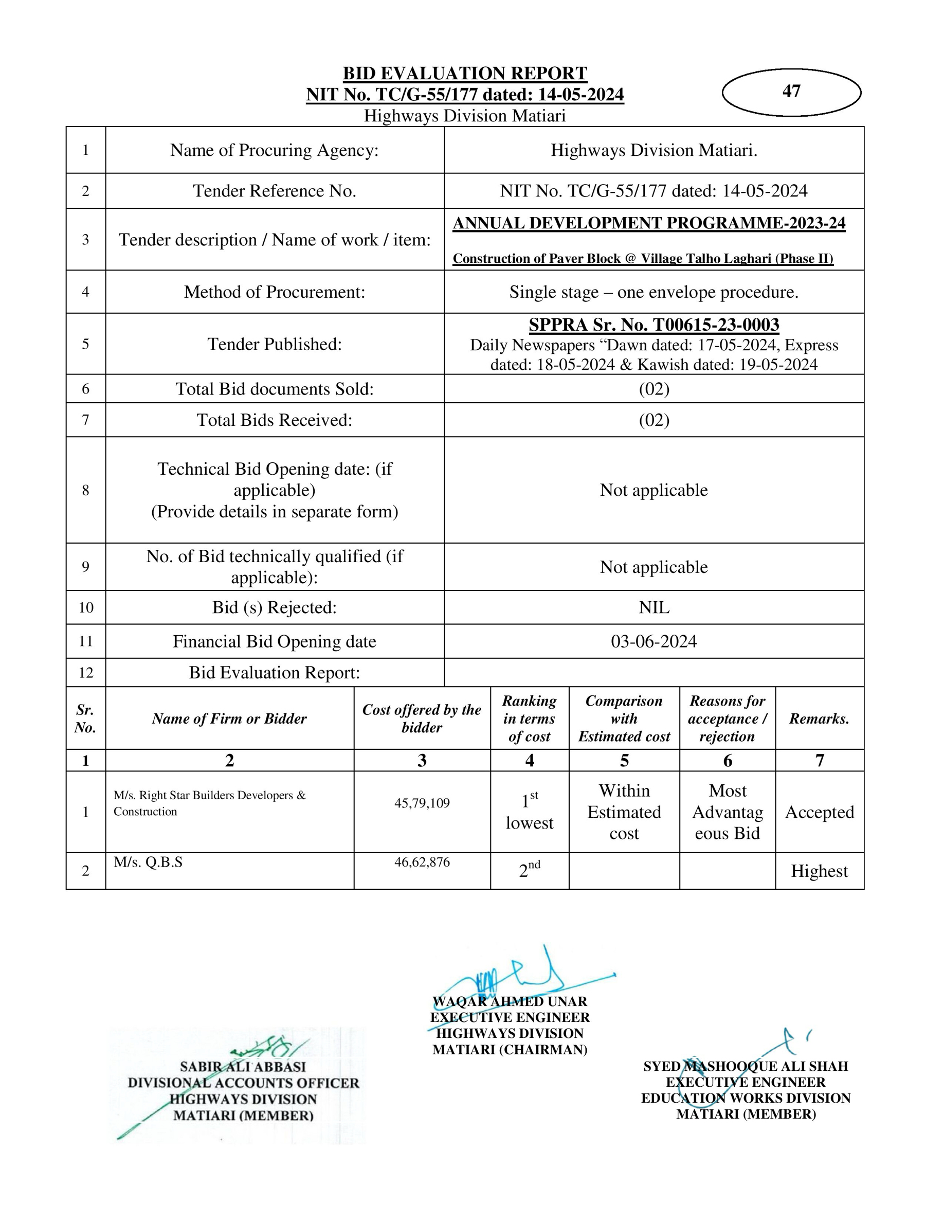 | T00615-23-0004 | BE00615-23-0004-36 | 95-Construction of Paver Block @ Village Mole Dino Khaskheli and Other Streets (Phase II) | XEN Highway Division Matiari (51-Works and Services Department) | 27-08-2024 | Matiari | Active |