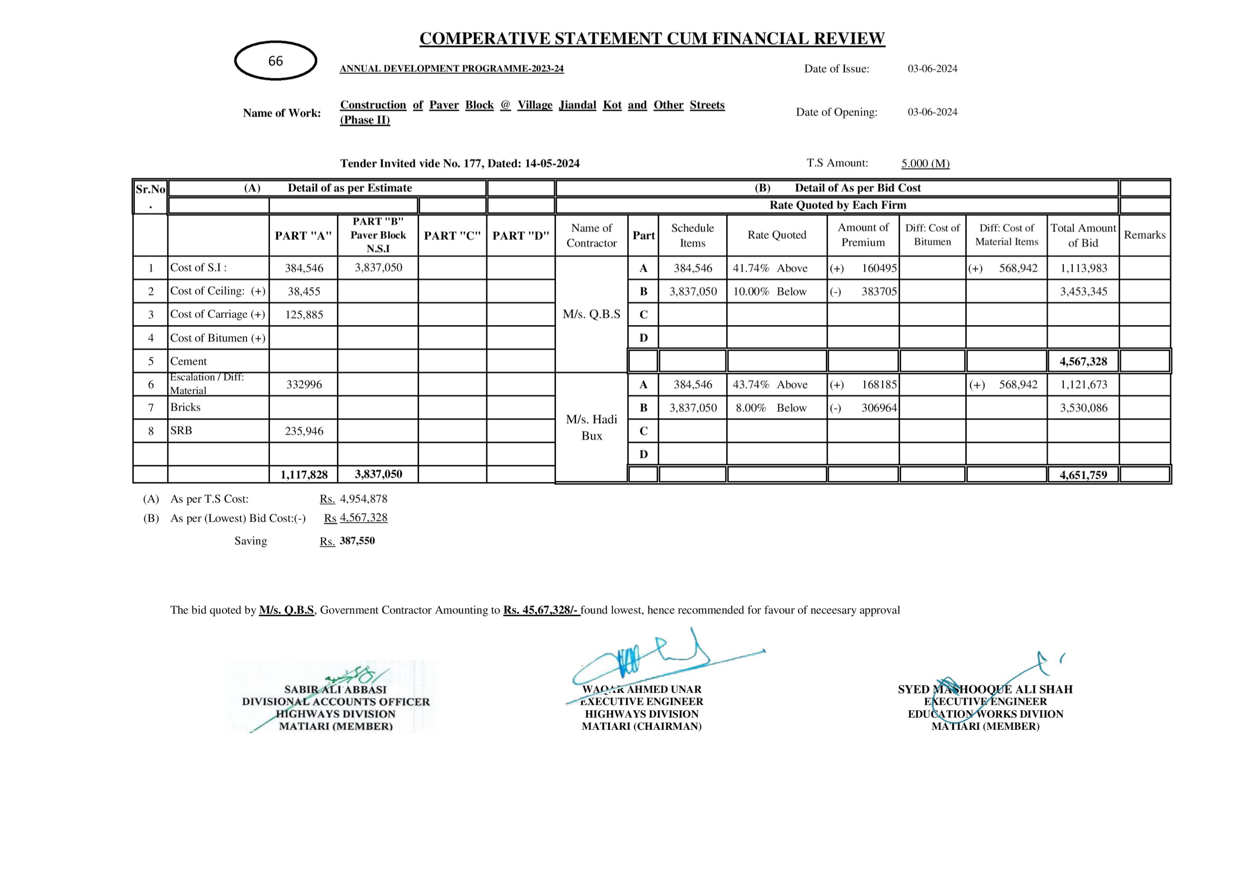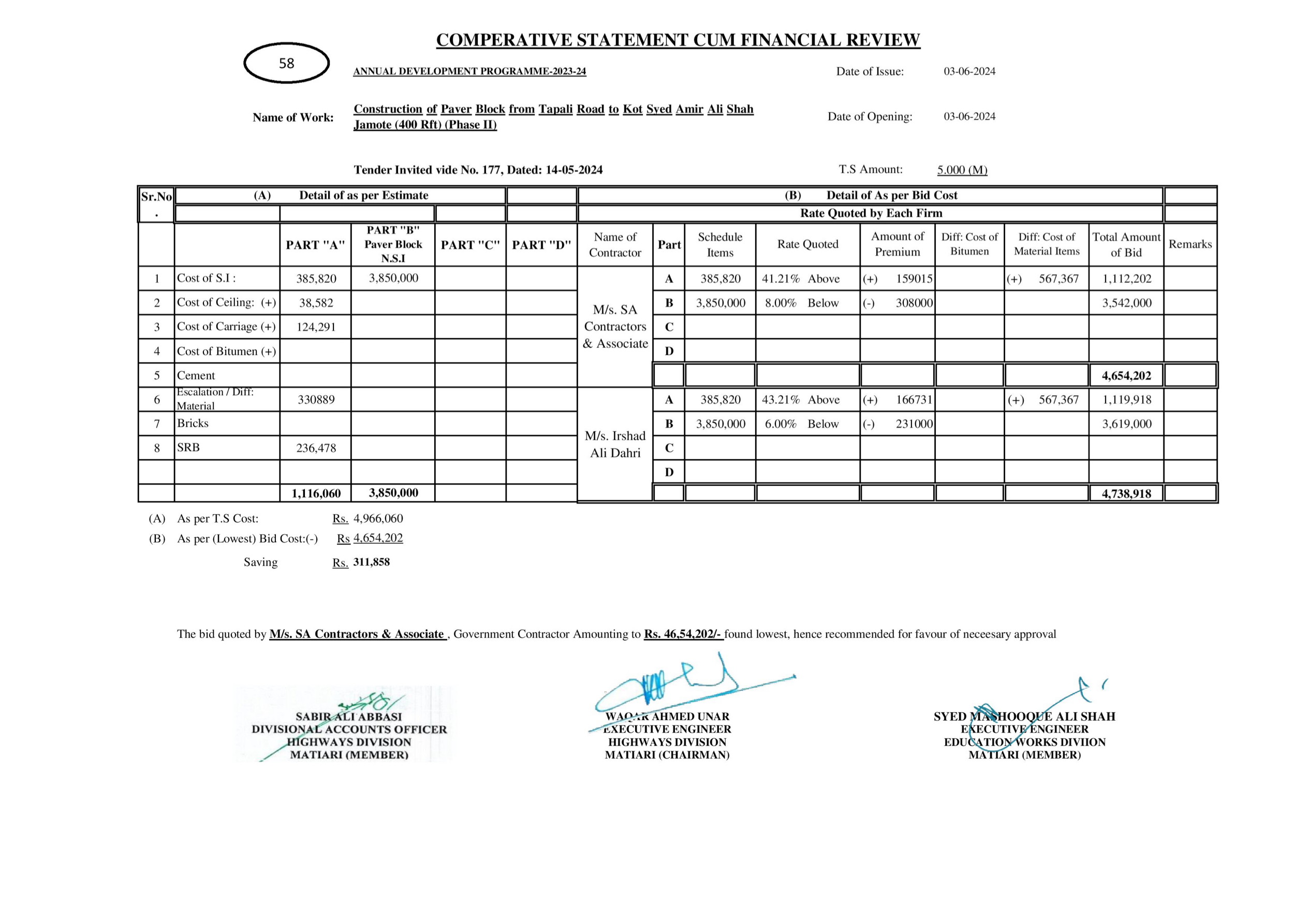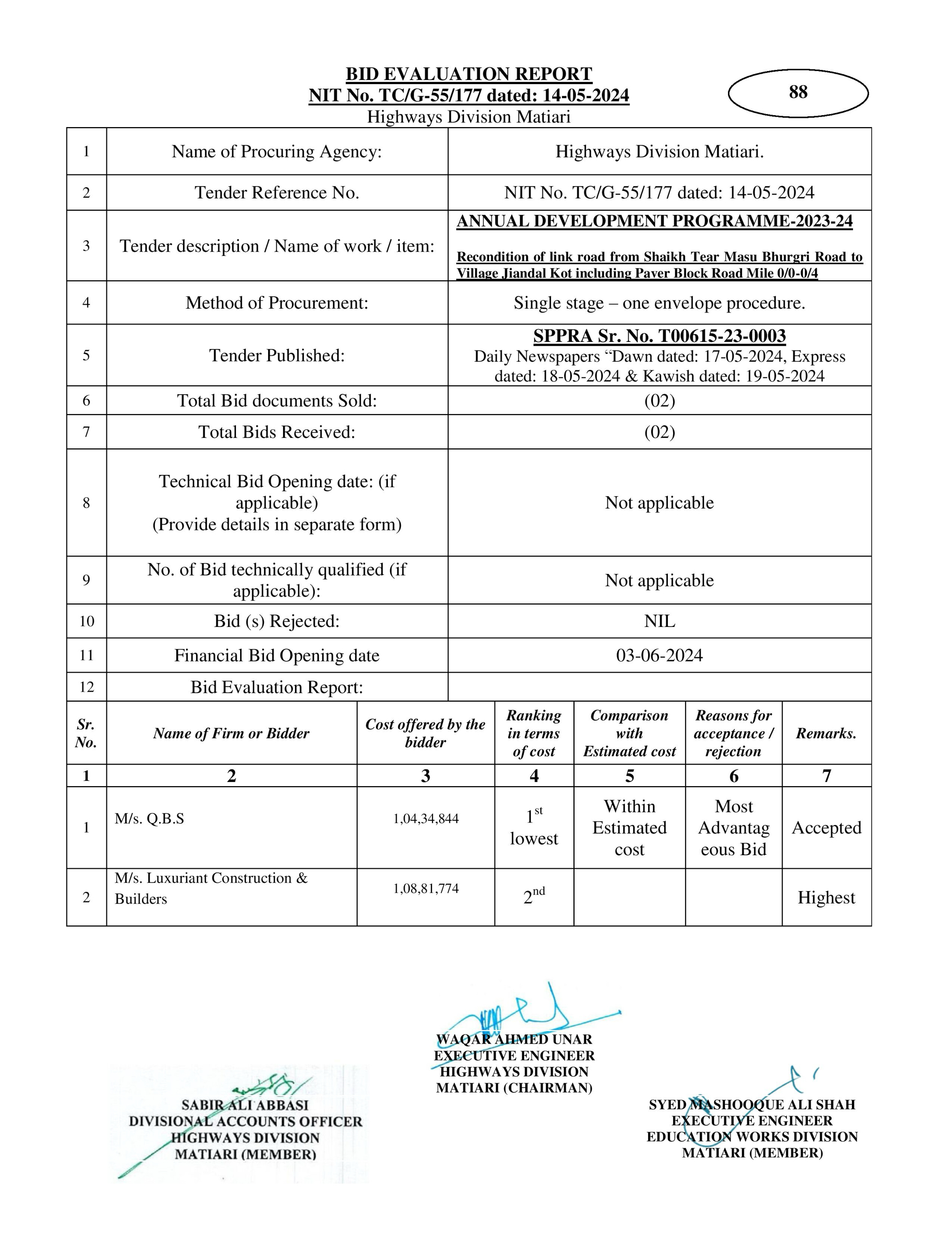 | T00615-23-0004 | BE00615-23-0004-32 | 97-Construction of Paver Block @ Village Jiandal Kot and Other Streets (Phase II | XEN Highway Division Matiari (51-Works and Services Department) | 27-08-2024 | Matiari | Active |