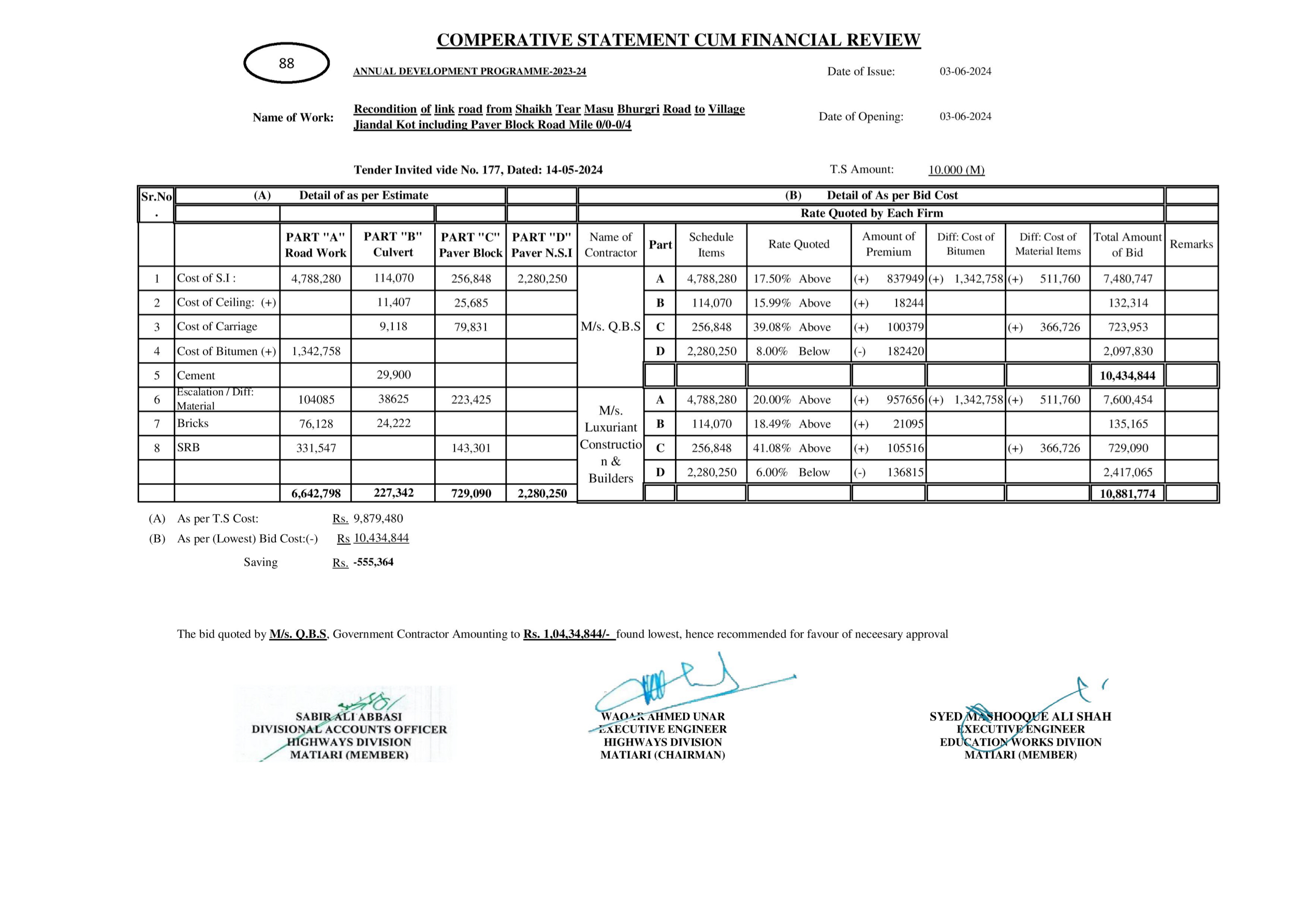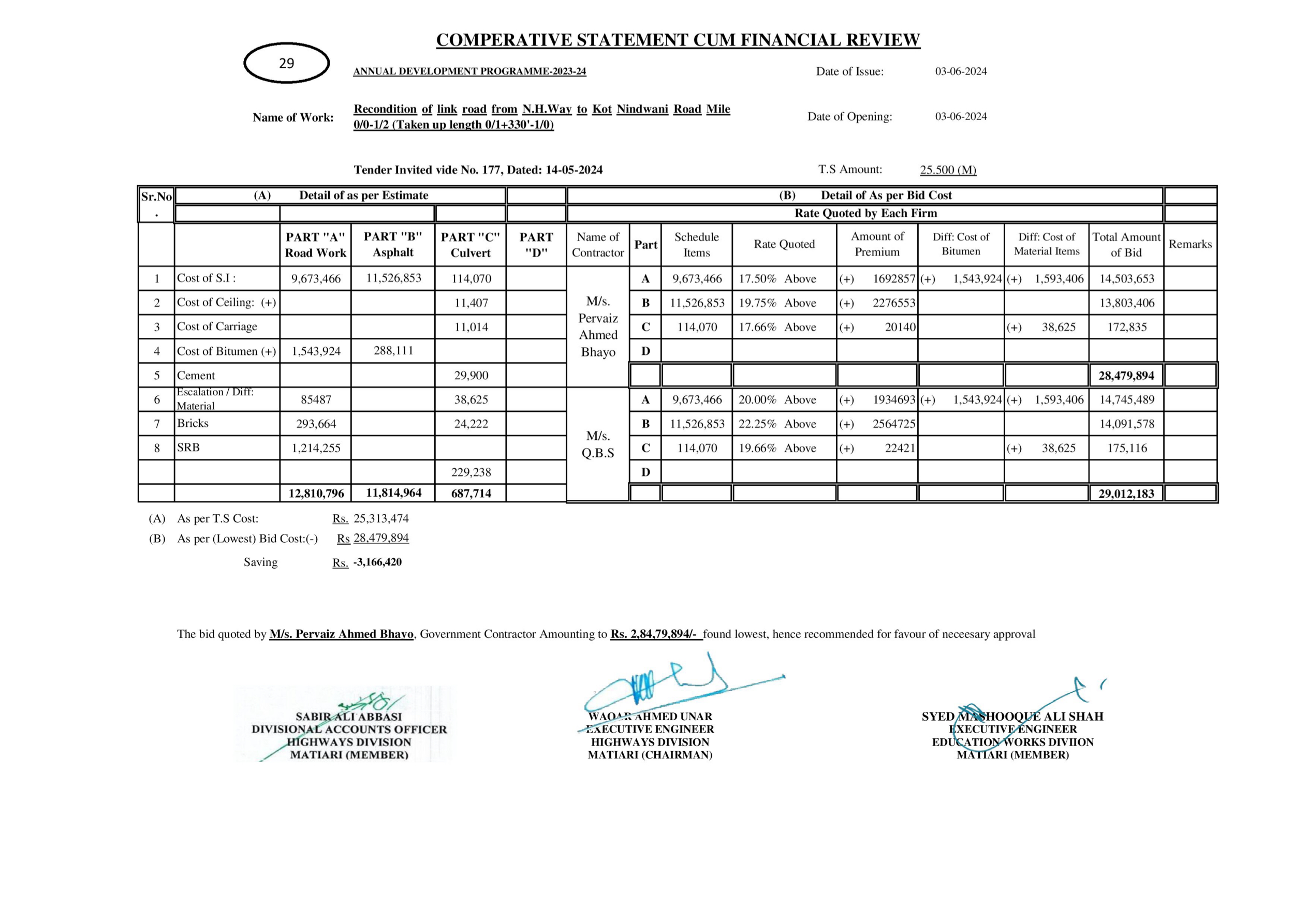 | T00615-23-0004 | BE00615-23-0004-37 | 60-Recondition of link road from N.H.Way to Kot Nindwani Road Mile 0/0-1/2 (Taken up length 0/1+330'-1/0) | XEN Highway Division Matiari (51-Works and Services Department) | 27-08-2024 | Matiari | Active |