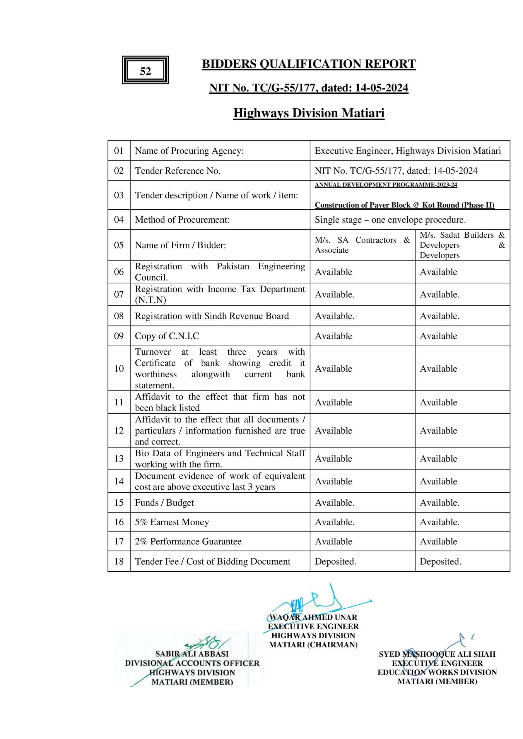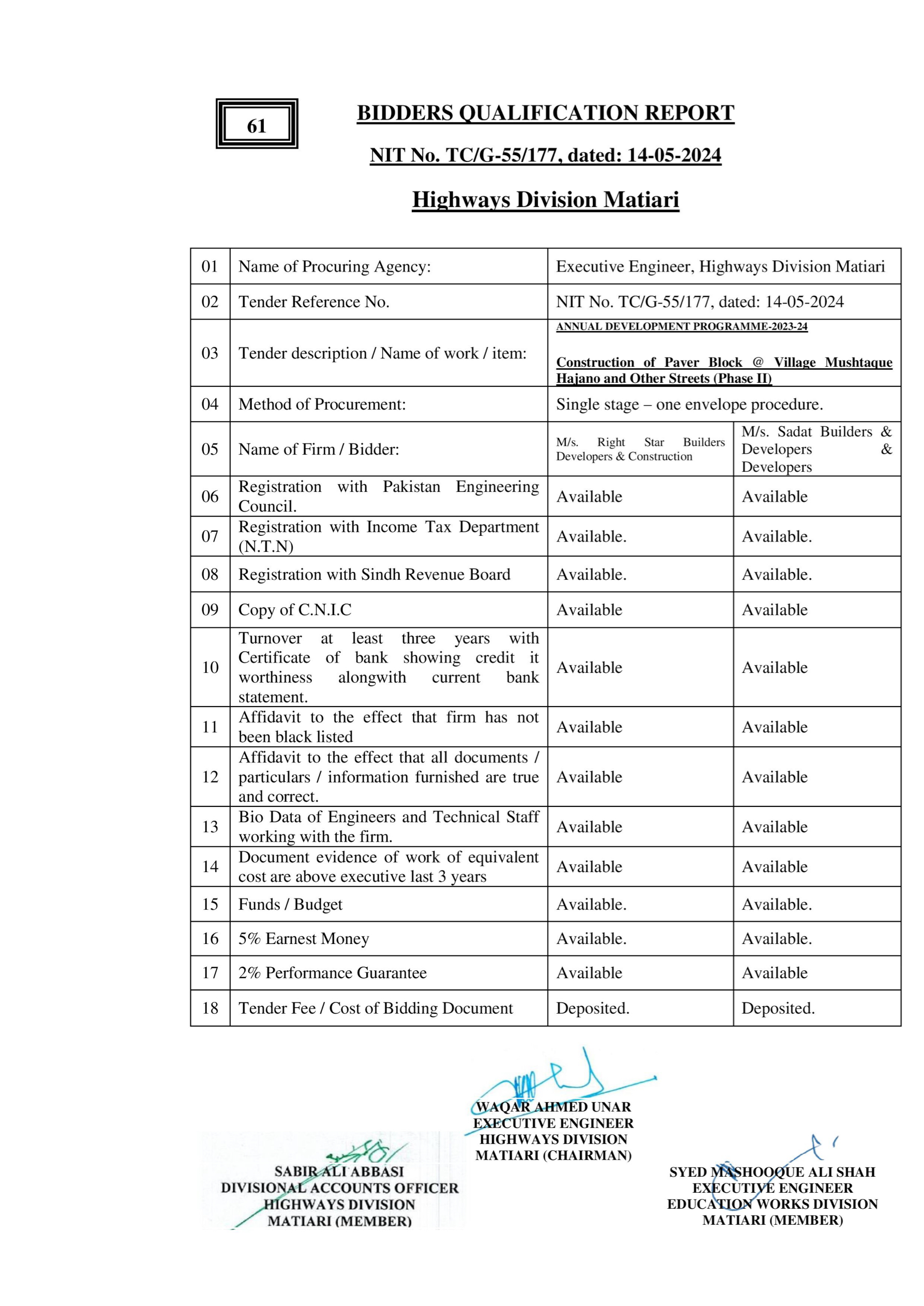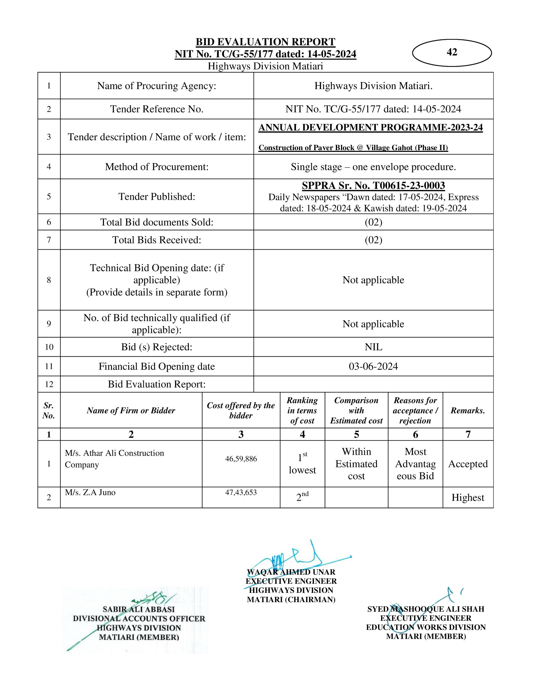| T00615-23-0003 | BE00615-23-0003-52 | 38-Construction of Paver Block @ Village Dawood Sangrasi (Phase II) | XEN Highway Division Matiari (51-Works and Services Department) | 27-08-2024 | Matiari | Active |