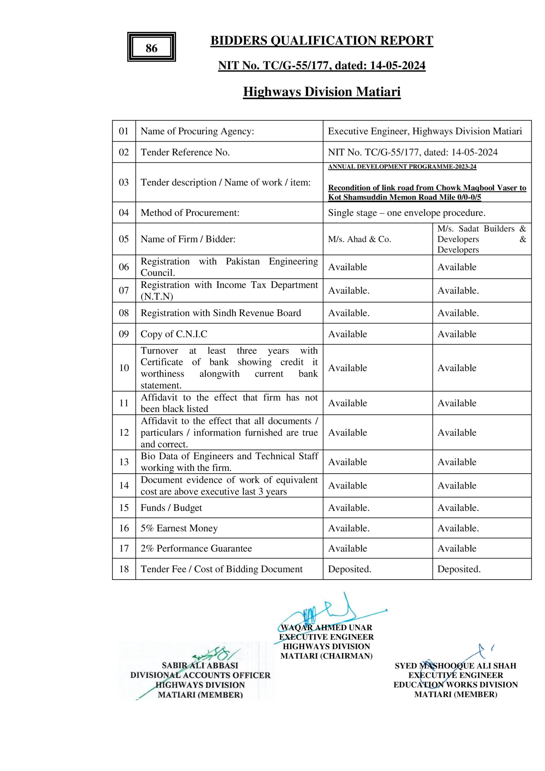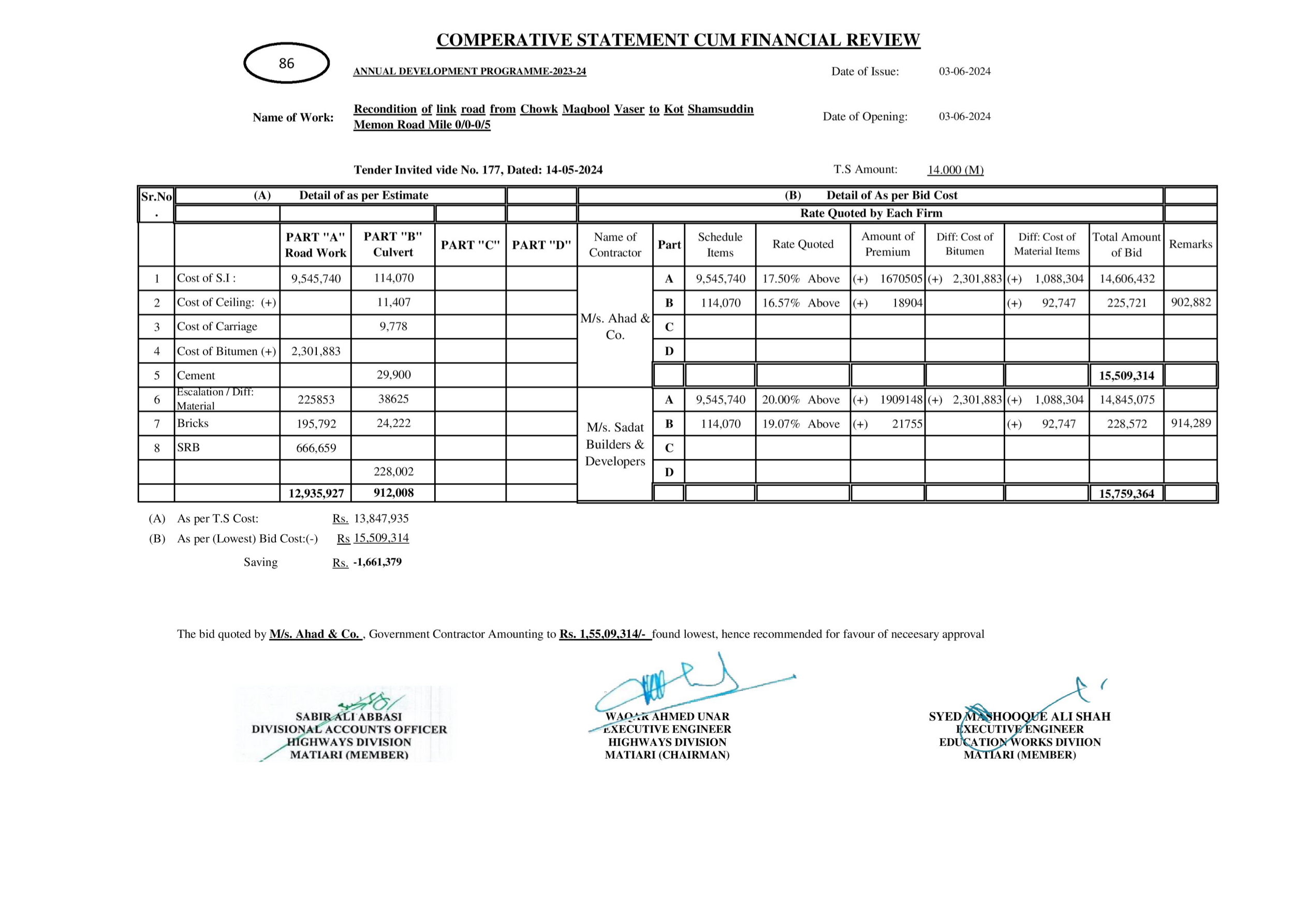 | T00615-23-0003 | BE00615-23-0003-53 | 117-Recondition of link road from Chowk Maqbool Vaser to Kot Shamsuddin Memon Road Mile 0/0-0/5 | XEN Highway Division Matiari (51-Works and Services Department) | 27-08-2024 | Matiari | Active |