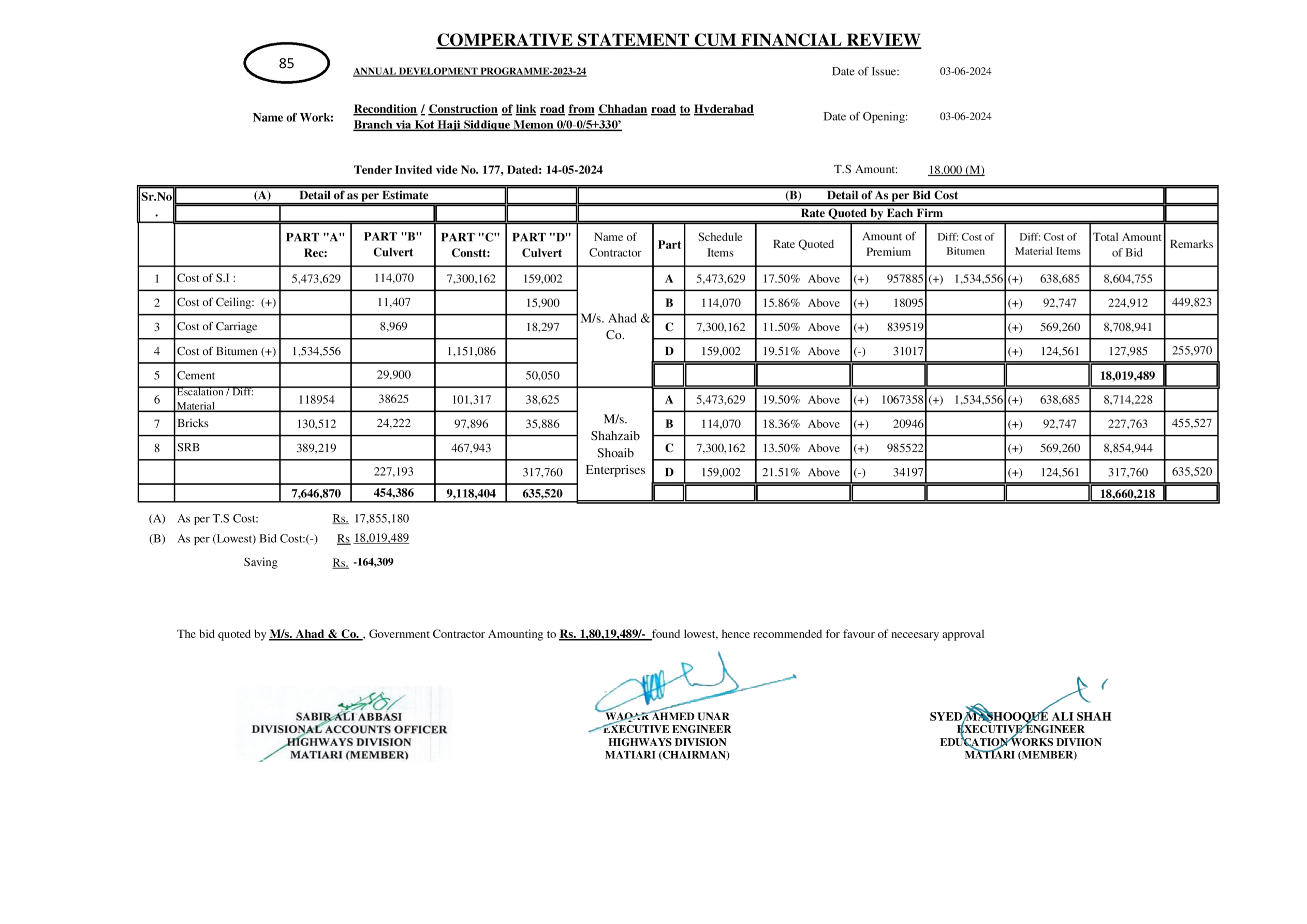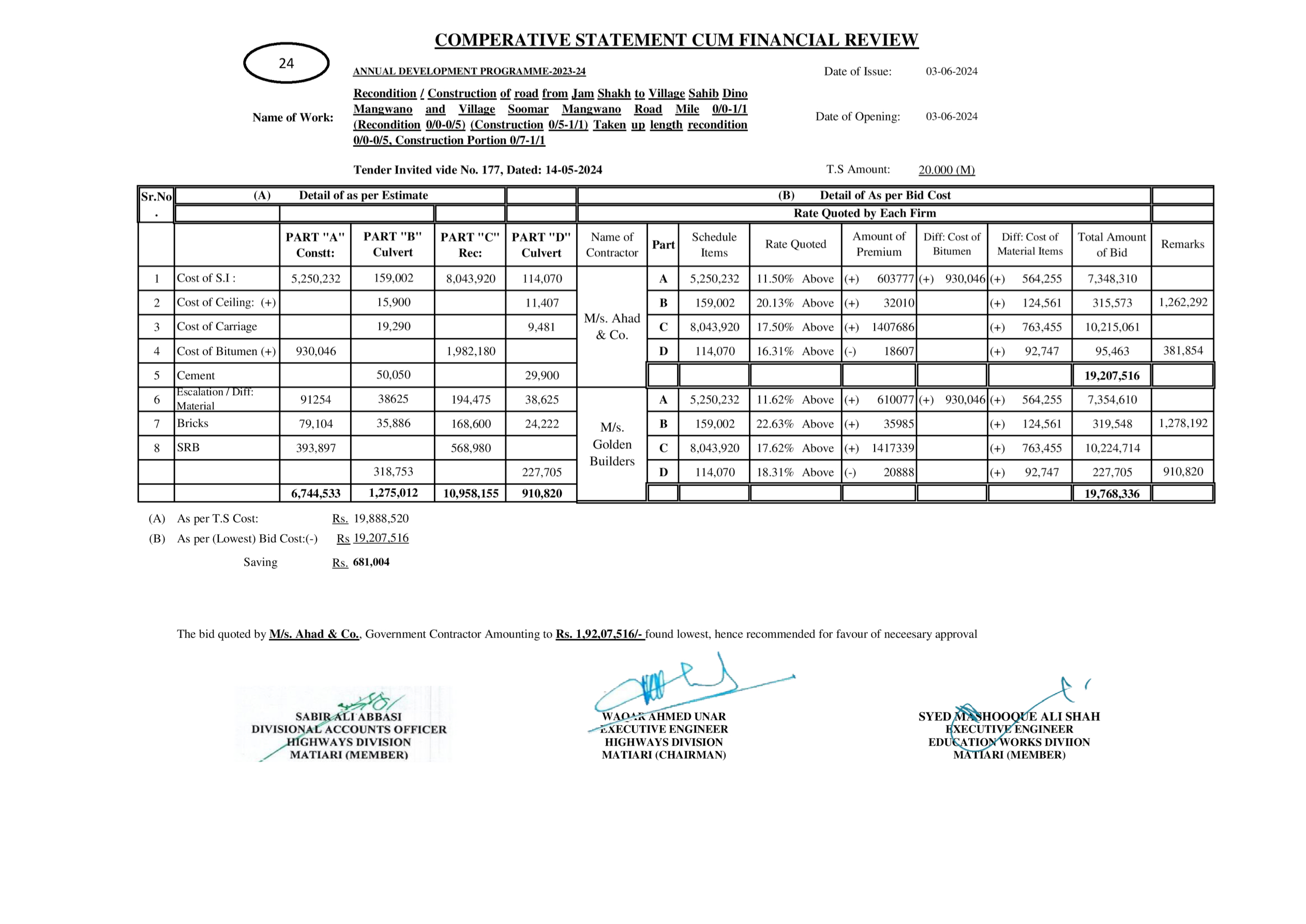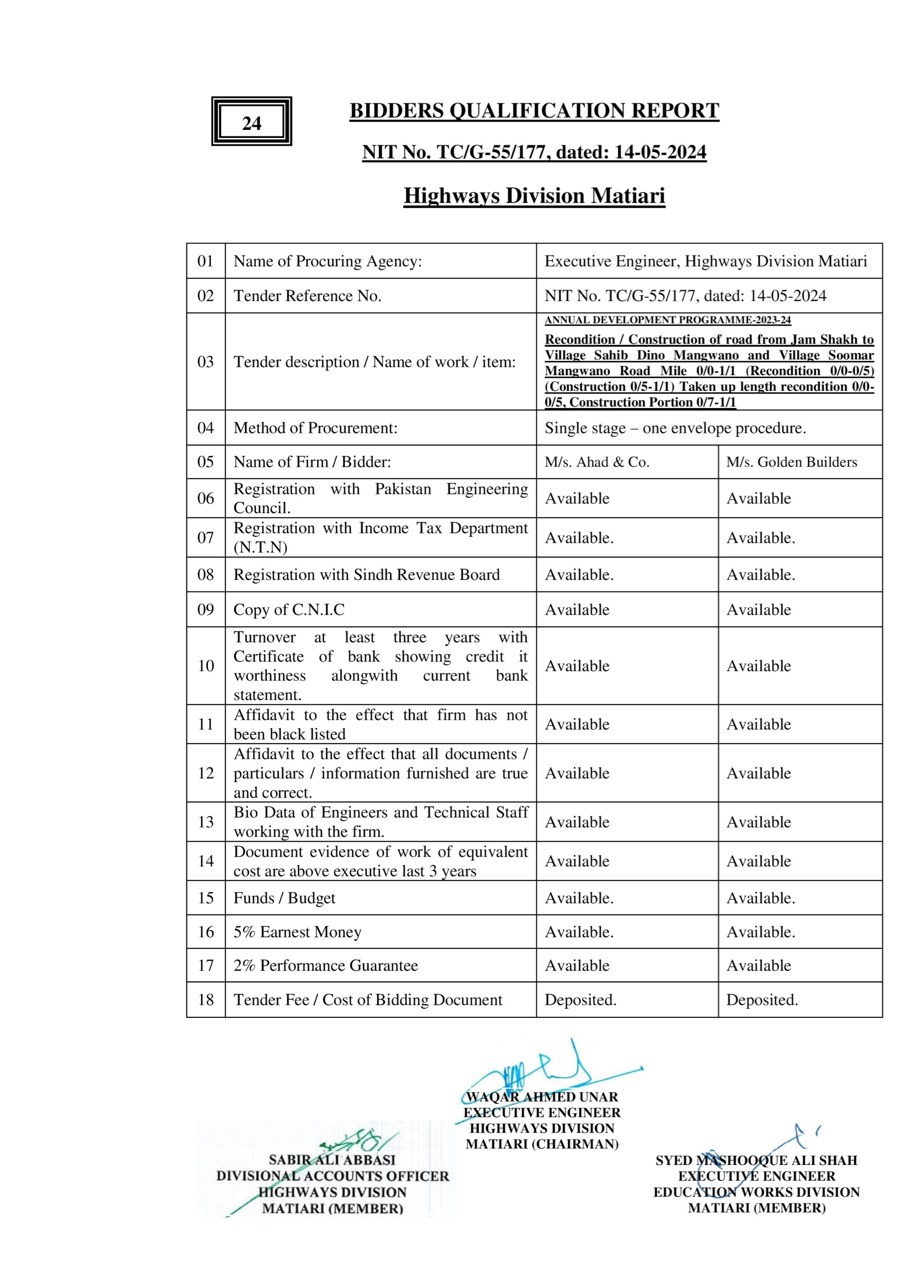 | T00615-23-0003 | BE00615-23-0003-65 | 116-Recondition / Construction of link road from Chhadan road to Hyderabad Branch via Kot Haji Siddique Memon 0/0-0/5+330’ | XEN Highway Division Matiari (51-Works and Services Department) | 27-08-2024 | Matiari | Active |