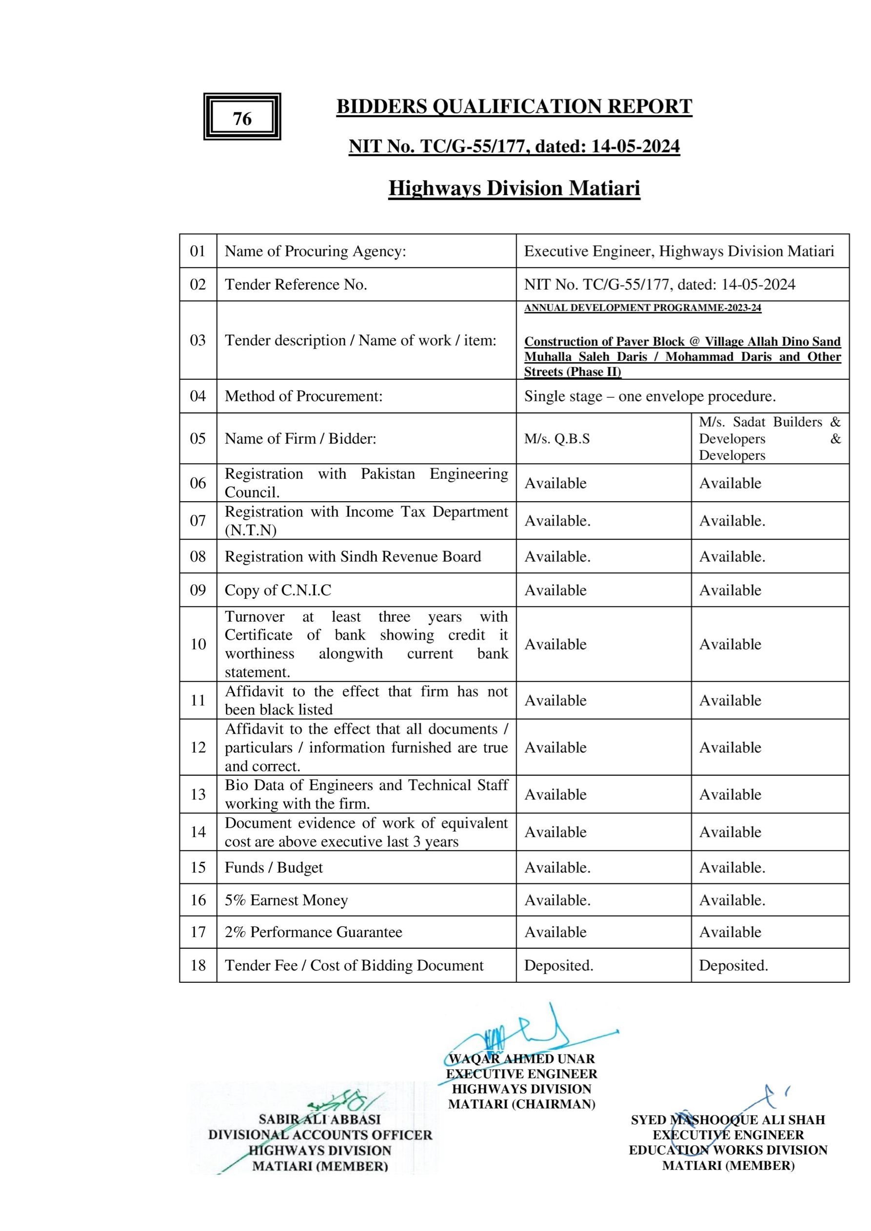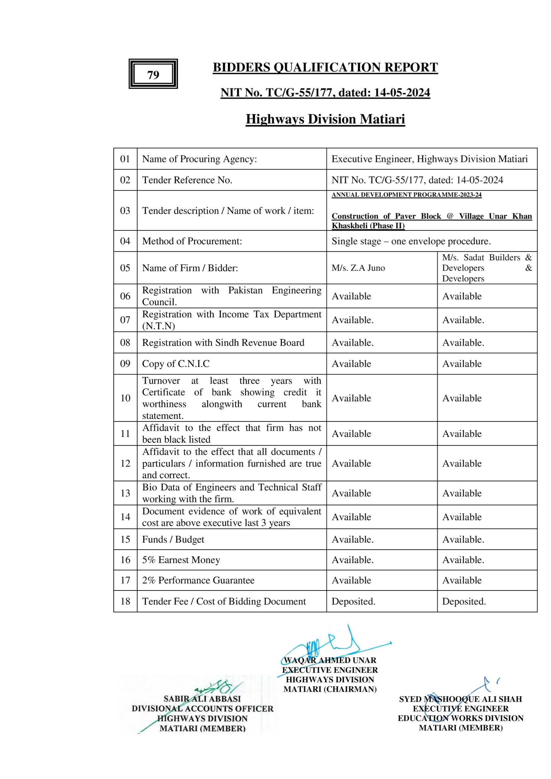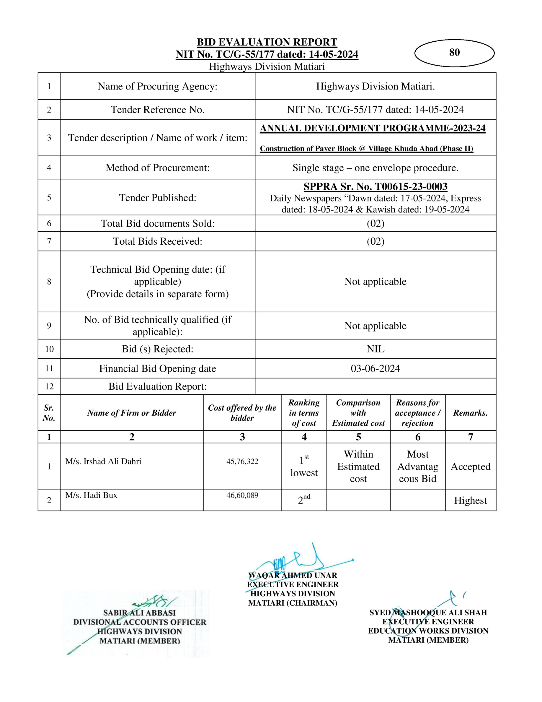 | T00615-23-0003 | BE00615-23-0003-62 | 52-Construction of Paver Block @ Village Jan Mohammad Sangrasi (Phase II) | XEN Highway Division Matiari (51-Works and Services Department) | 27-08-2024 | Matiari | Active |