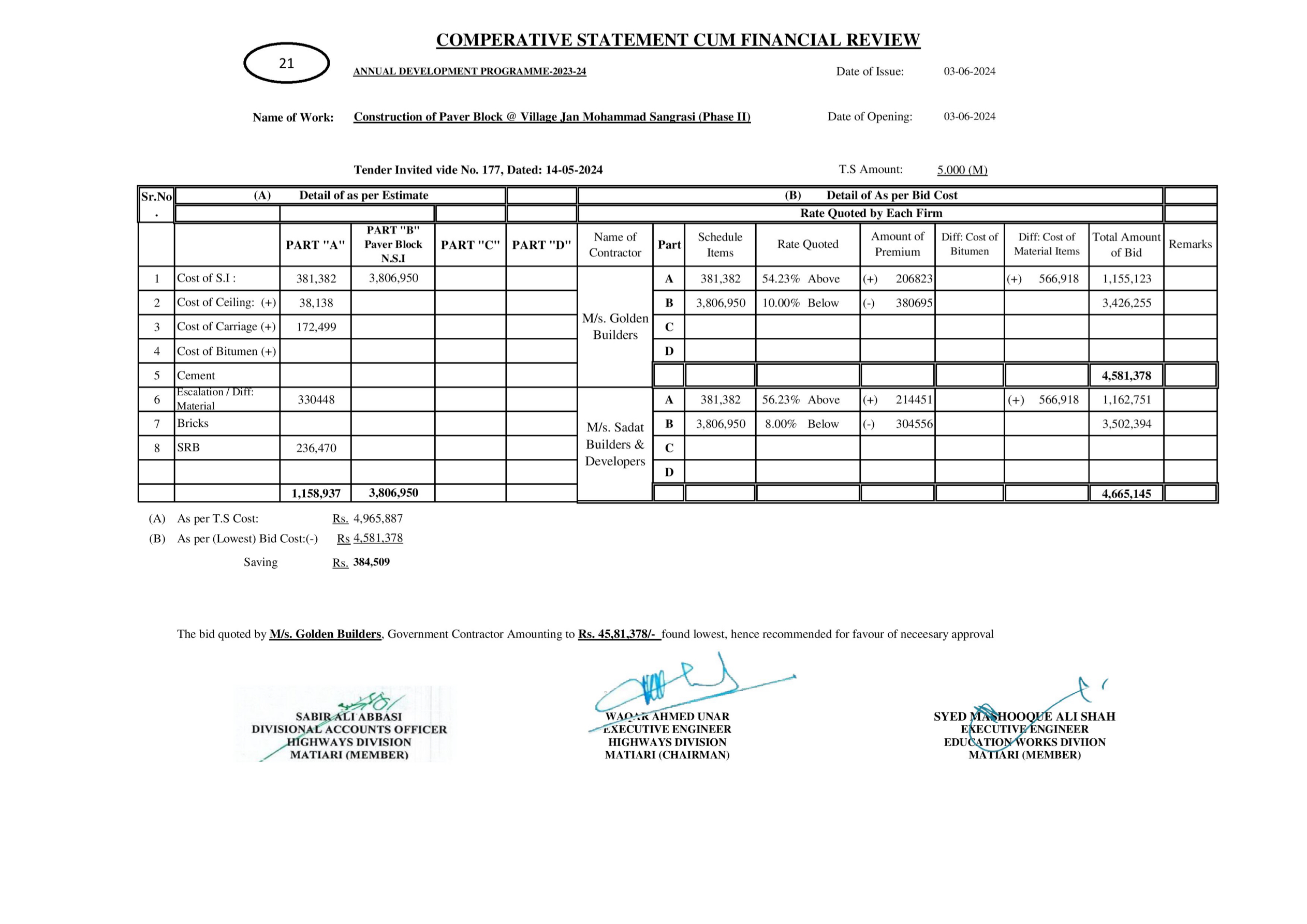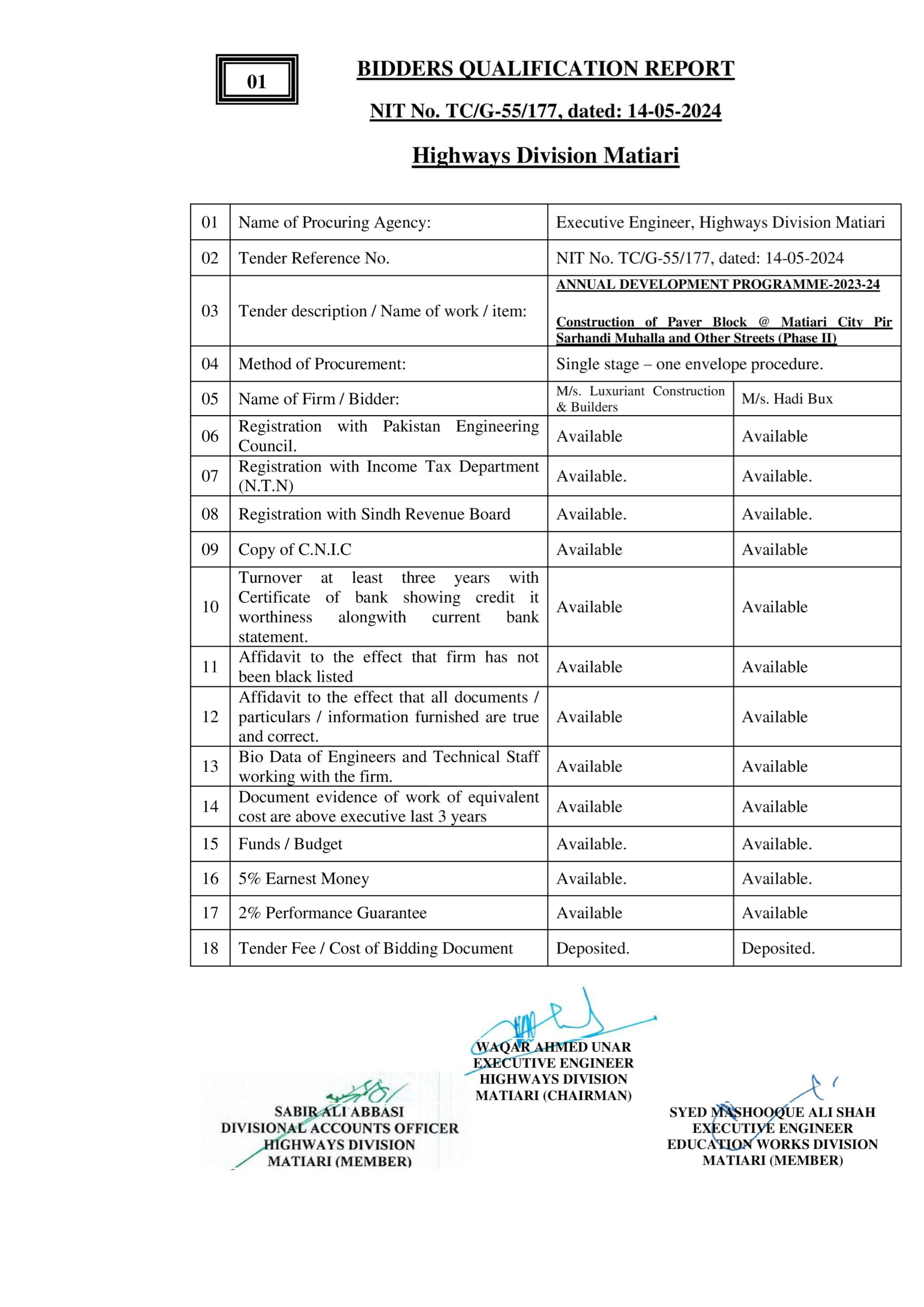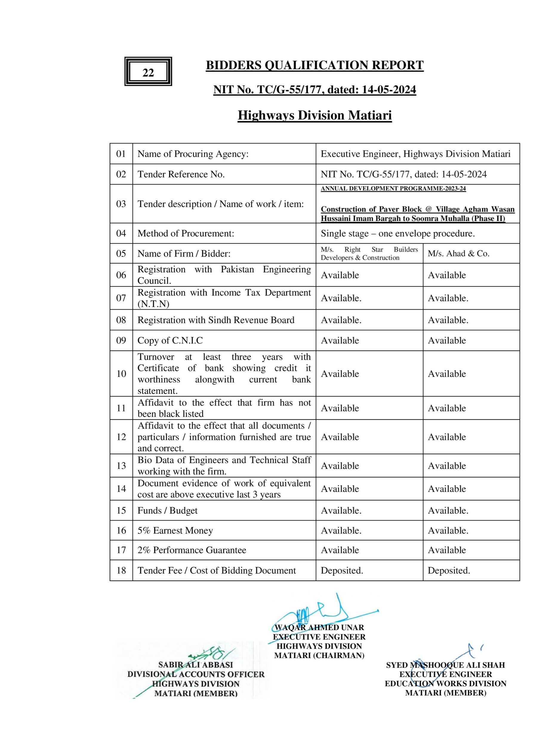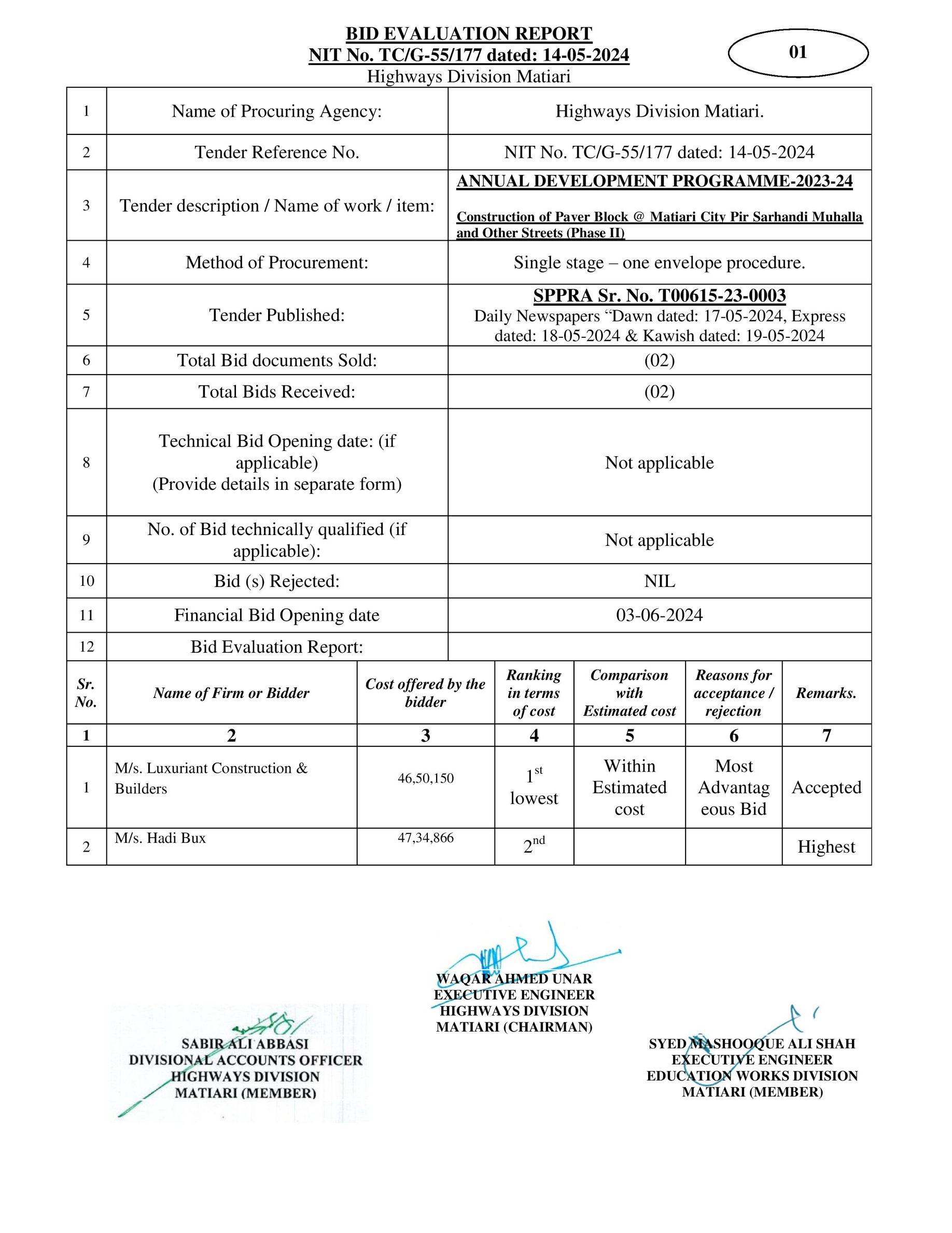 | T00615-23-0003 | BE00615-23-0003-62 | 52-Construction of Paver Block @ Village Jan Mohammad Sangrasi (Phase II) | XEN Highway Division Matiari (51-Works and Services Department) | 27-08-2024 | Matiari | Active |