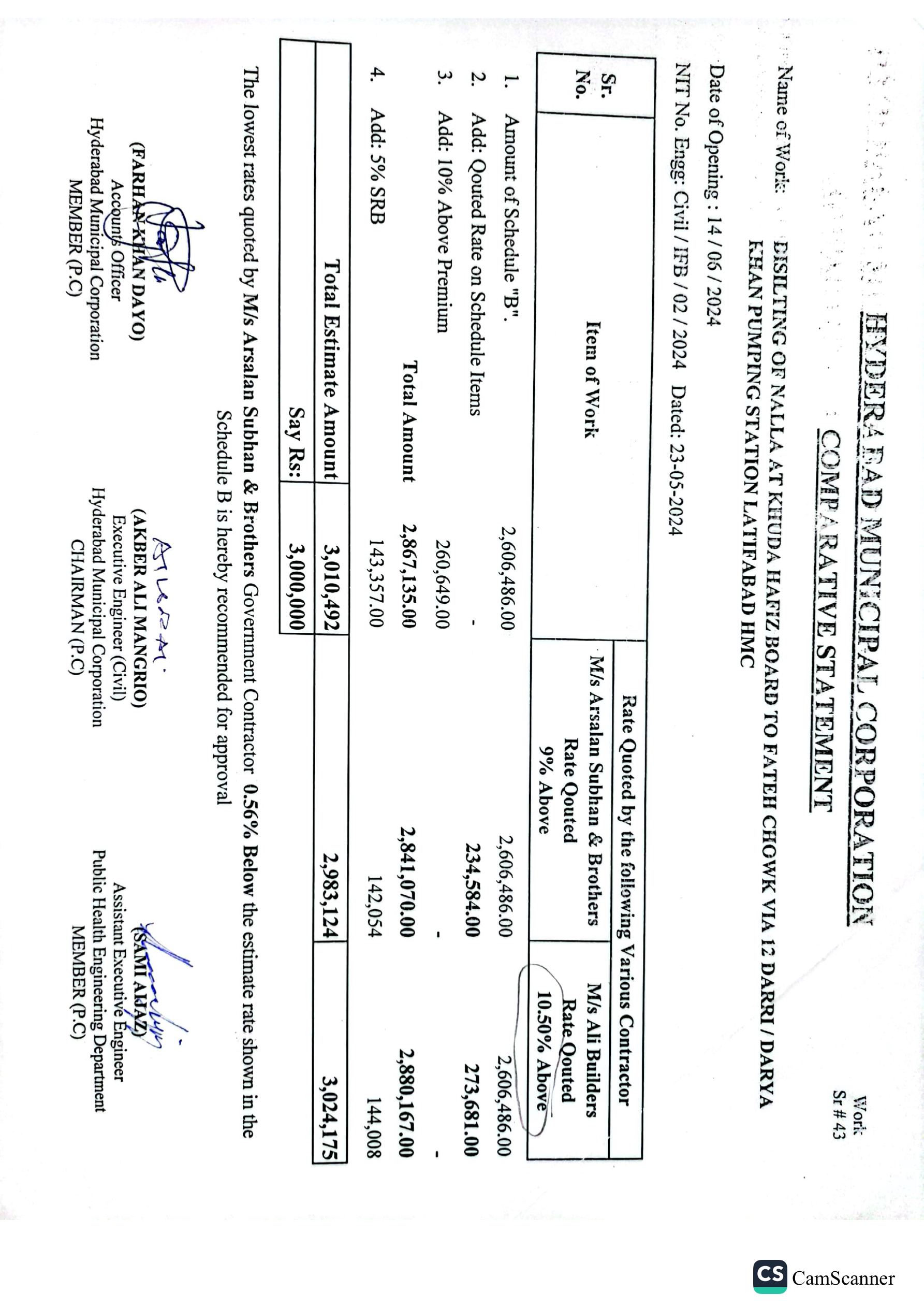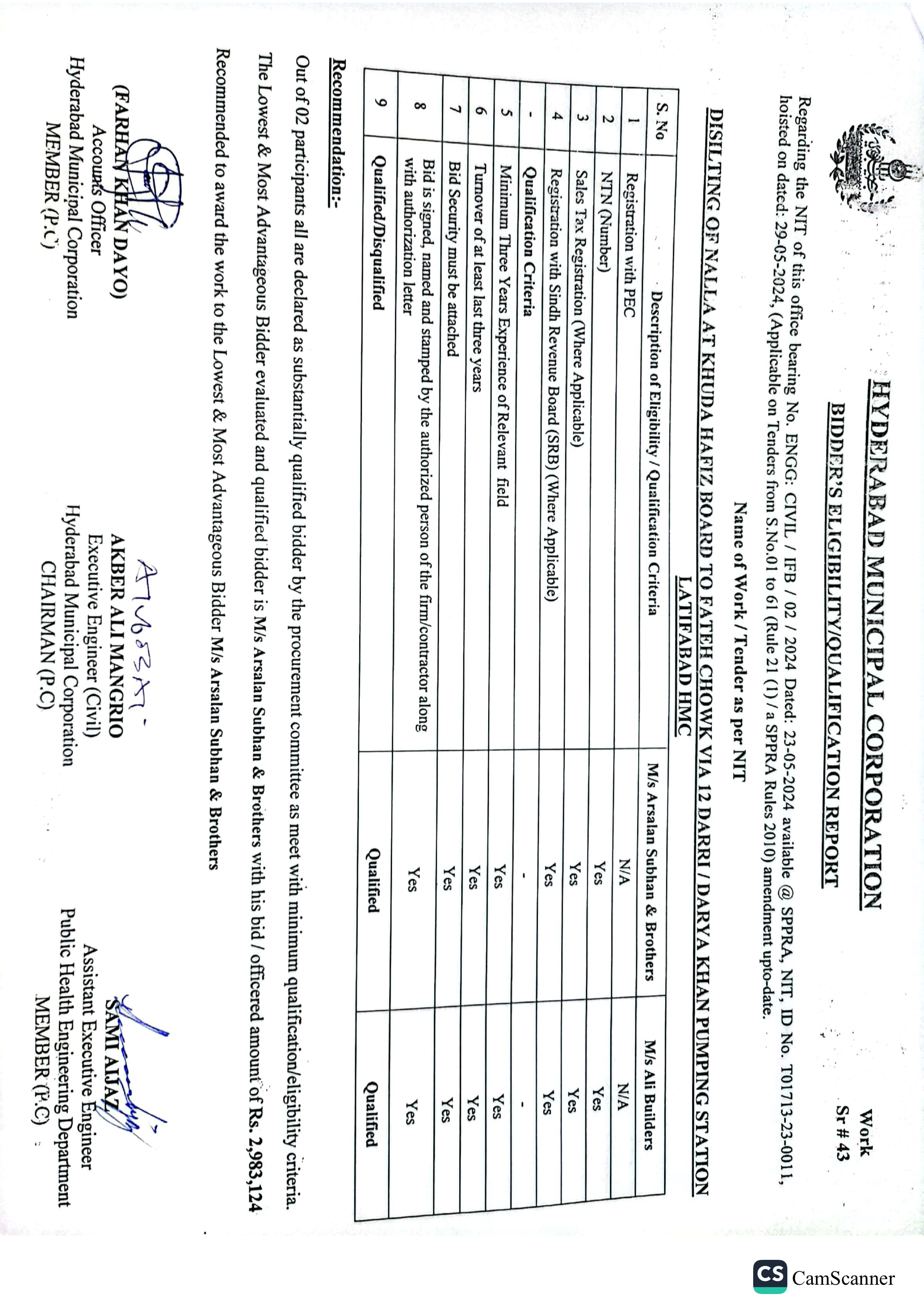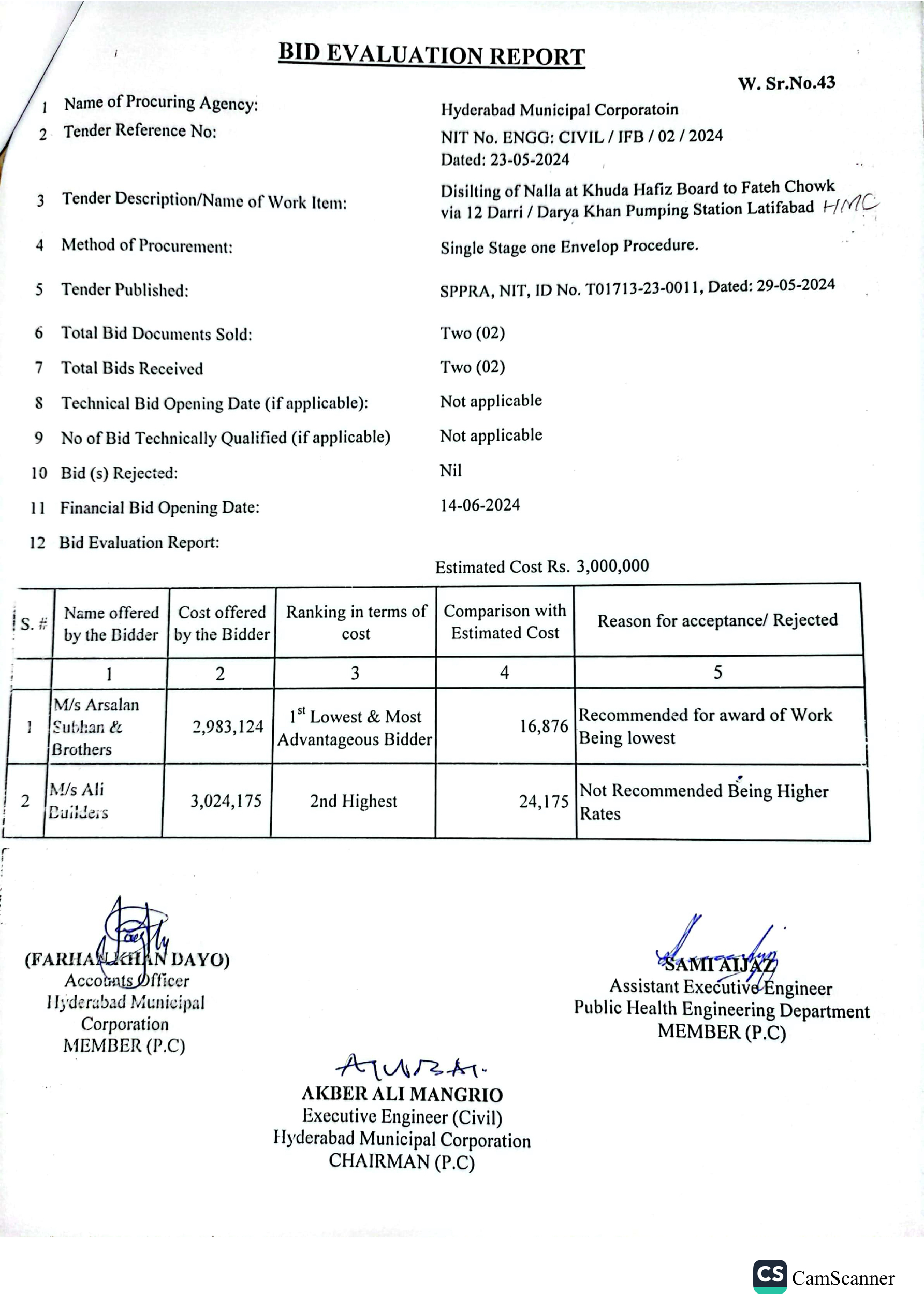 | T01713-23-0011 | BE01713-23-00011-43 | 43 DISILTING OF NALLA AT KHUDA HAFIZ BOARD TO FATEH CHOWK VIA 12 DARRI / DARYA KHAN PUMPING STATION LATIFABAD HMC | Office of Mayor Hyderabad Municipal Corporation Hyderabad (27-Local Government Department) | 26-06-2024 | Hyderabad | Active |