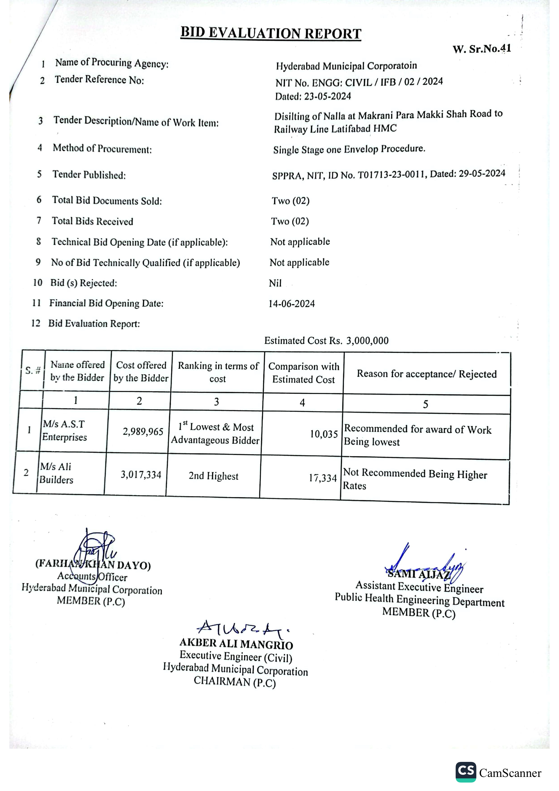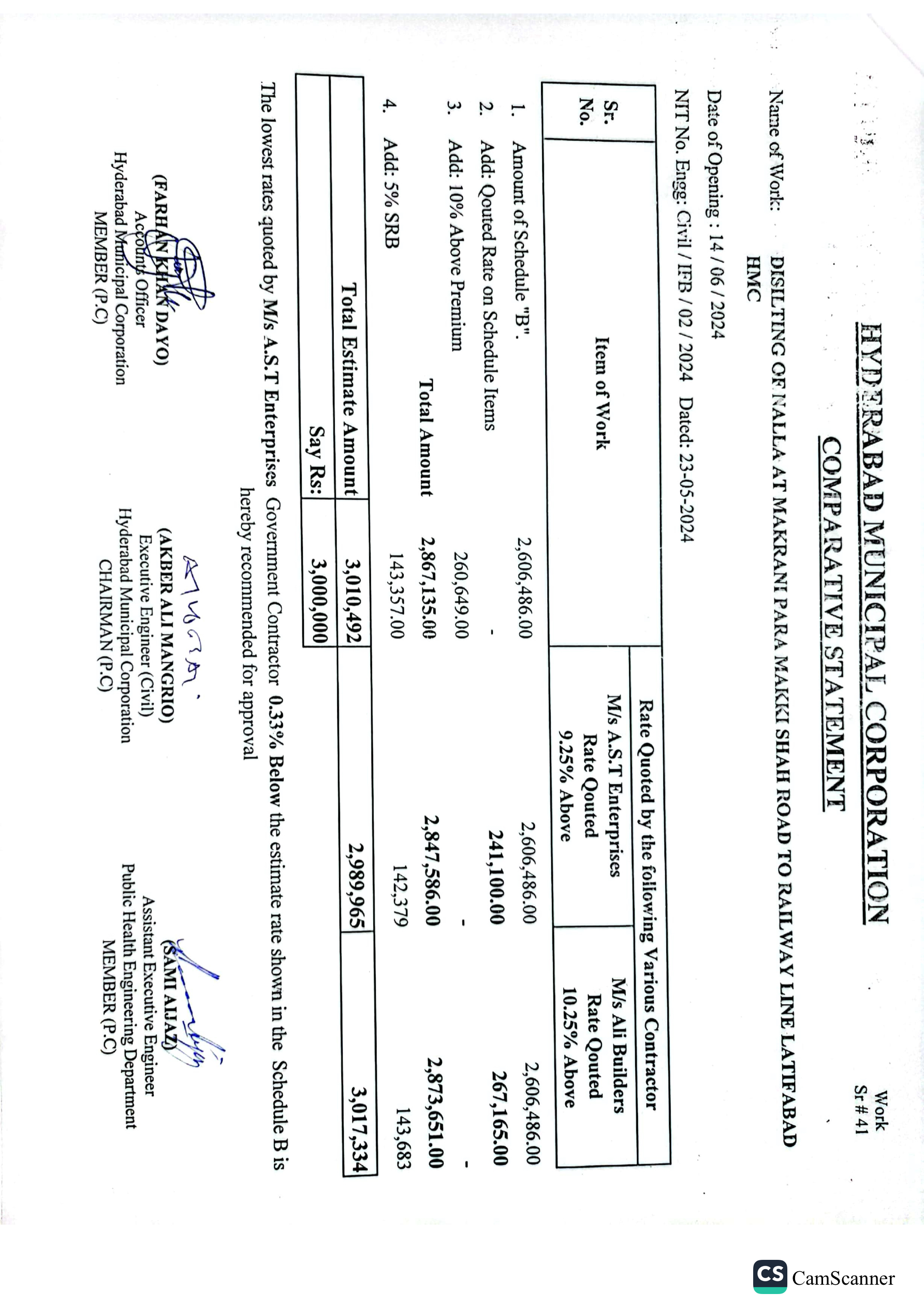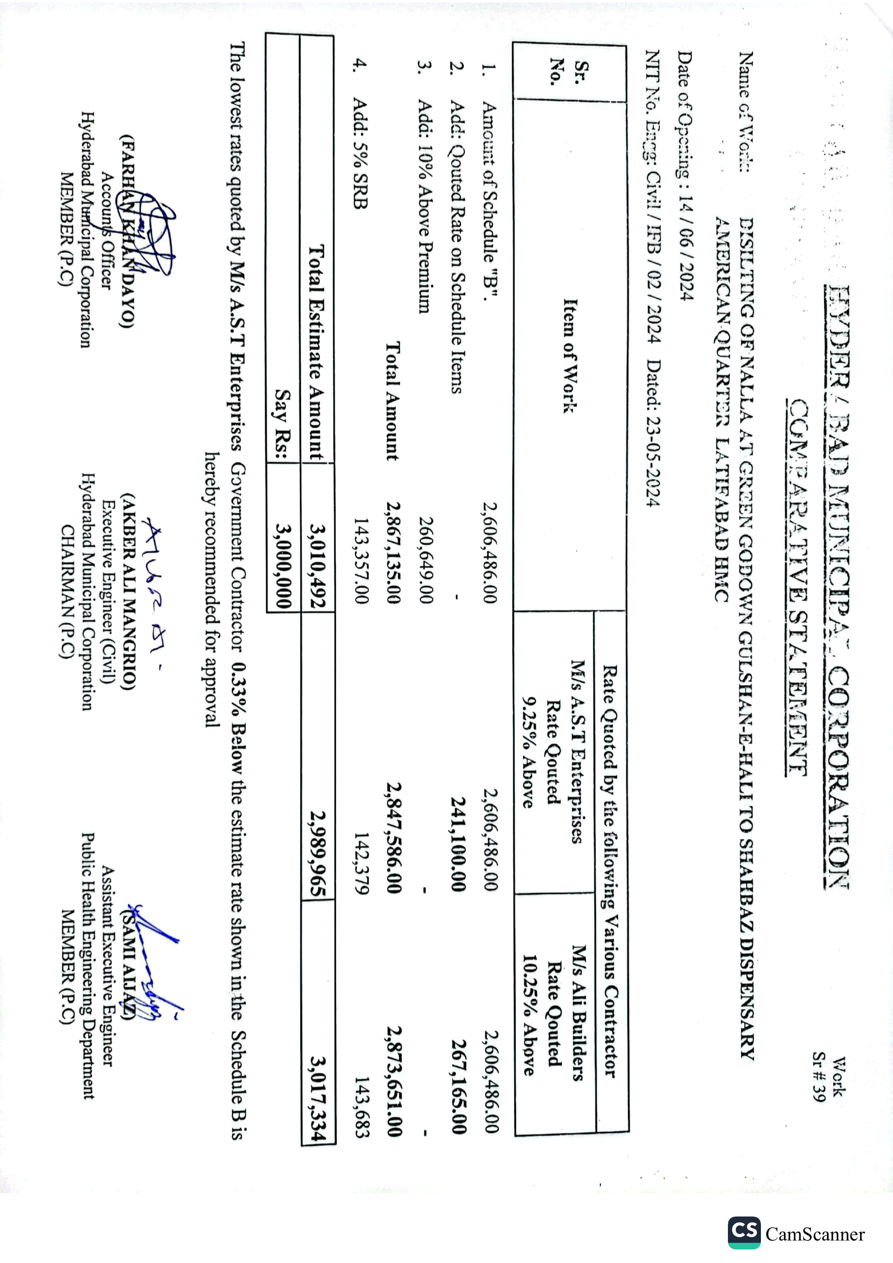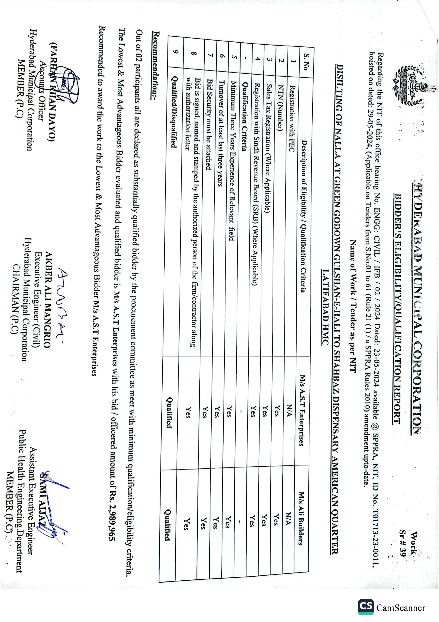 | T01713-23-0011 | BE01713-23-00011-39 | 39 DISILTING OF NALLA AT GREEN GODOWN GULSHAN-E-HALI TO SHAHBAZ DISPENSARY AMERICAN QUARTER LATIFABAD HMC | Office of Mayor Hyderabad Municipal Corporation Hyderabad (27-Local Government Department) | 26-06-2024 | Hyderabad | Active |
