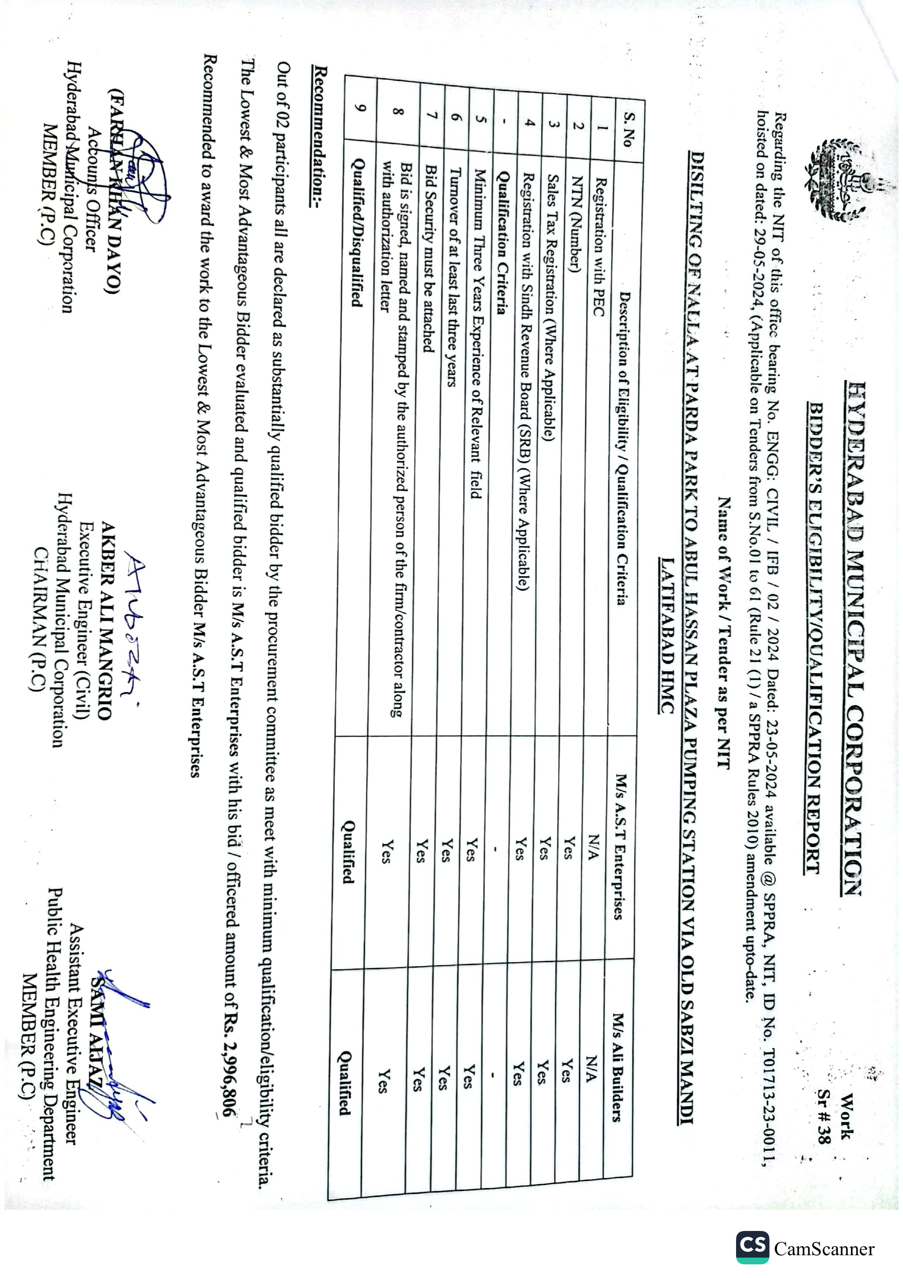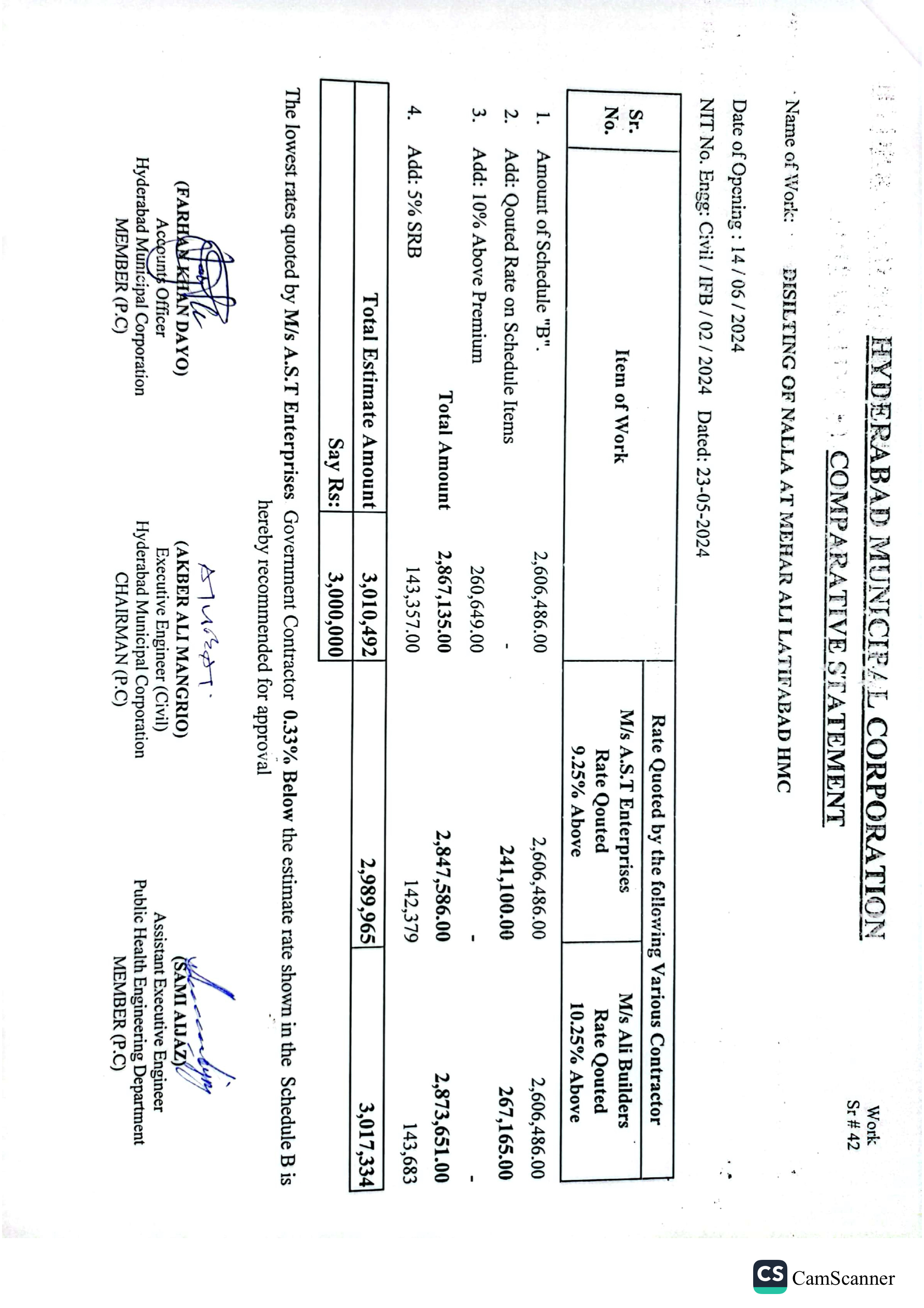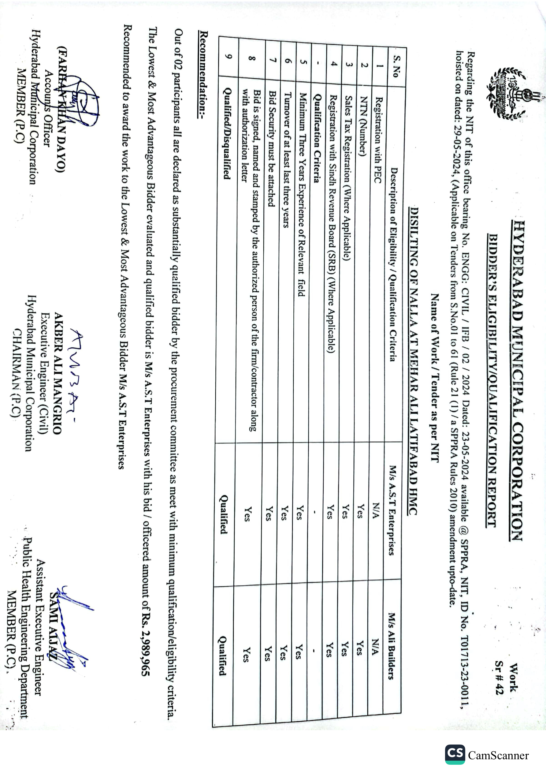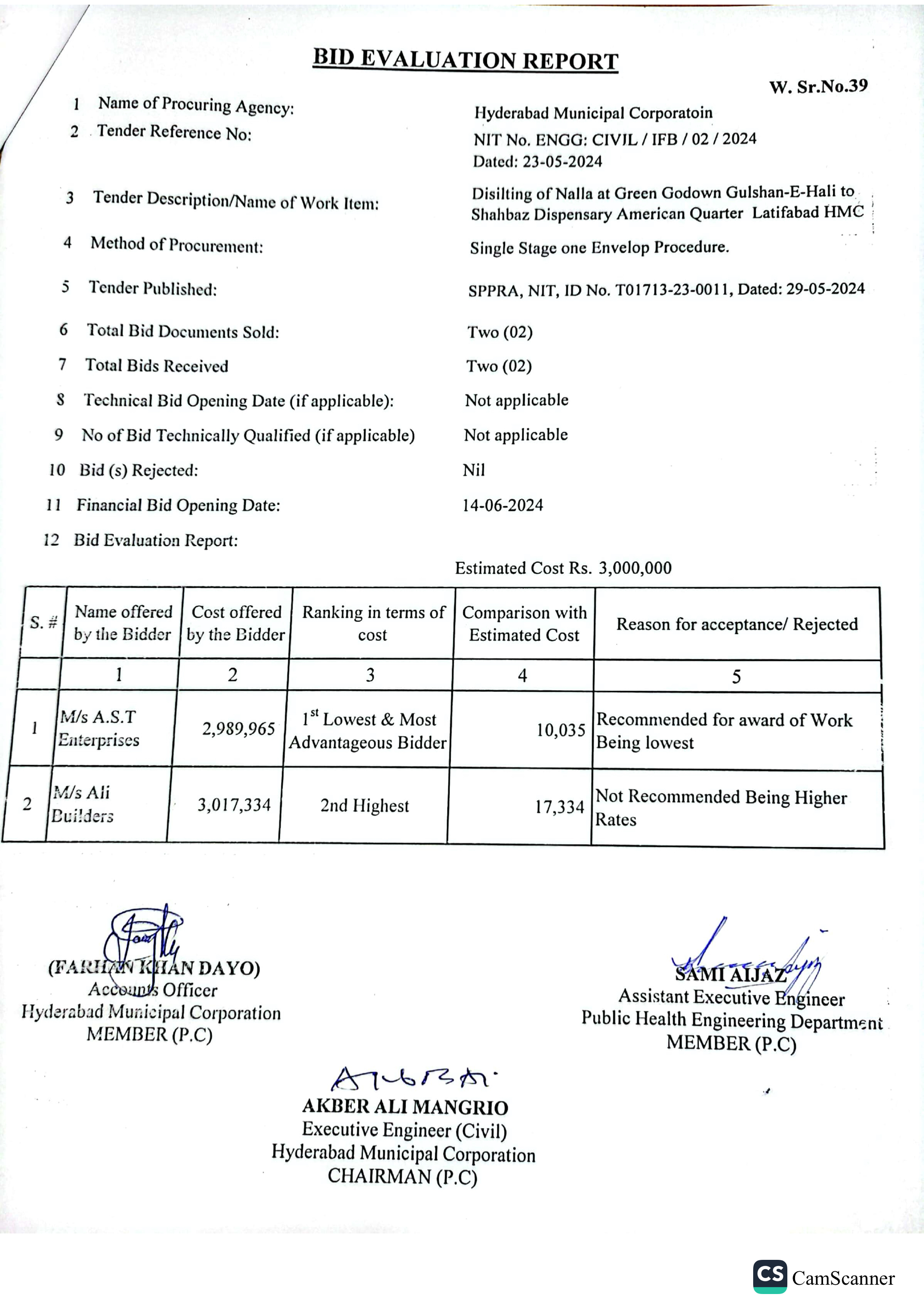 | T01713-23-0011 | BE01713-23-00011-39 | 39 DISILTING OF NALLA AT GREEN GODOWN GULSHAN-E-HALI TO SHAHBAZ DISPENSARY AMERICAN QUARTER LATIFABAD HMC | Office of Mayor Hyderabad Municipal Corporation Hyderabad (27-Local Government Department) | 26-06-2024 | Hyderabad | Active |