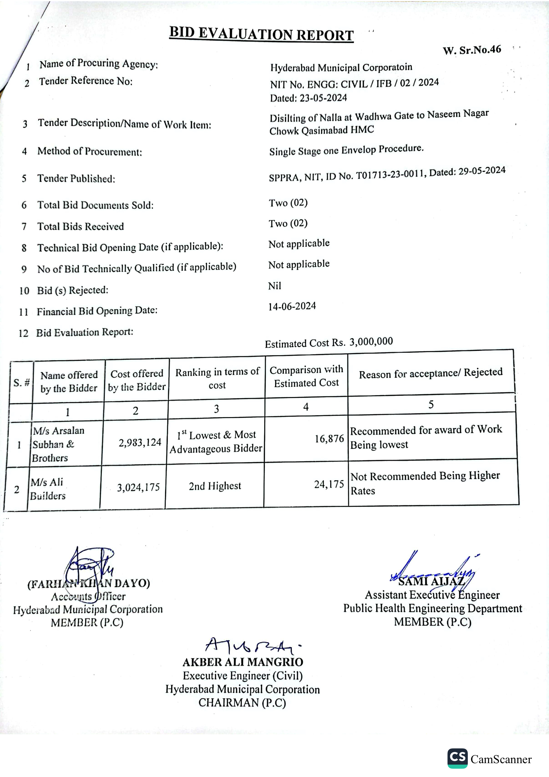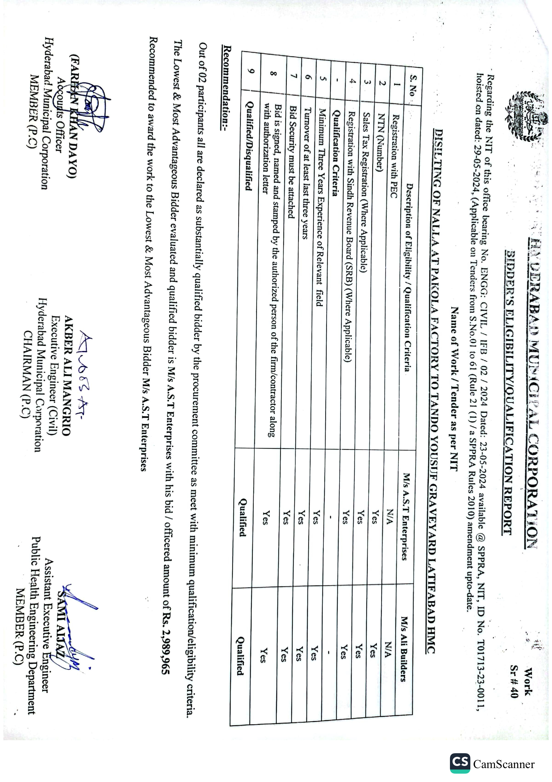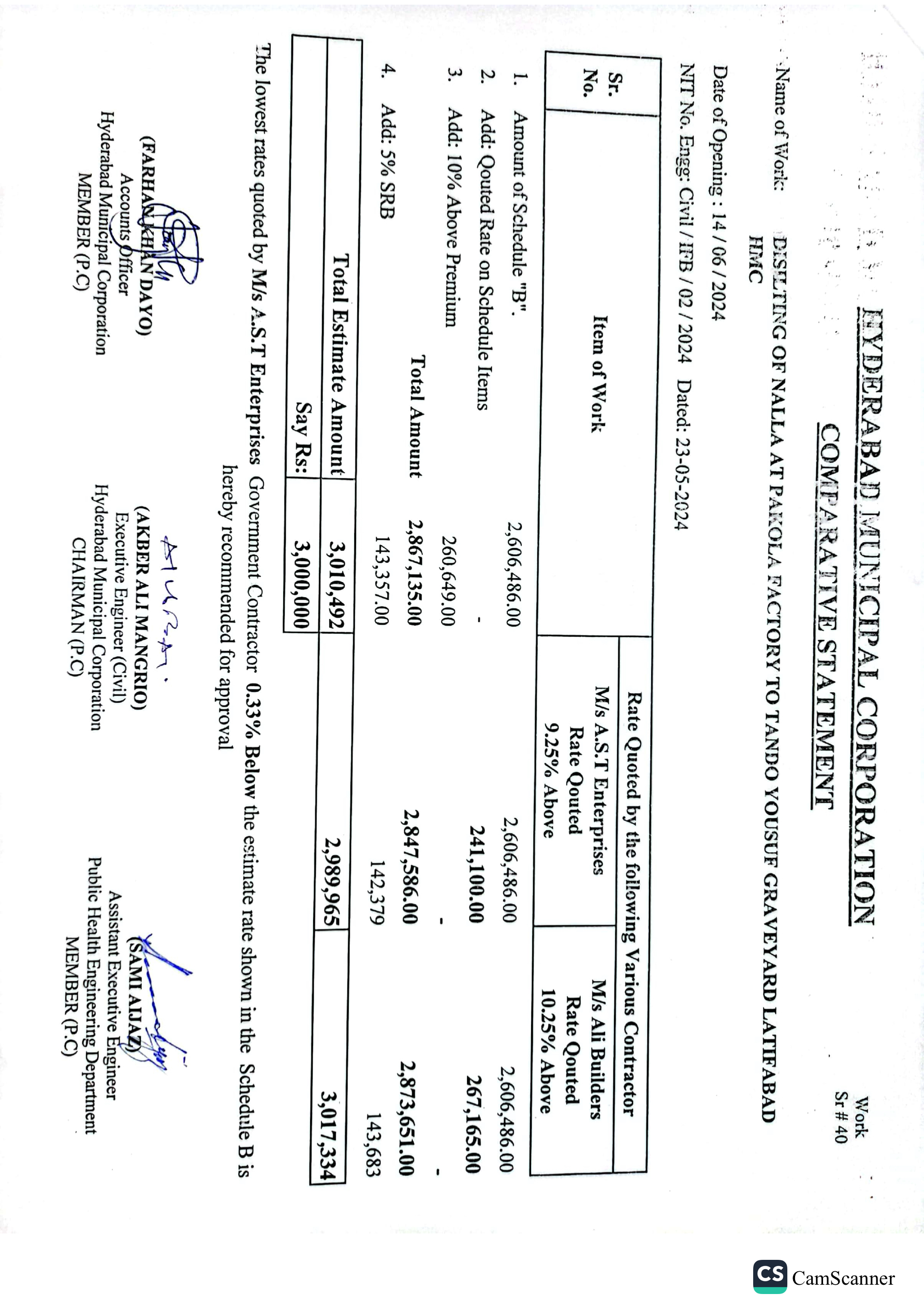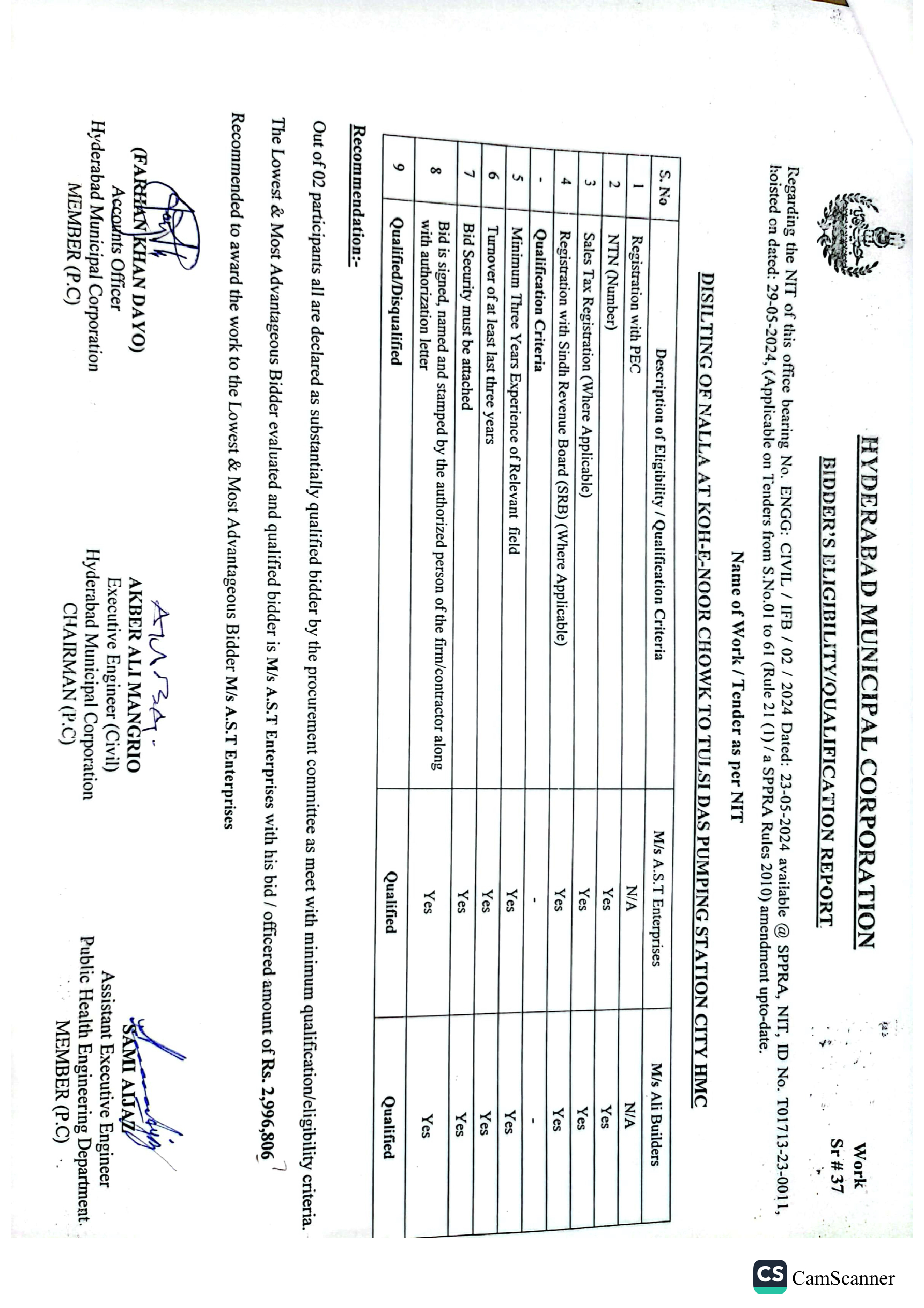 | T01713-23-0011 | BE01713-23-00011-39 | 39 DISILTING OF NALLA AT GREEN GODOWN GULSHAN-E-HALI TO SHAHBAZ DISPENSARY AMERICAN QUARTER LATIFABAD HMC | Office of Mayor Hyderabad Municipal Corporation Hyderabad (27-Local Government Department) | 26-06-2024 | Hyderabad | Active |