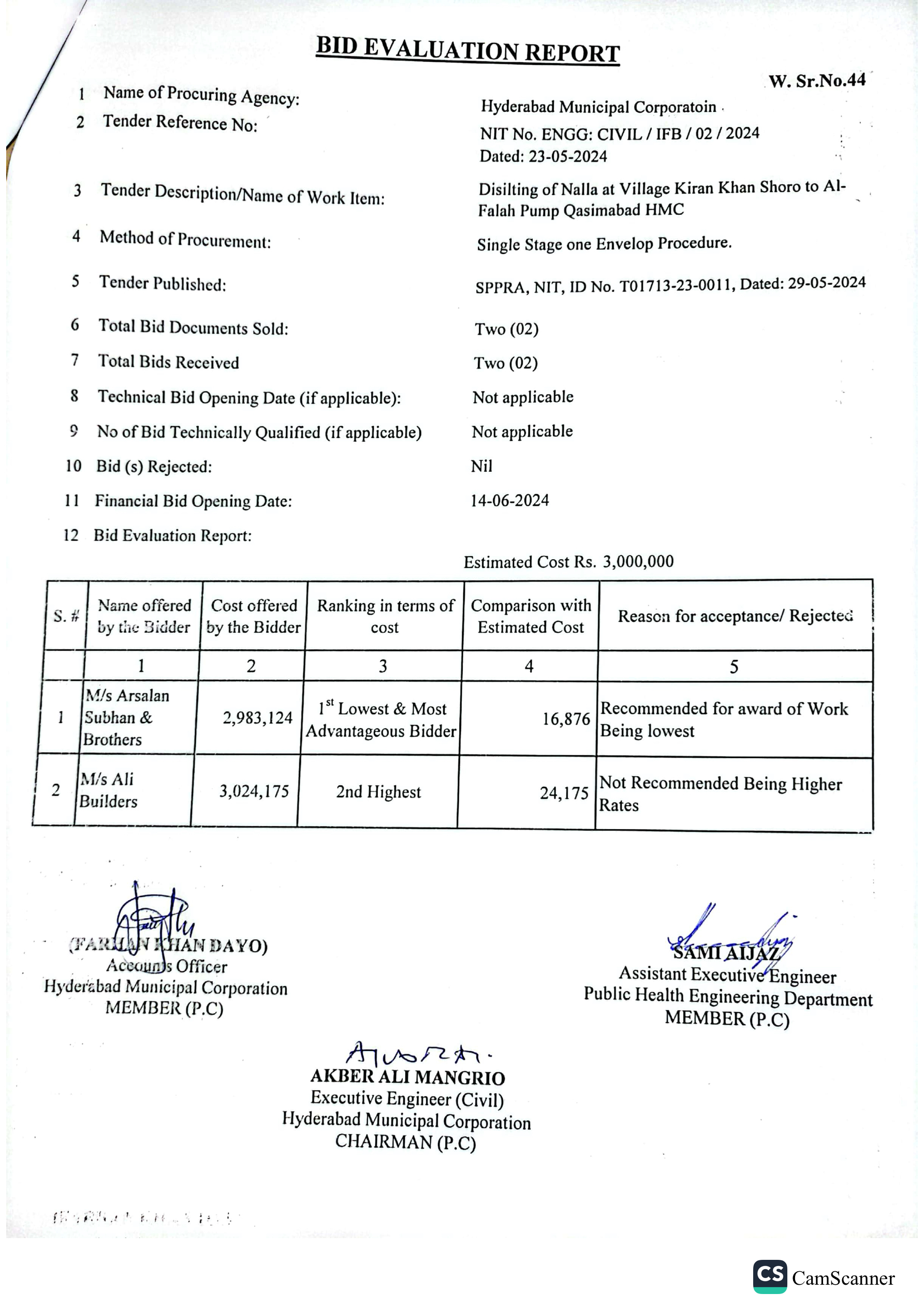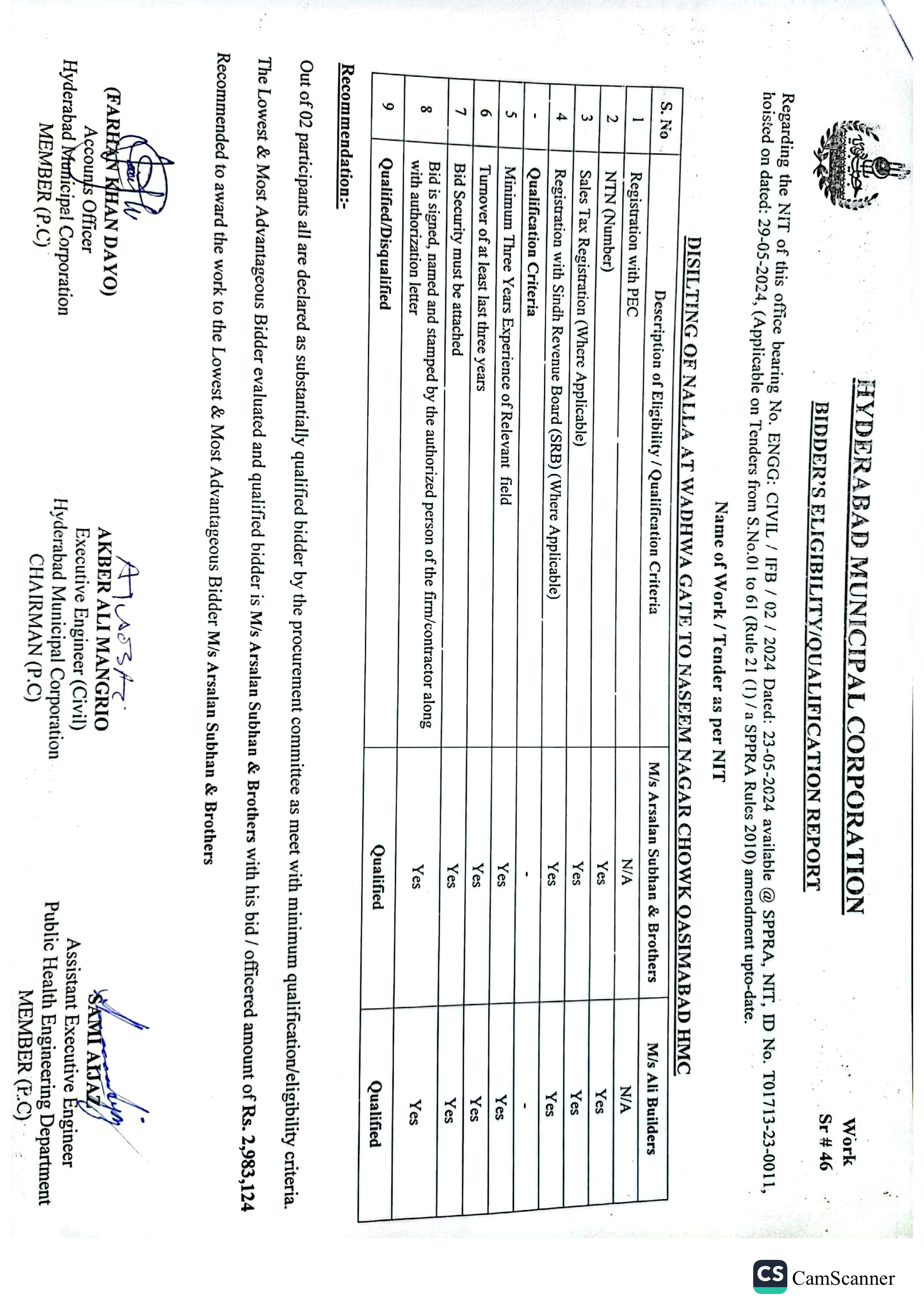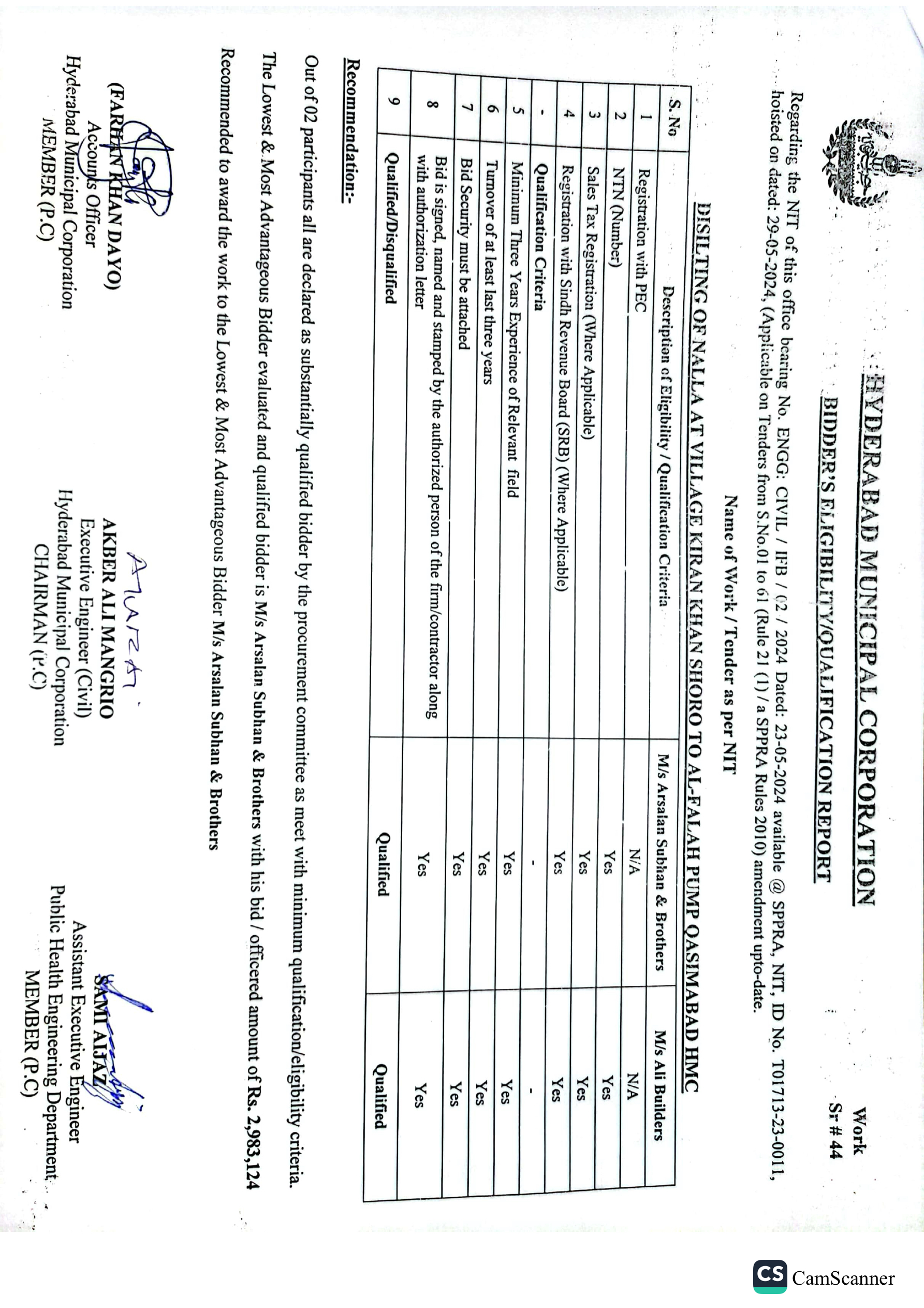 | T01713-23-0011 | BE01713-23-00011-44 | 44 DISILTING OF NALLA AT VILLAGE KIRAN KHAN SHORO TO AL-FALAH PUMP QASIMABAD HMC | Office of Mayor Hyderabad Municipal Corporation Hyderabad (27-Local Government Department) | 26-06-2024 | Hyderabad | Active |