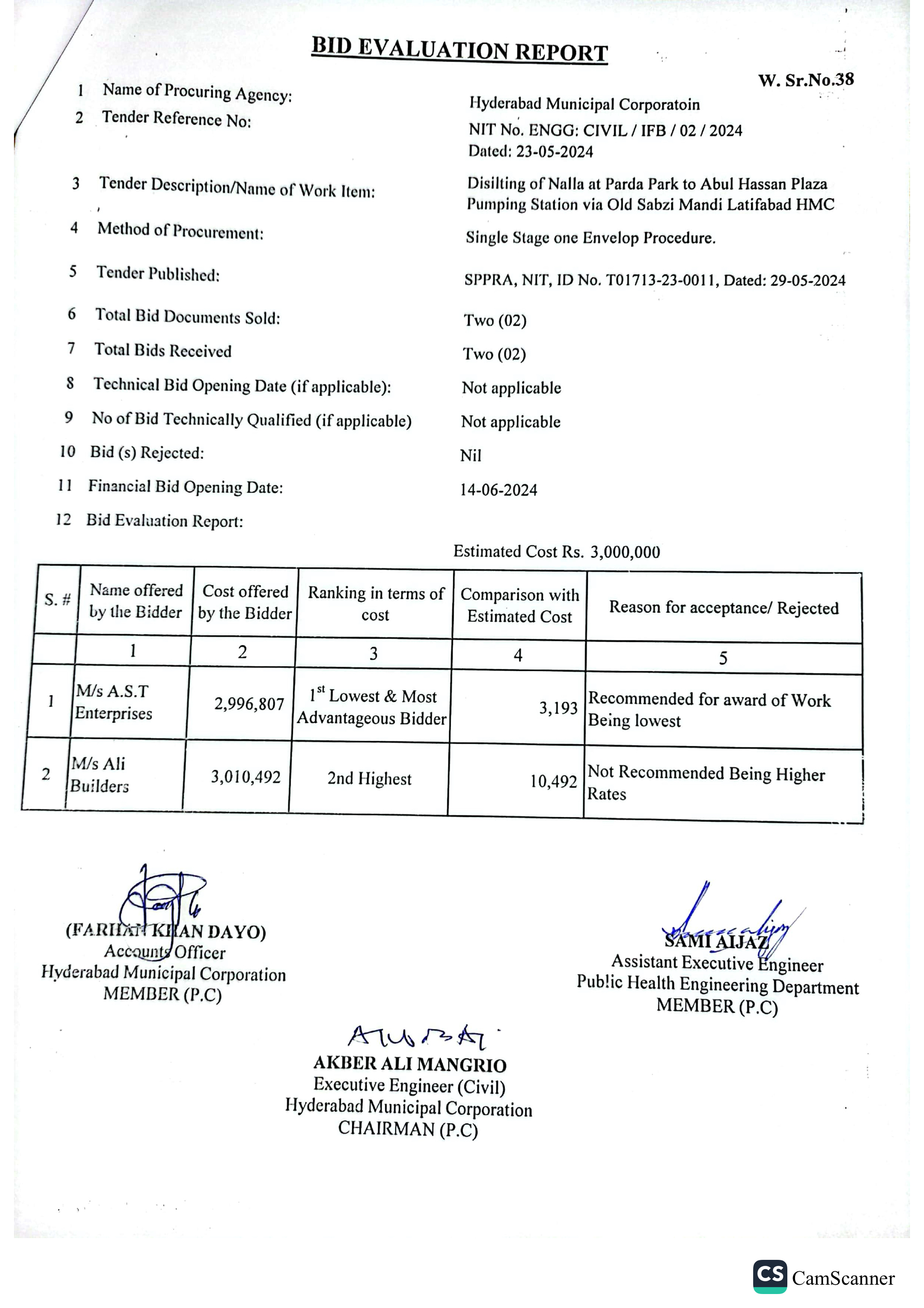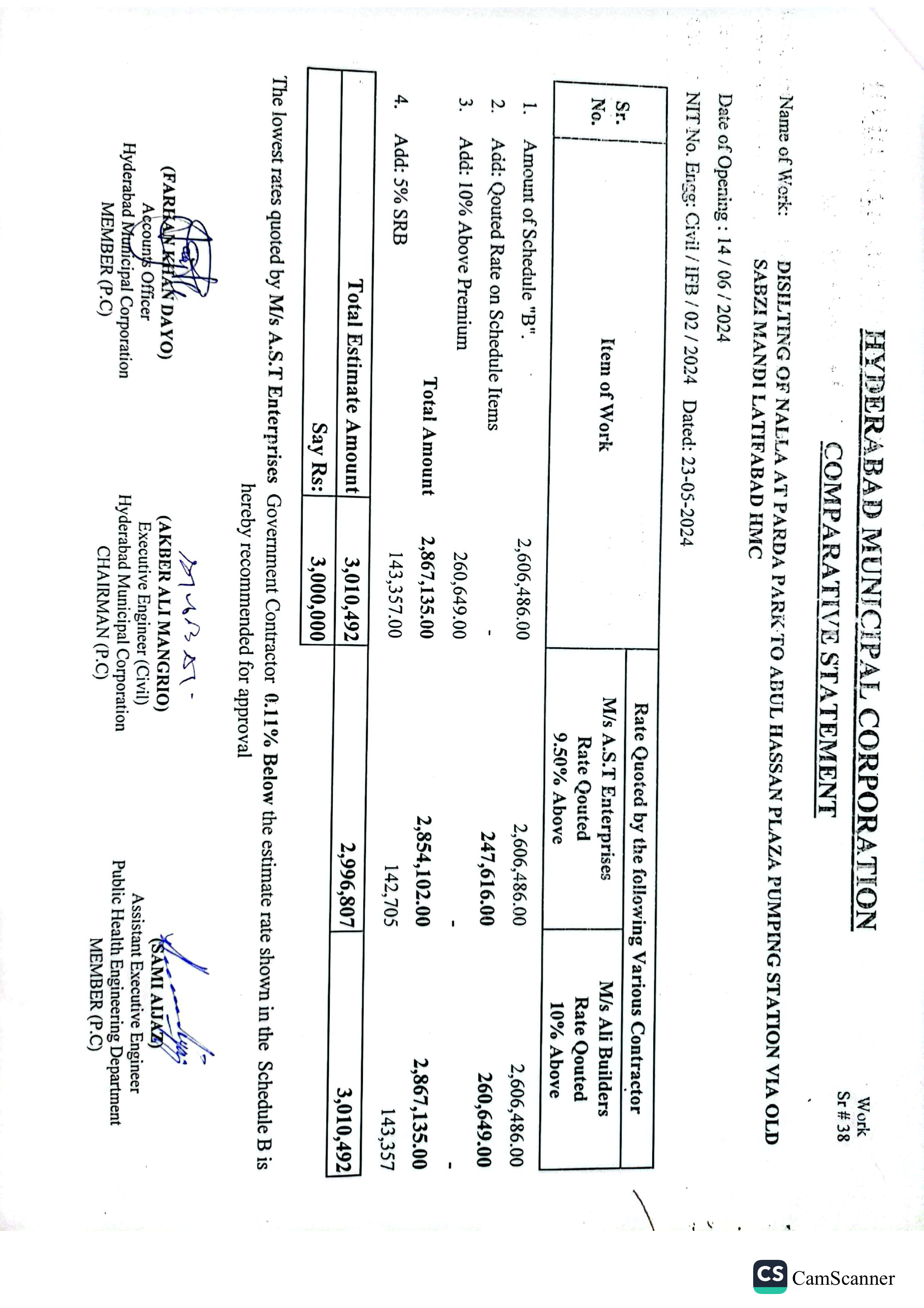 | T01713-23-0011 | BE01713-23-00011-38 | 38 DISILTING OF NALLA AT PARDA PARK TO ABUL HASSAN PLAZA PUMPING STATION VIA OLD SABZI MANDI LATIFABAD HMC | Office of Mayor Hyderabad Municipal Corporation Hyderabad (27-Local Government Department) | 26-06-2024 | Hyderabad | Active |