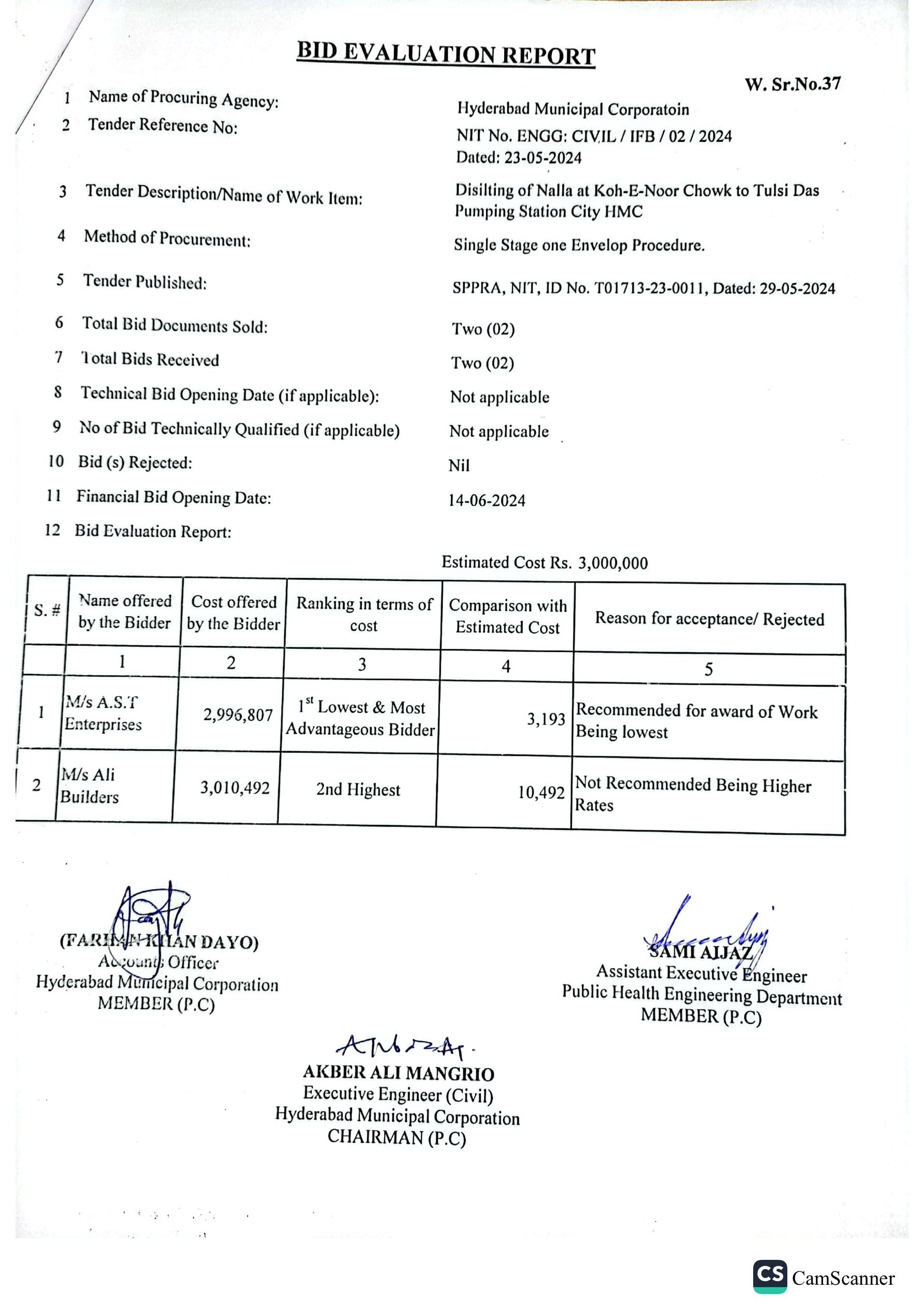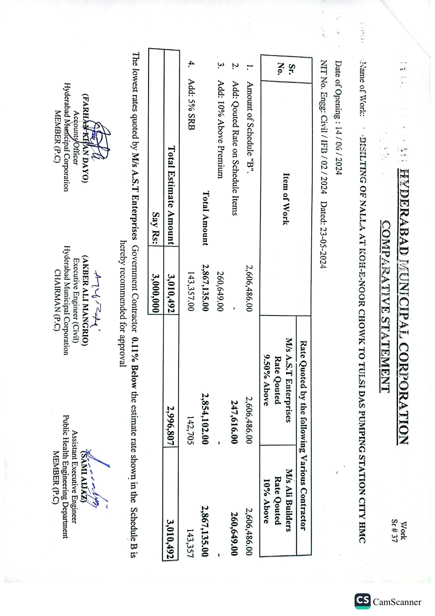 | T01713-23-0011 | BE01713-23-00011-37 | 37 DISILTING OF NALLA AT KOH-E-NOOR CHOWK TO TULSI DAS PUMPING STATION CITY HMC | Office of Mayor Hyderabad Municipal Corporation Hyderabad (27-Local Government Department) | 26-06-2024 | Hyderabad | Active |