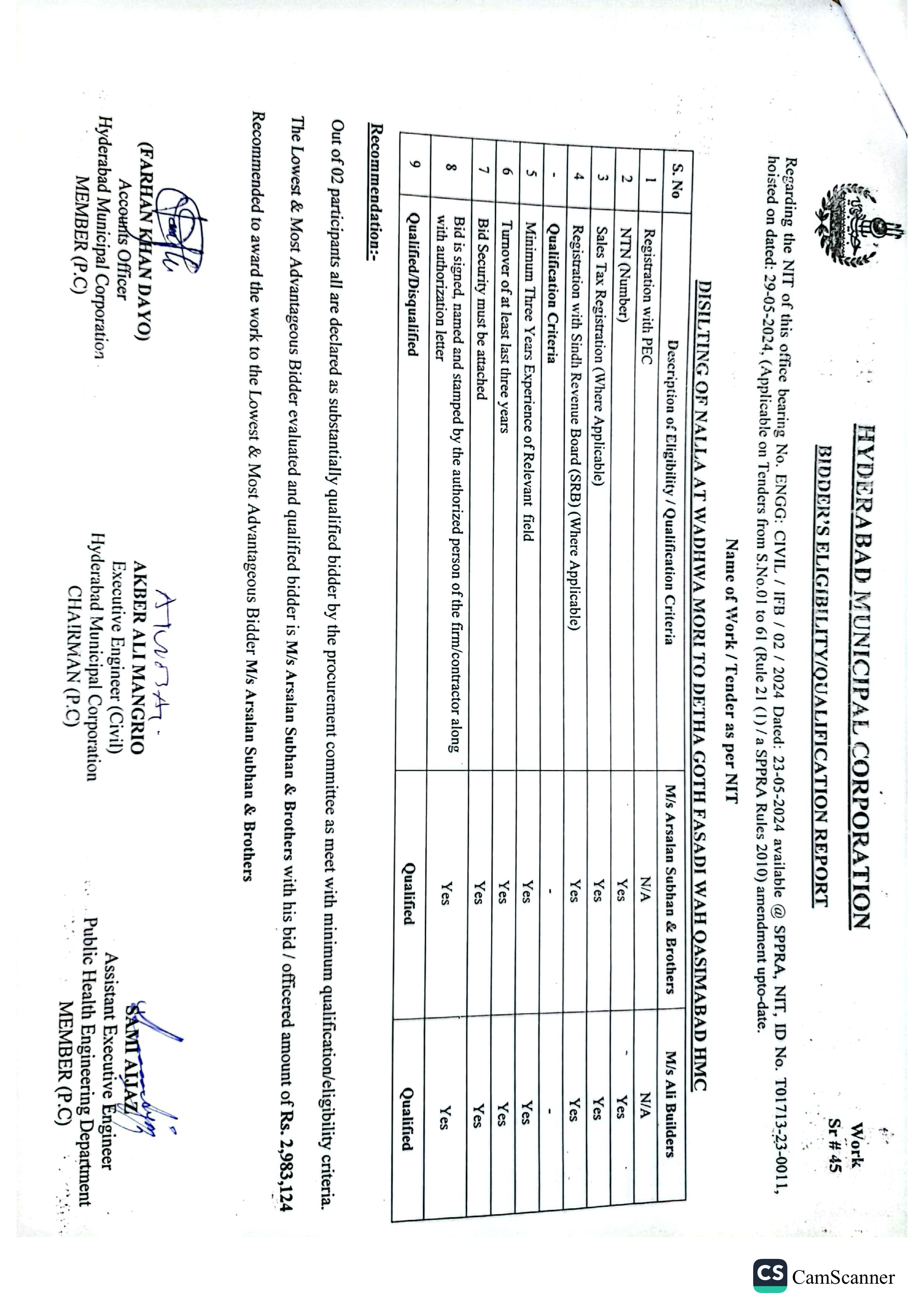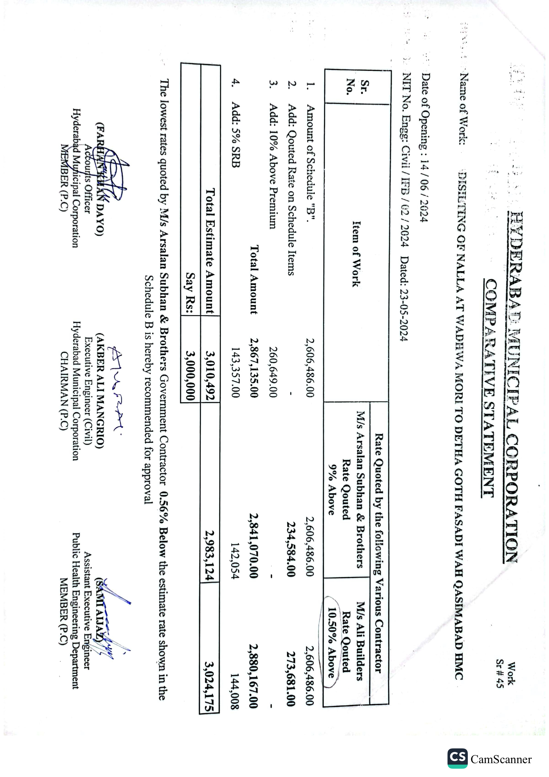 | T01713-23-0011 | BE01713-23-00011-45 | 45 DISILTING OF NALLA AT WADHWA MORI TO DETHA GOTH FASADI WAH QASIMABAD HMC | Office of Mayor Hyderabad Municipal Corporation Hyderabad (27-Local Government Department) | 26-06-2024 | Hyderabad | Active |