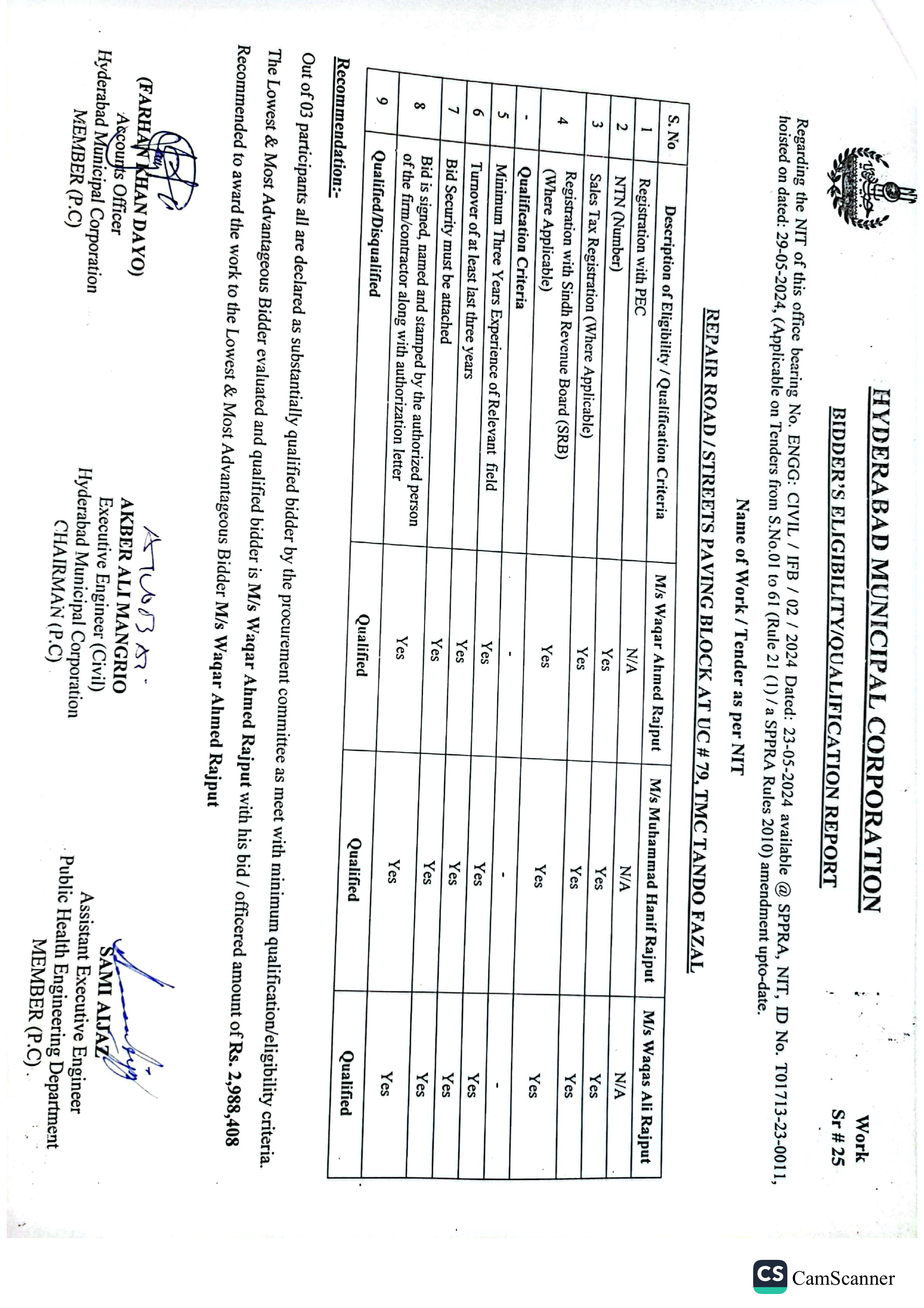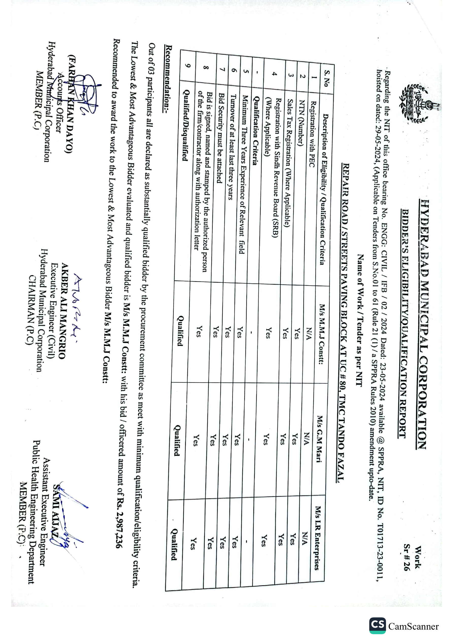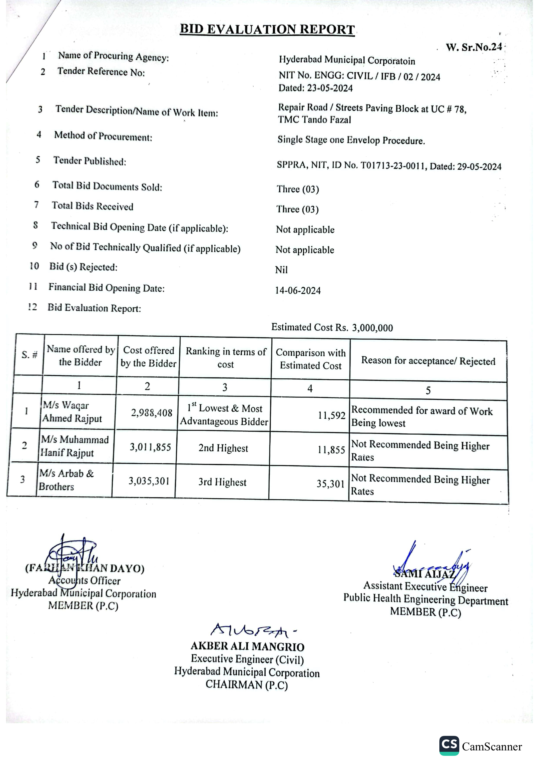 | T01713-23-0011 | BE01713-23-00011-23 | 23 REPAIR ROAD / STREETS PAVING BLOCK AT UC # 77, TMC TANDO FAZAL | Office of Mayor Hyderabad Municipal Corporation Hyderabad (27-Local Government Department) | 25-06-2024 | Hyderabad | Active |