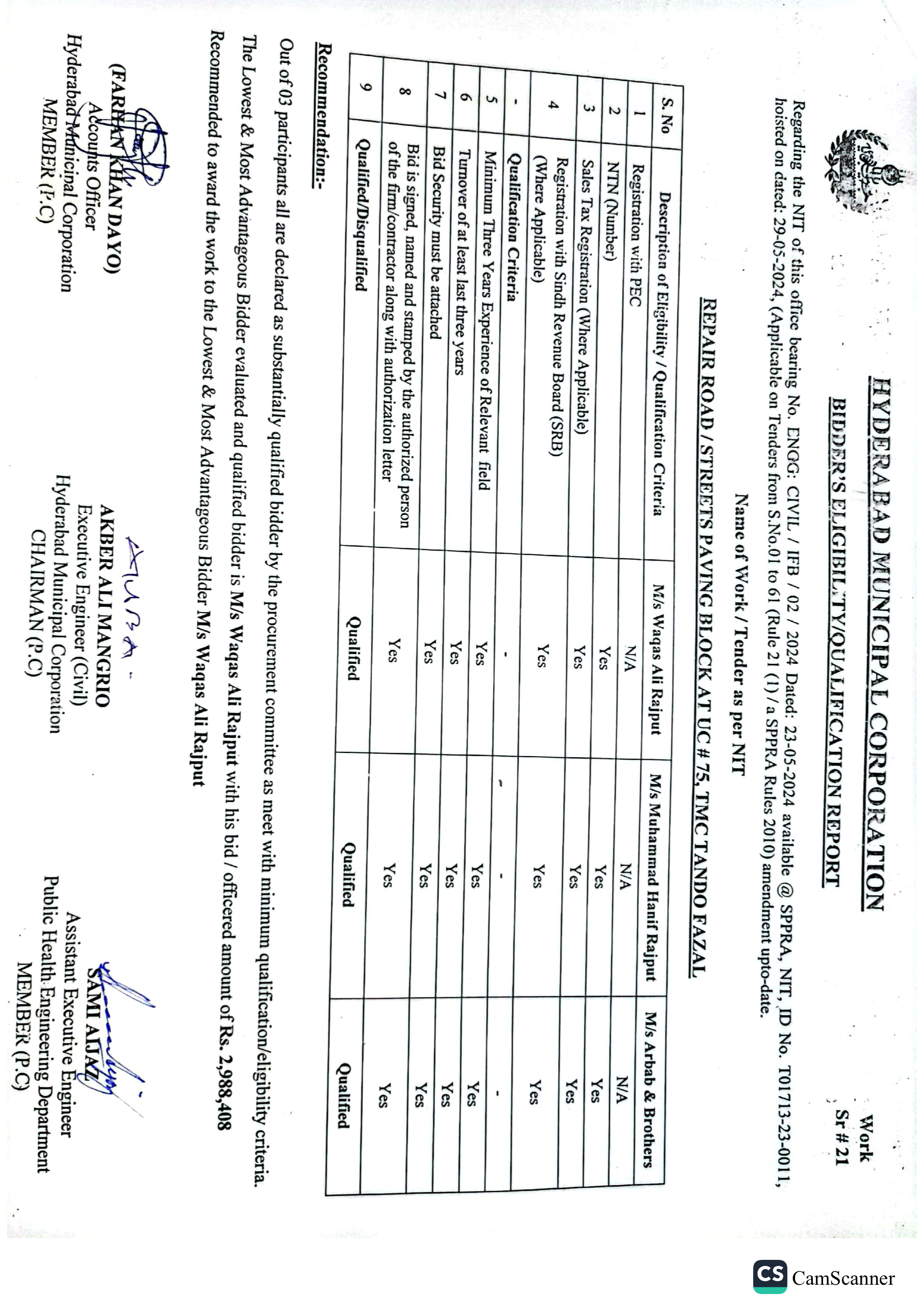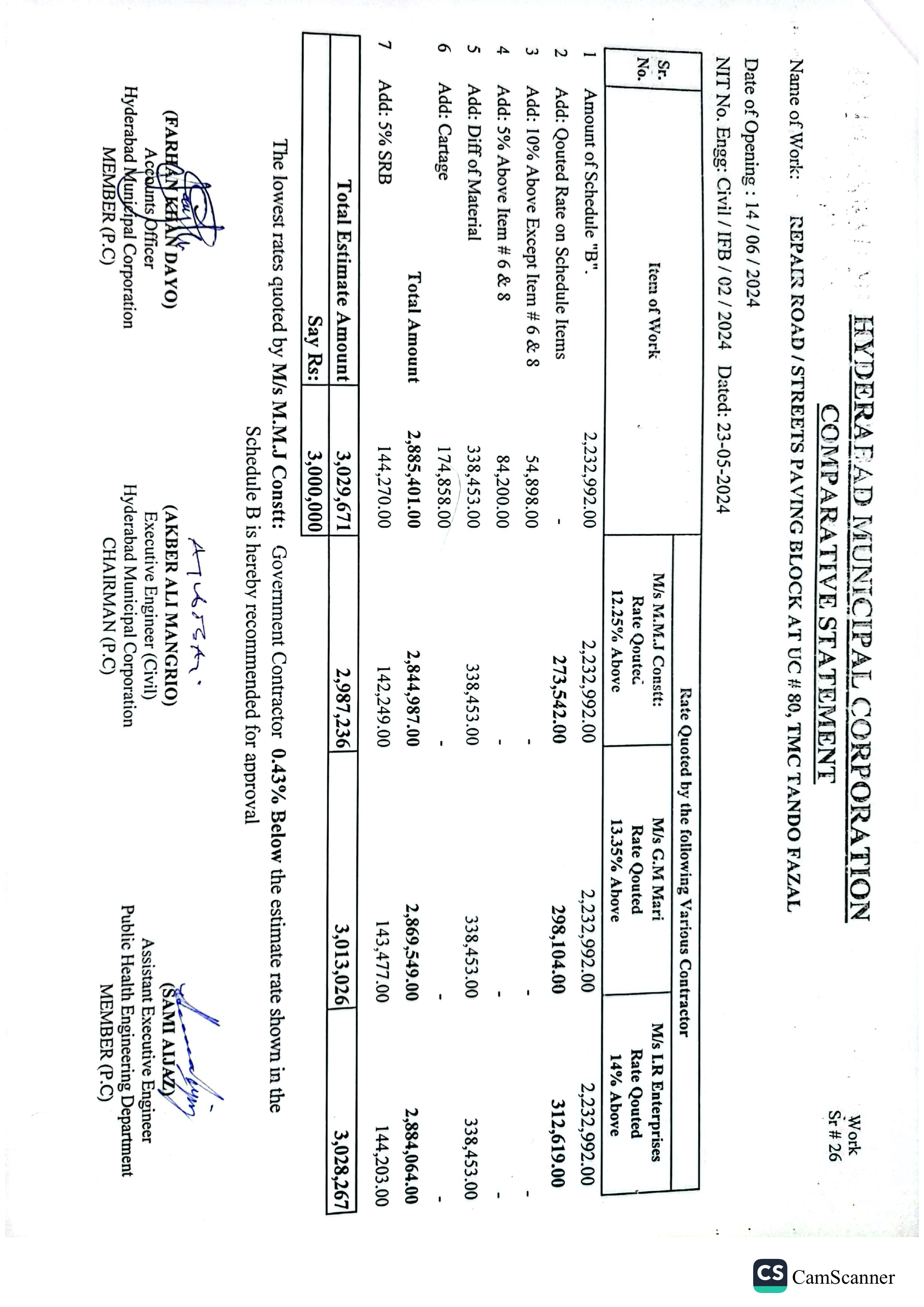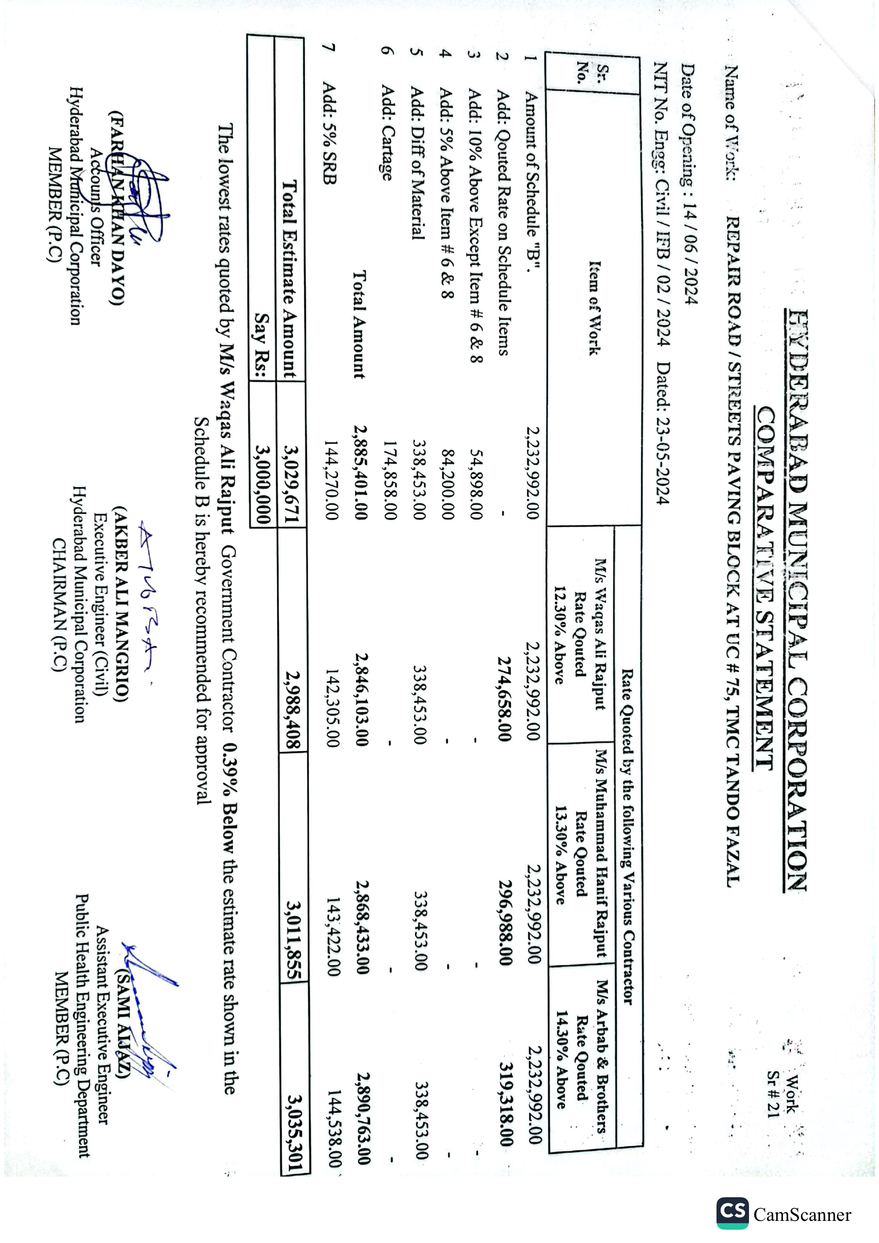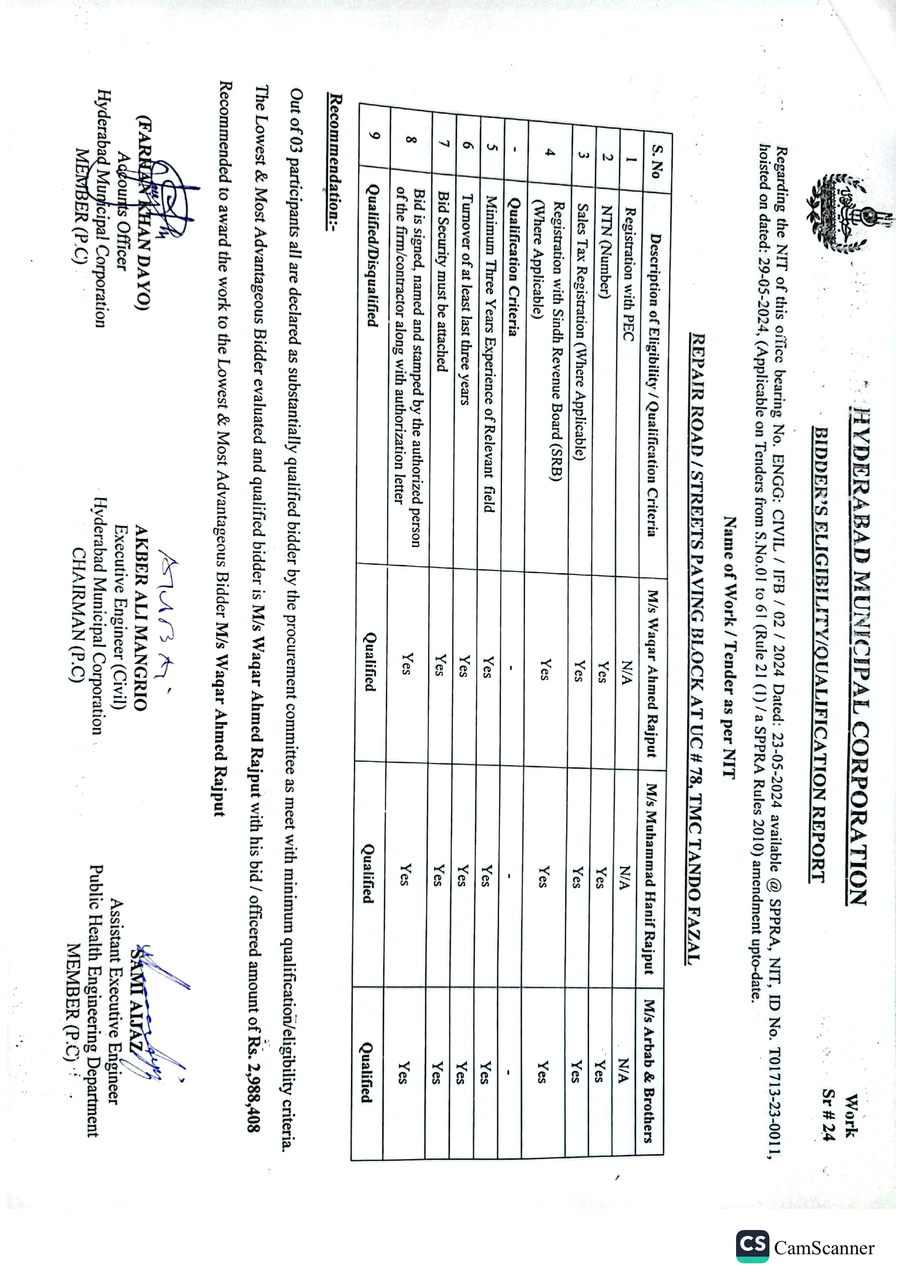 | T01713-23-0011 | BE01713-23-00011-23 | 23 REPAIR ROAD / STREETS PAVING BLOCK AT UC # 77, TMC TANDO FAZAL | Office of Mayor Hyderabad Municipal Corporation Hyderabad (27-Local Government Department) | 25-06-2024 | Hyderabad | Active |