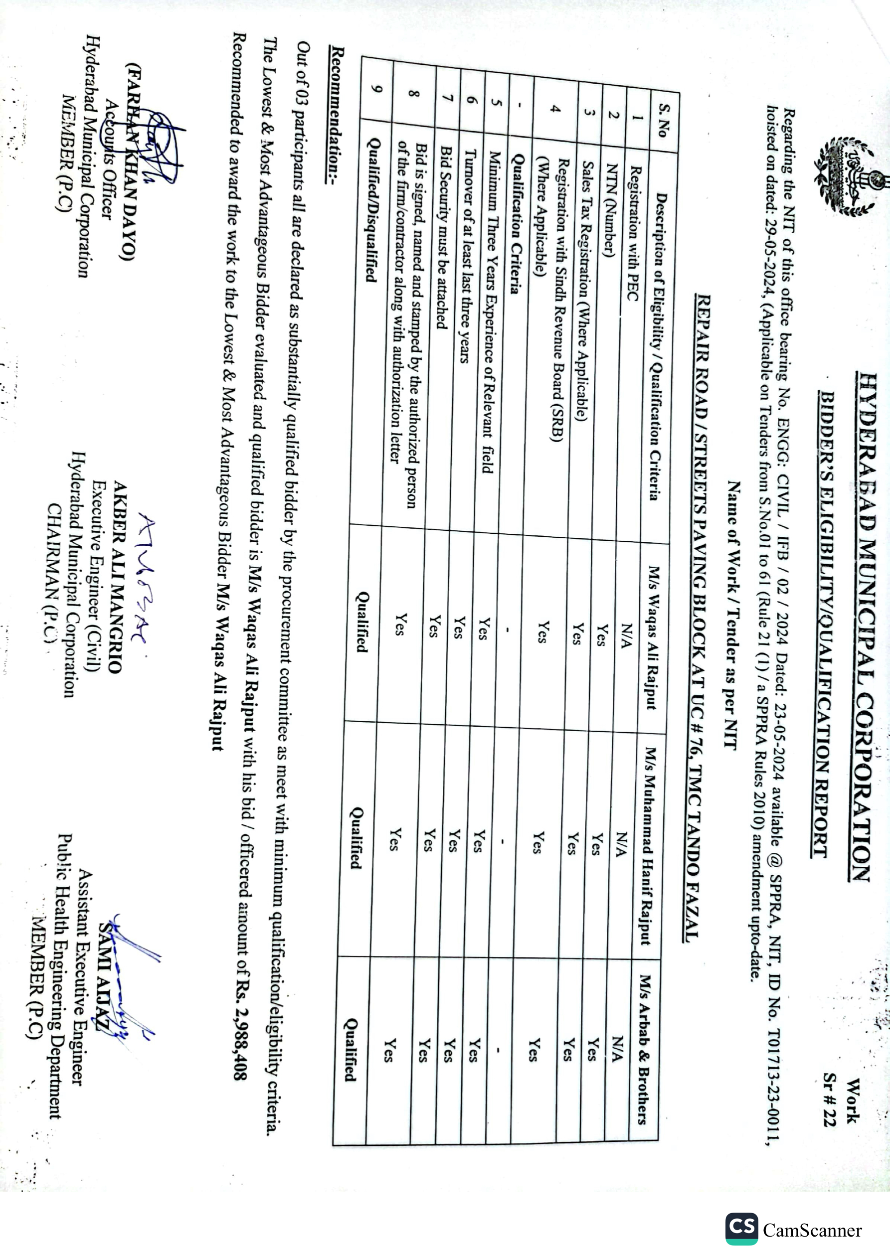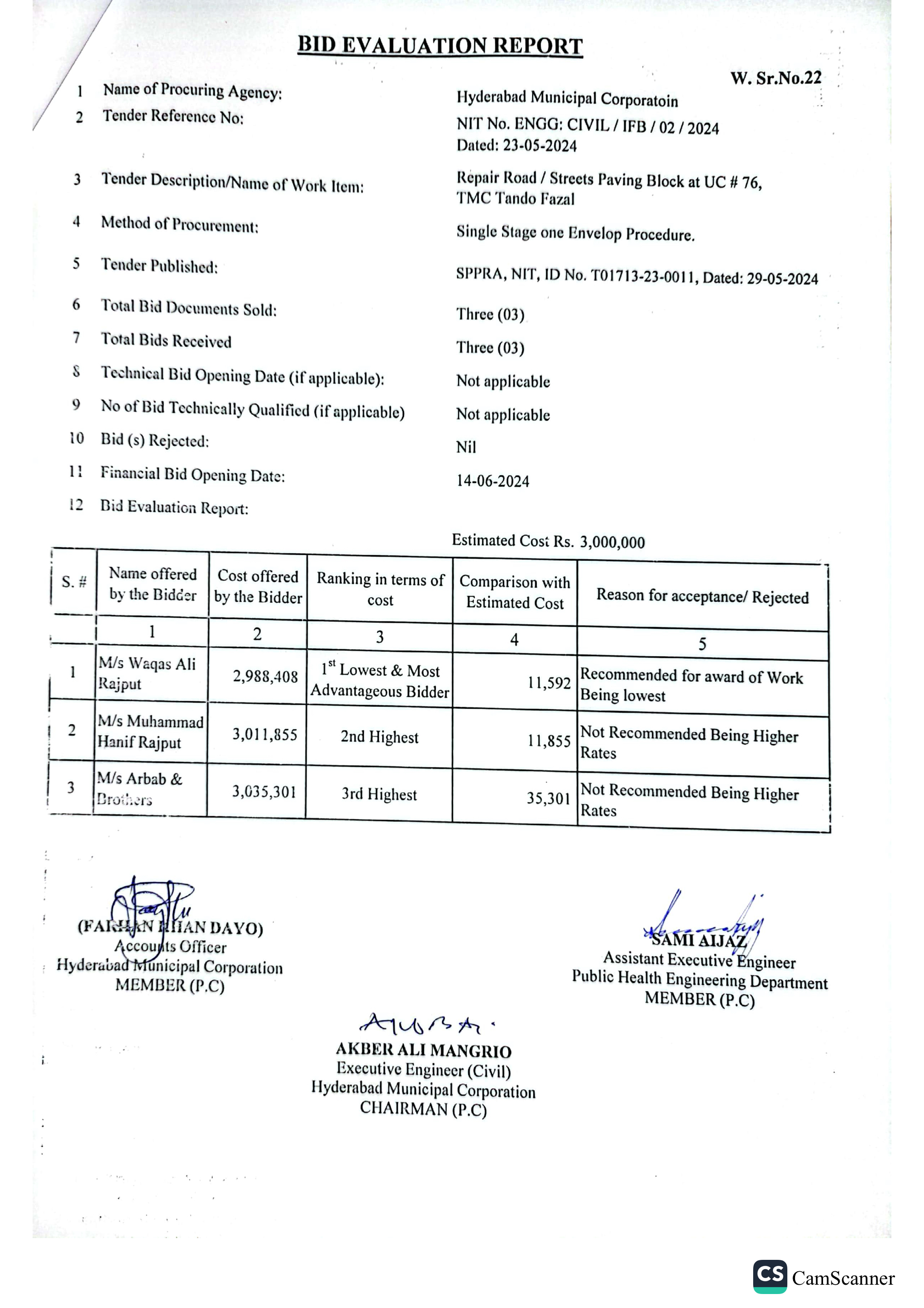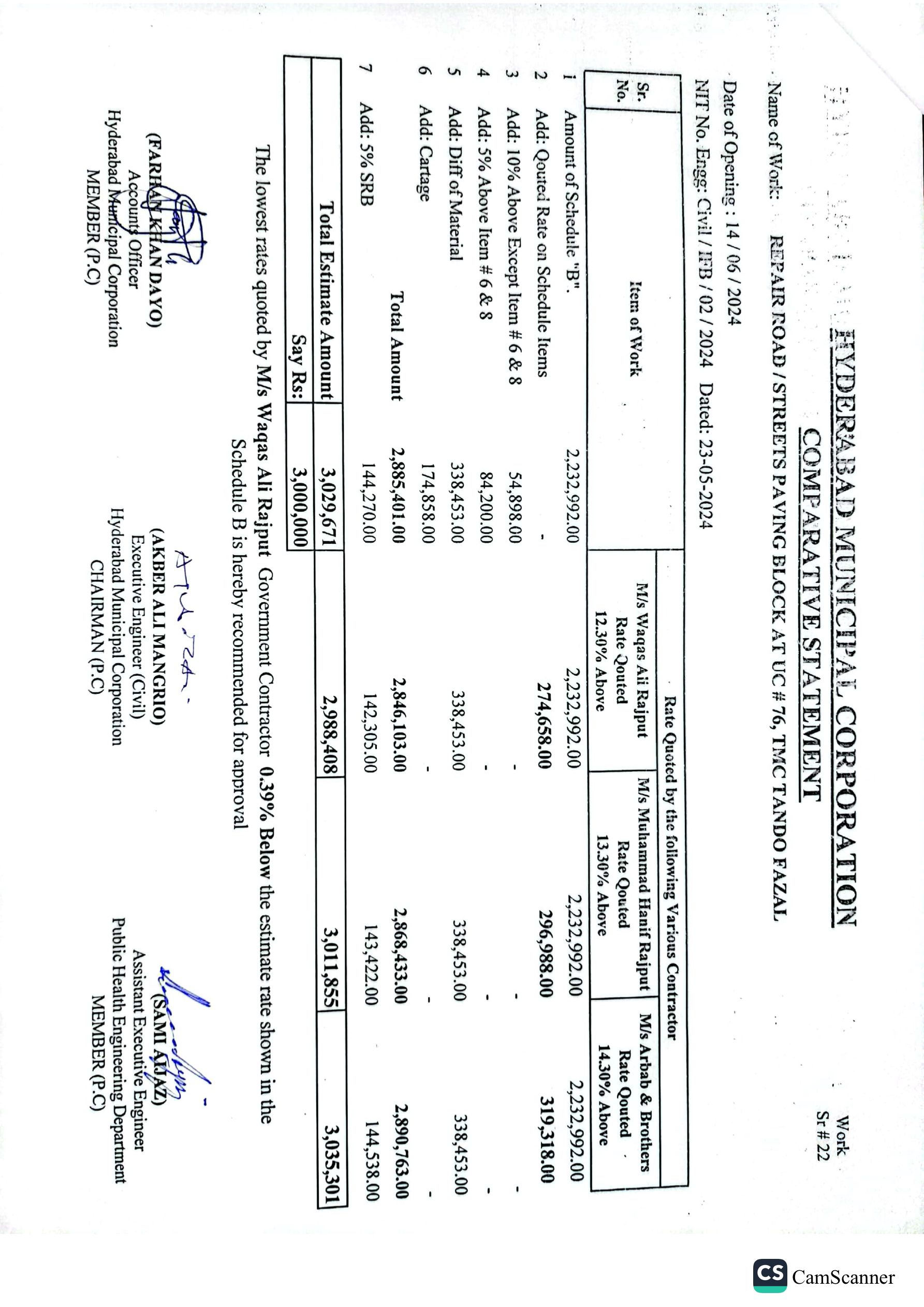| T01713-23-0011 | BE01713-23-00011-22 | 22 REPAIR ROAD / STREETS PAVING BLOCK AT UC # 76, TMC TANDO FAZAL | Office of Mayor Hyderabad Municipal Corporation Hyderabad (27-Local Government Department) | 25-06-2024 | Hyderabad | Active |