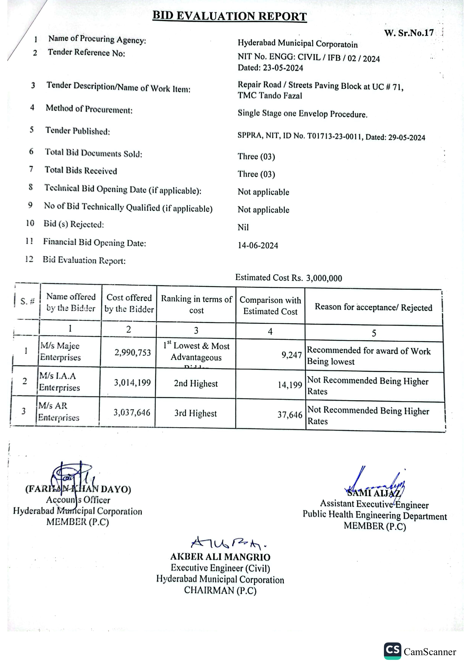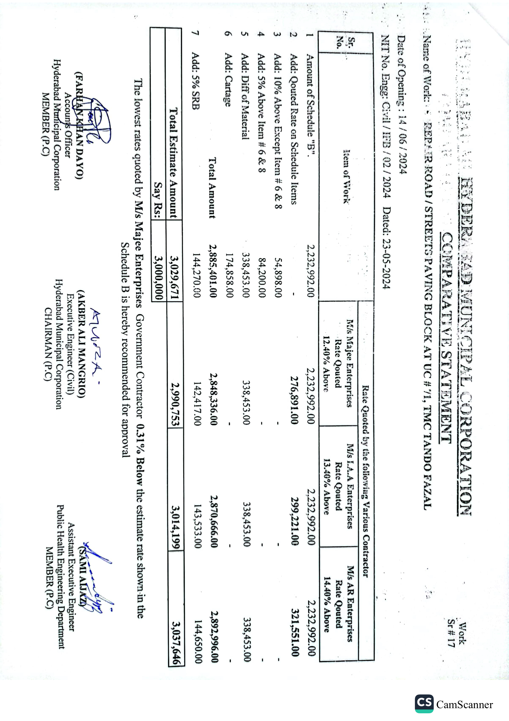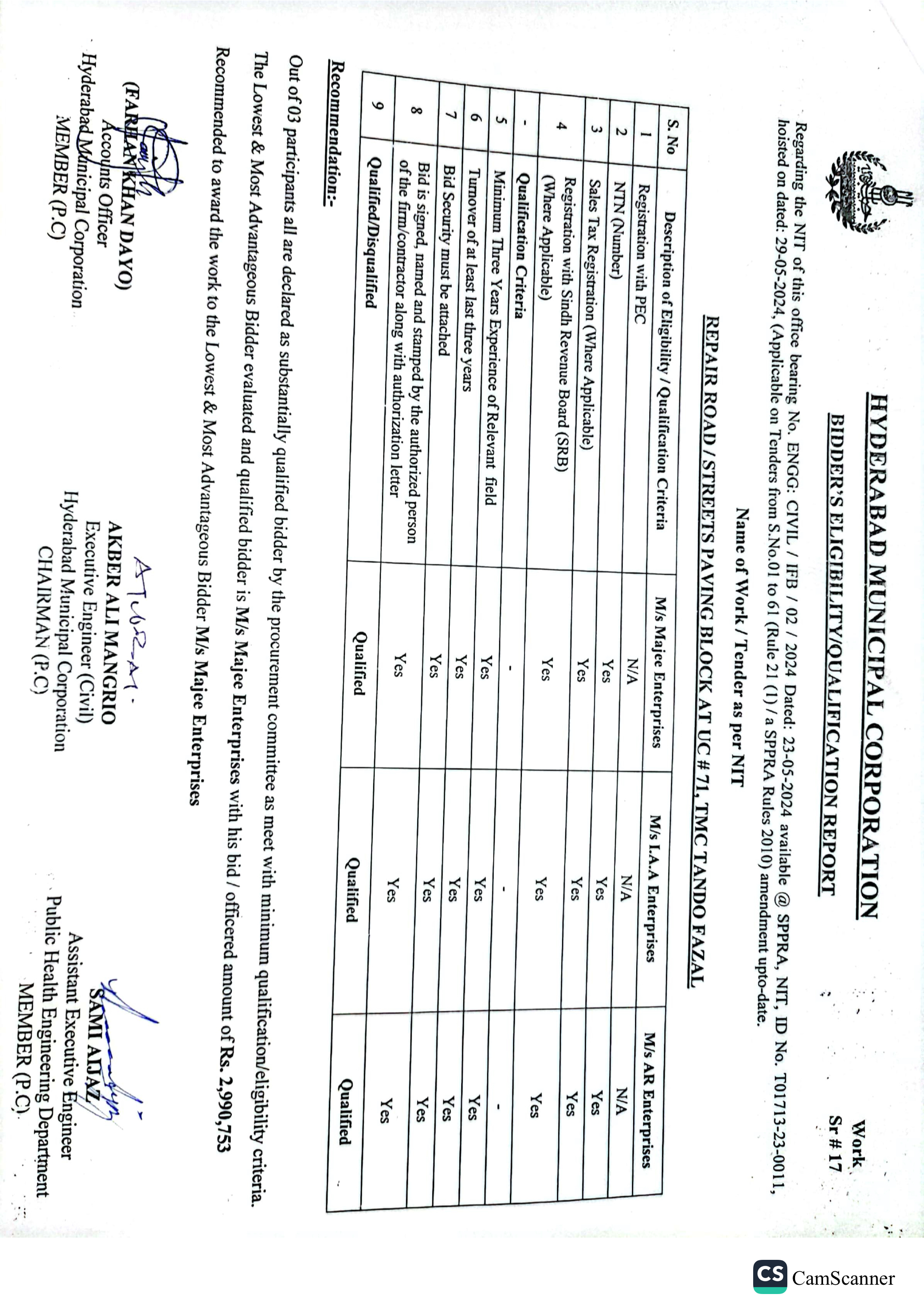 | T01713-23-0011 | BE01713-23-00011-17 | 17 REPAIR ROAD / STREETS PAVING BLOCK AT UC # 71, TMC TANDO FAZAL | Office of Mayor Hyderabad Municipal Corporation Hyderabad (27-Local Government Department) | 25-06-2024 | Hyderabad | Active |