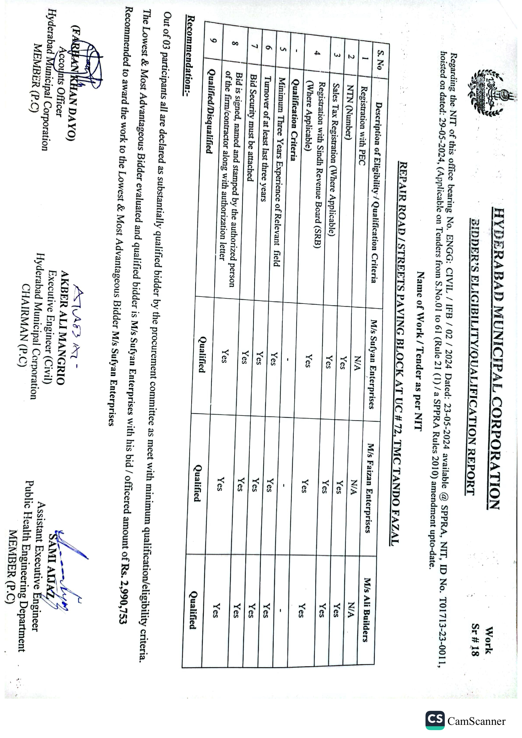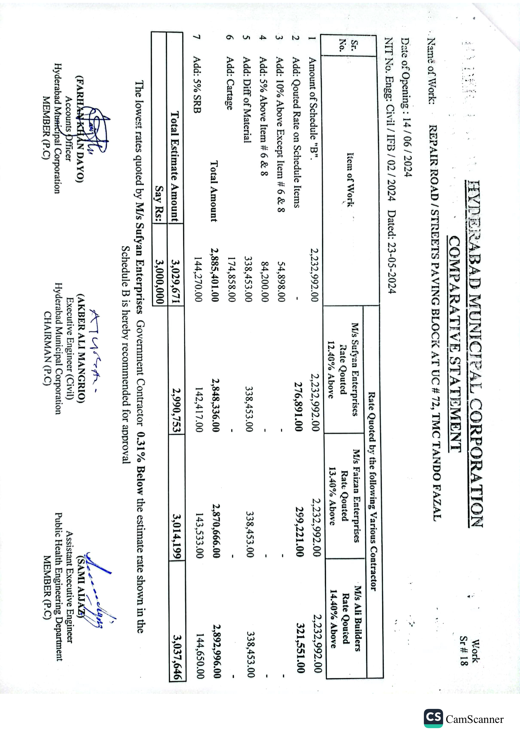 | T01713-23-0011 | BE01713-23-00011-18 | 18 REPAIR ROAD / STREETS PAVING BLOCK AT UC # 72, TMC TANDO FAZAL | Office of Mayor Hyderabad Municipal Corporation Hyderabad (27-Local Government Department) | 25-06-2024 | Hyderabad | Active |