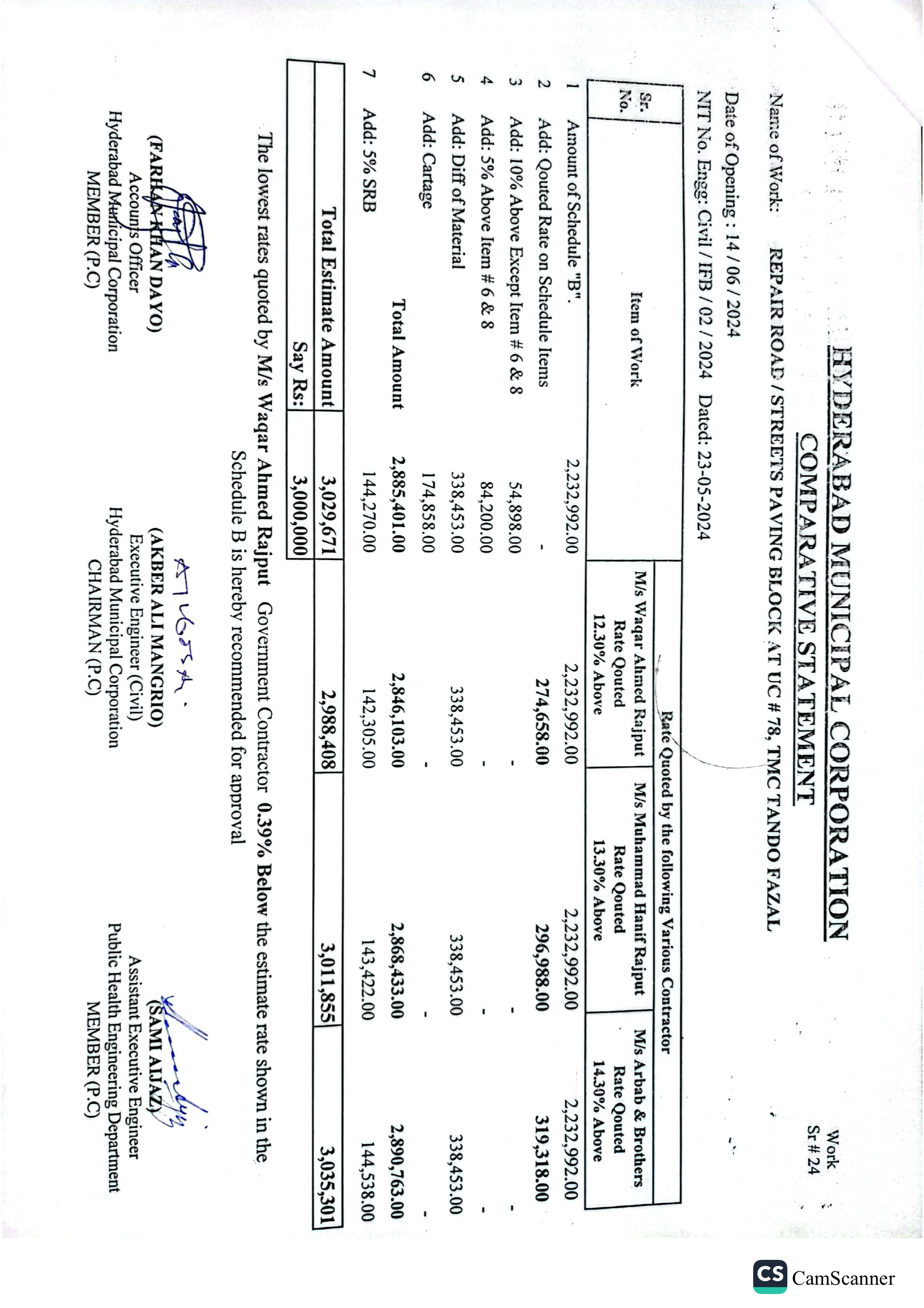 | T01713-23-0011 | BE01713-23-00011-24 | 24 REPAIR ROAD / STREETS PAVING BLOCK AT UC # 78, TMC TANDO FAZAL | Office of Mayor Hyderabad Municipal Corporation Hyderabad (27-Local Government Department) | 25-06-2024 | Hyderabad | Active |