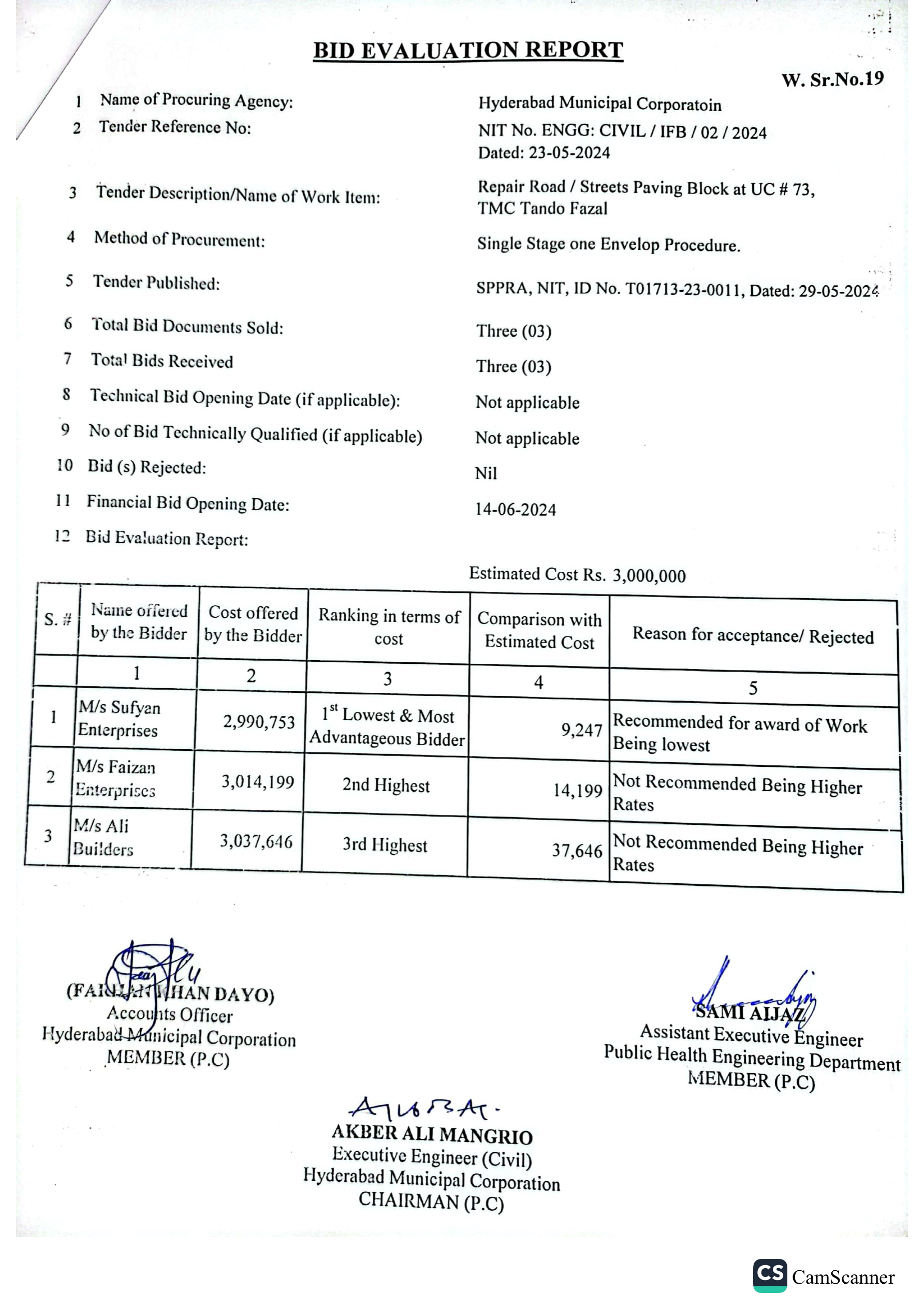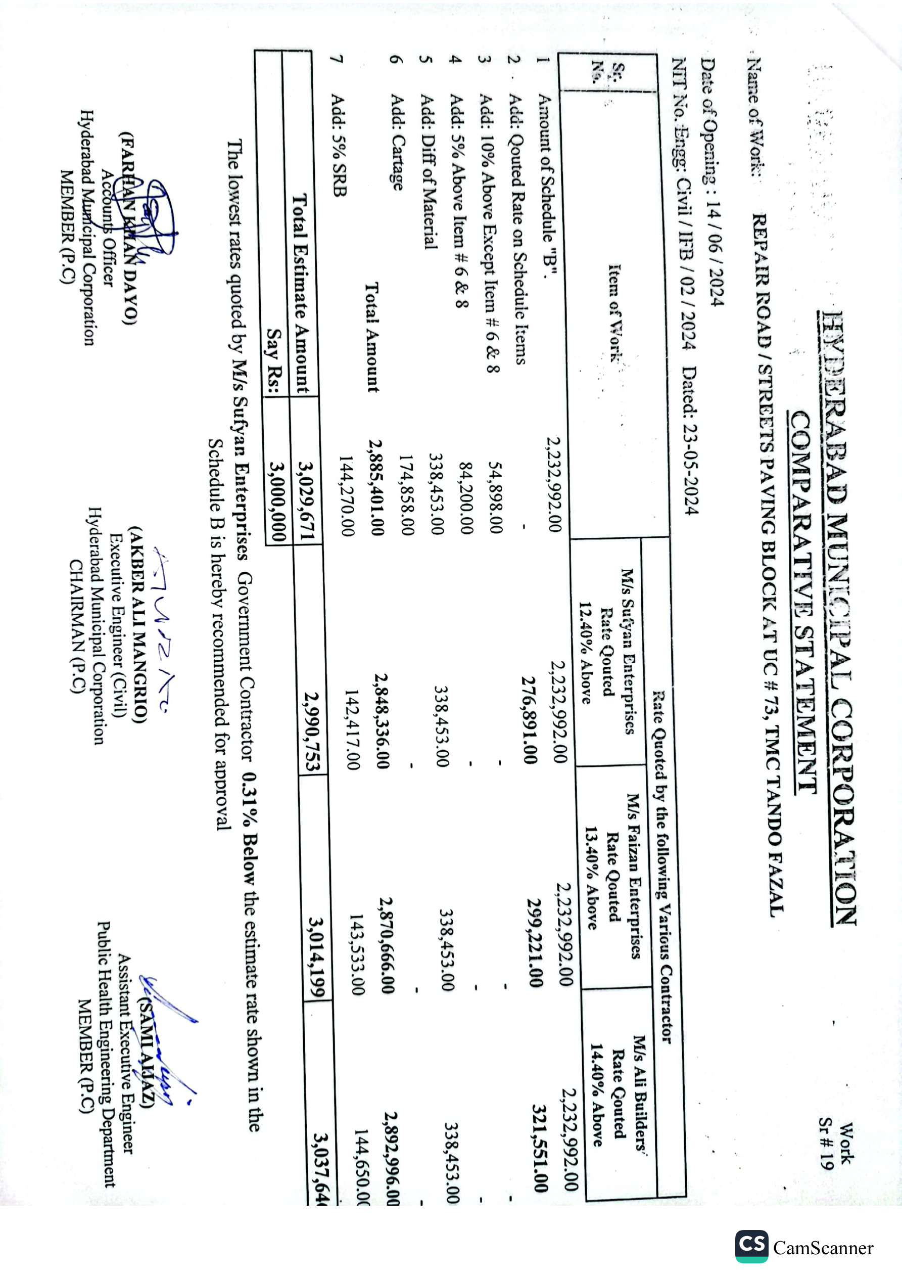 | T01713-23-0011 | BE01713-23-00011-19 | 19 REPAIR ROAD / STREETS PAVING BLOCK AT UC # 73, TMC TANDO FAZAL | Office of Mayor Hyderabad Municipal Corporation Hyderabad (27-Local Government Department) | 25-06-2024 | Hyderabad | Active |