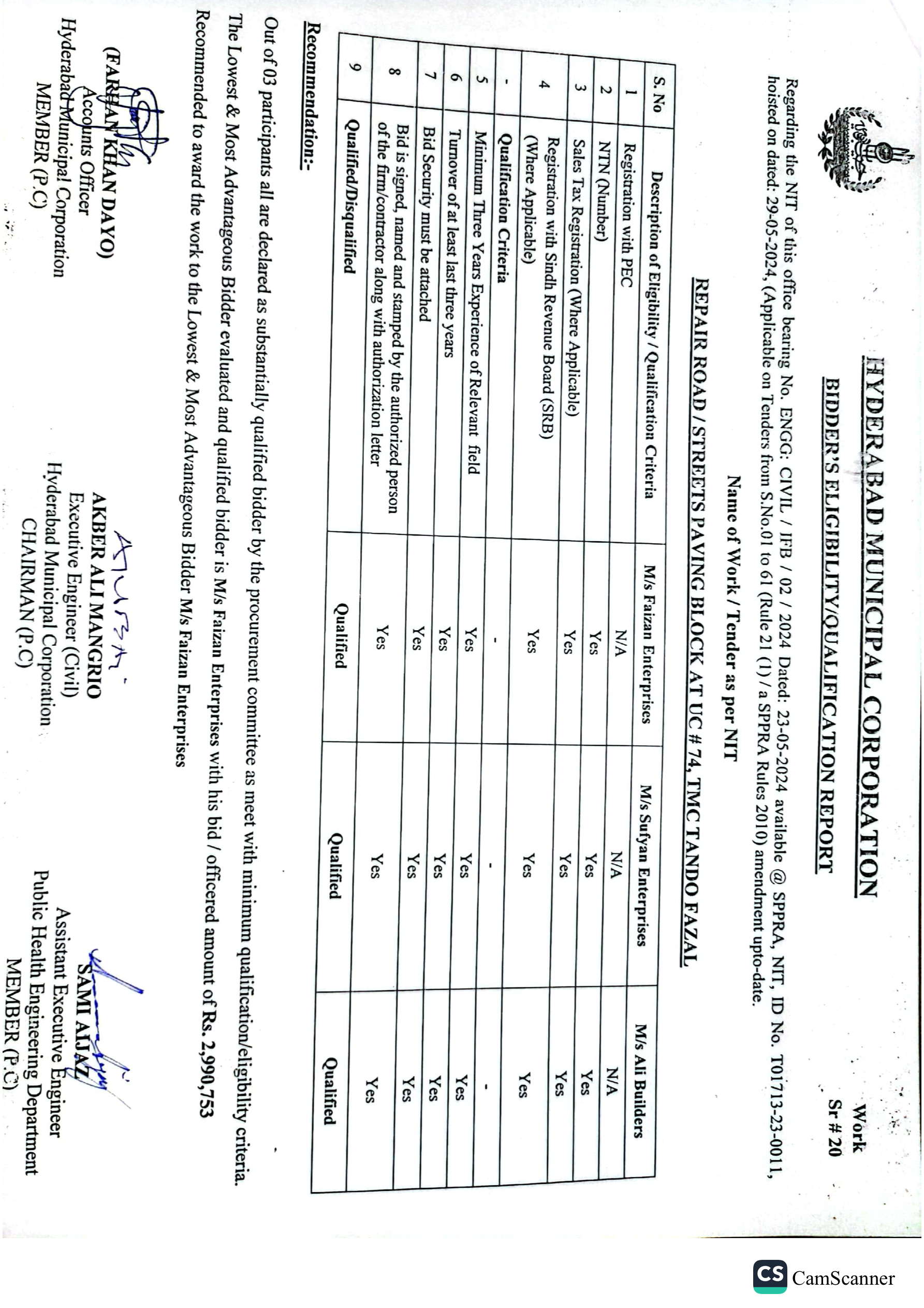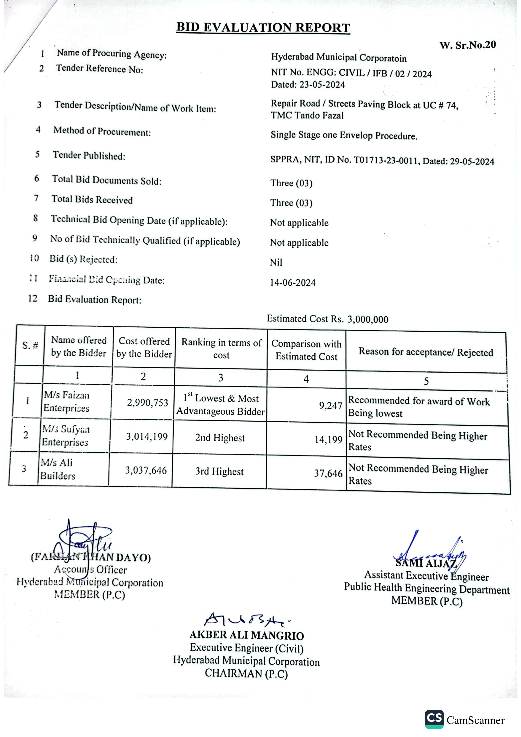 | T01713-23-0011 | BE01713-23-00011-20 | 20 REPAIR ROAD / STREETS PAVING BLOCK AT UC # 74, TMC TANDO FAZAL | Office of Mayor Hyderabad Municipal Corporation Hyderabad (27-Local Government Department) | 25-06-2024 | Hyderabad | Active |