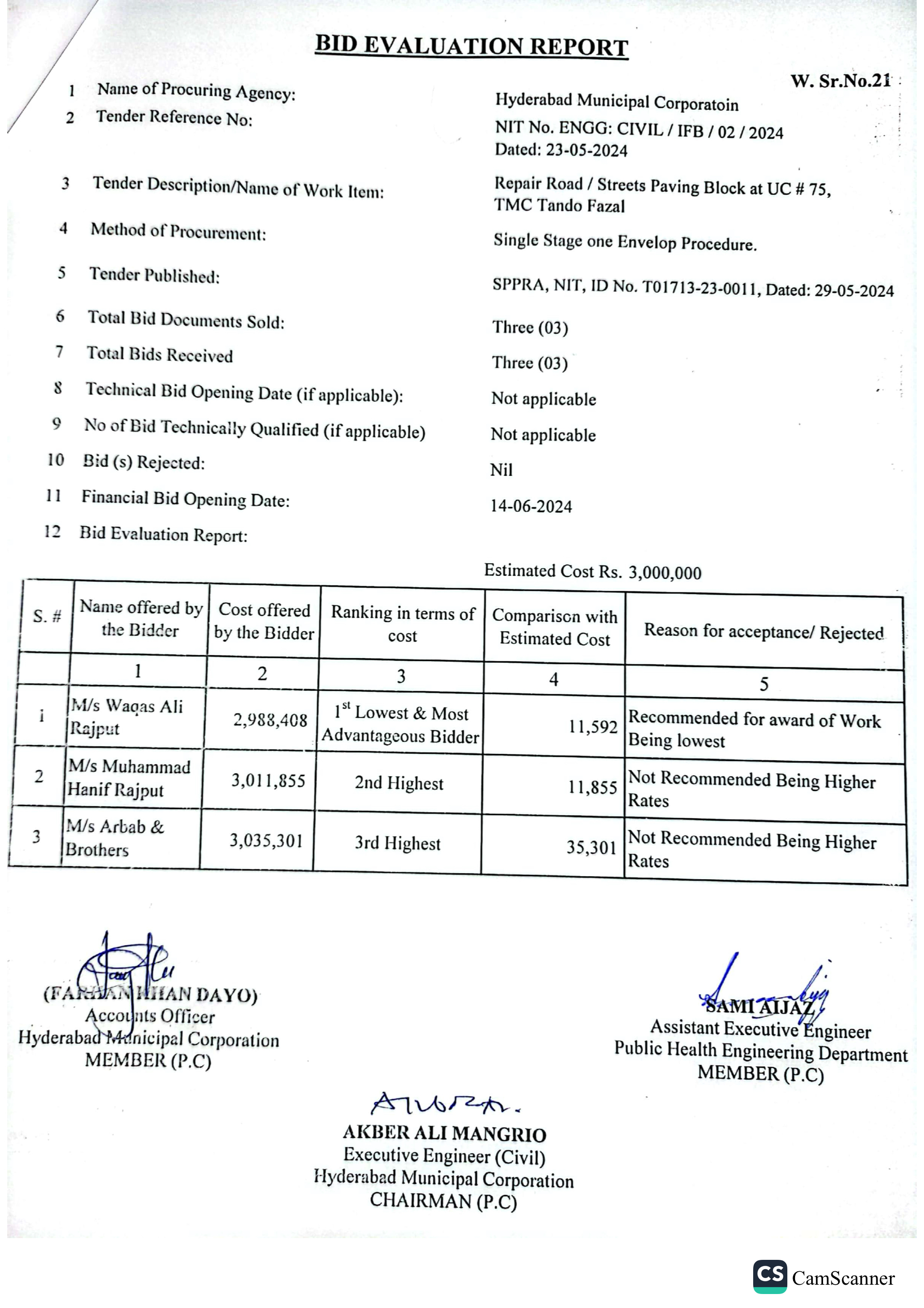 | T01713-23-0011 | BE01713-23-00011-21 | 21 REPAIR ROAD / STREETS PAVING BLOCK AT UC # 75, TMC TANDO FAZAL | Office of Mayor Hyderabad Municipal Corporation Hyderabad (27-Local Government Department) | 25-06-2024 | Hyderabad | Active |