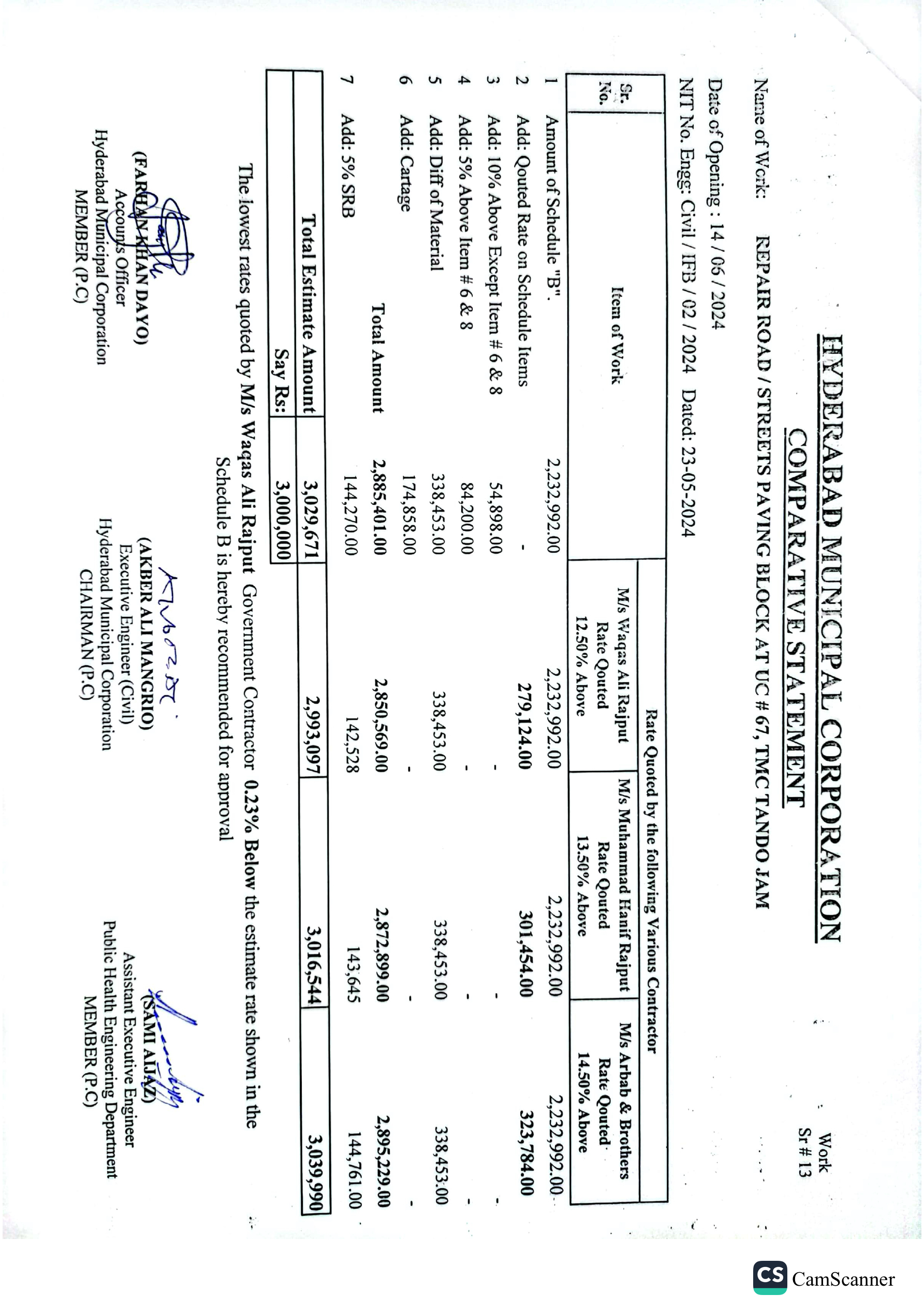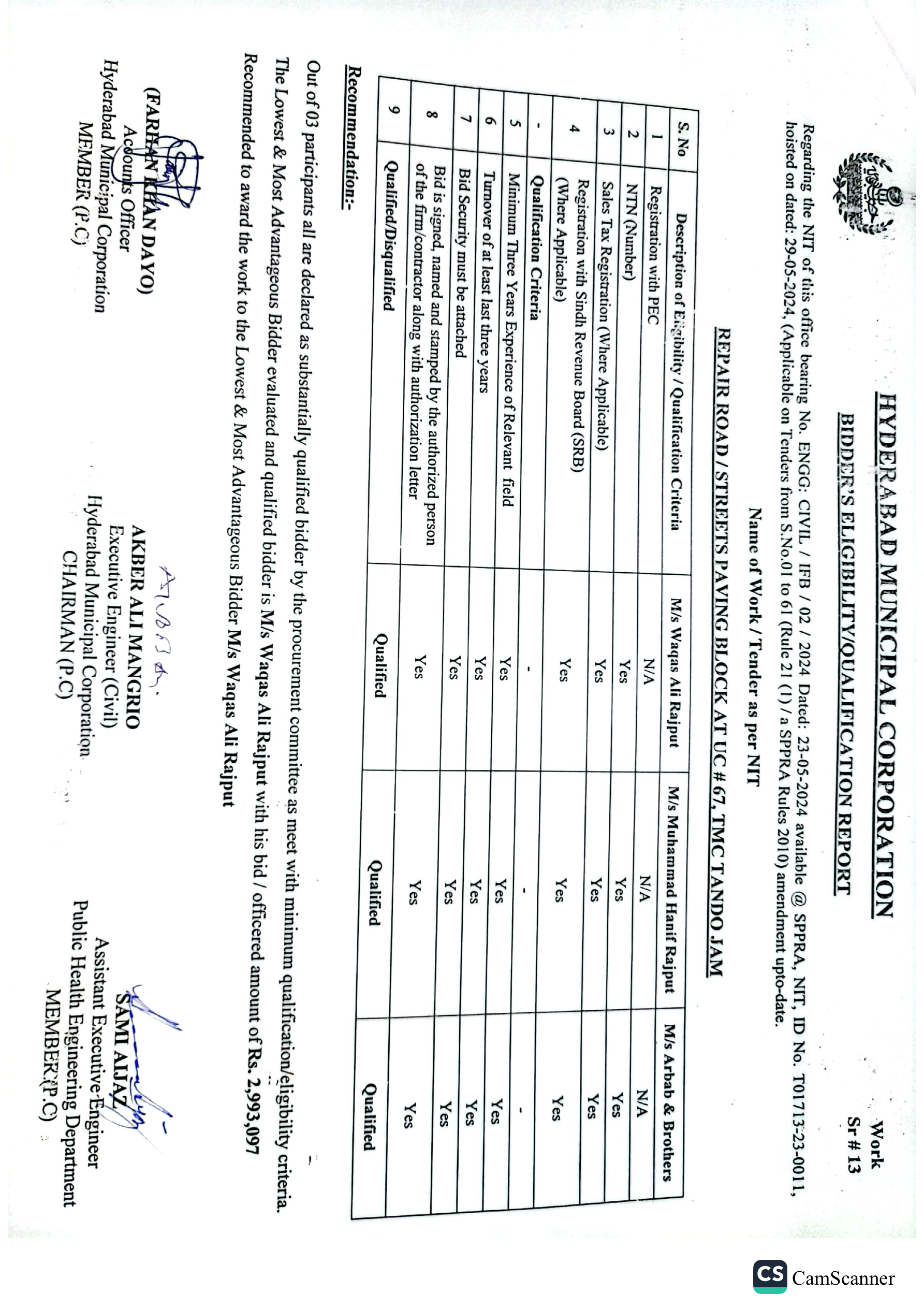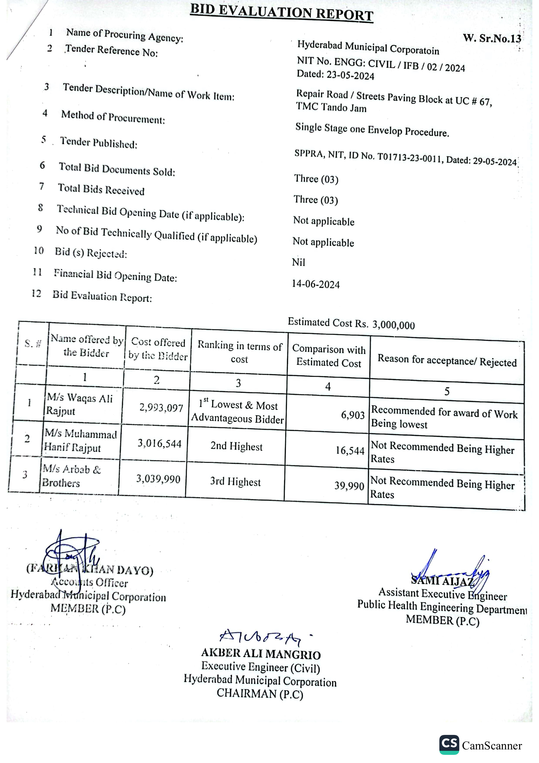 | T01713-23-0011 | BE01713-23-00011-13 | 13 REPAIR ROAD / STREETS PAVING BLOCK AT UC # 66, TMC TANDO JAM | Office of Mayor Hyderabad Municipal Corporation Hyderabad (27-Local Government Department) | 25-06-2024 | Hyderabad | Active |
