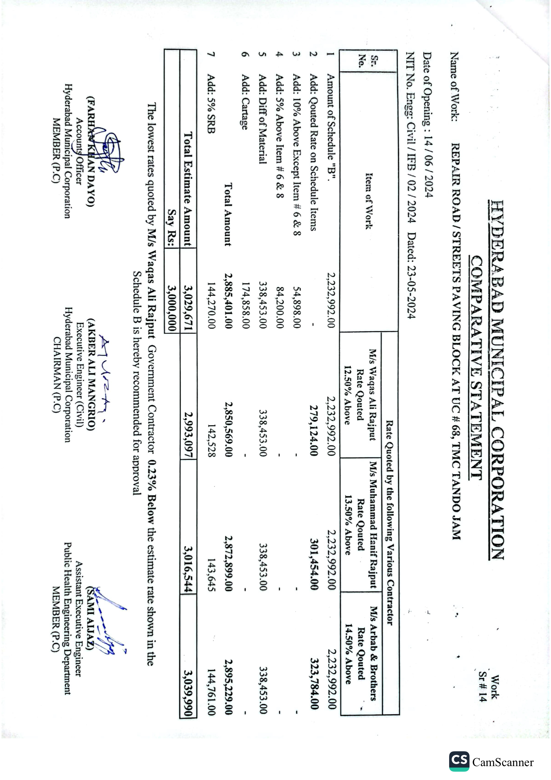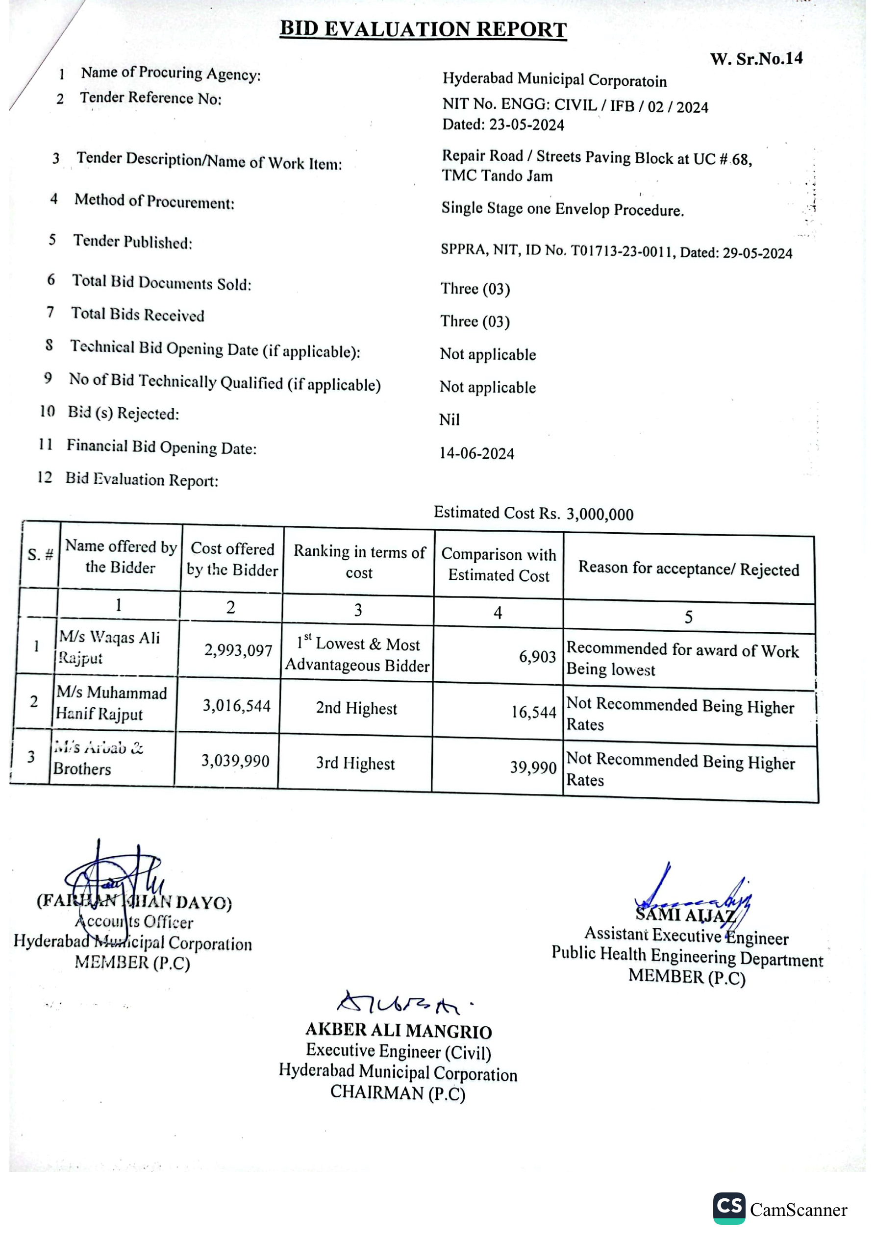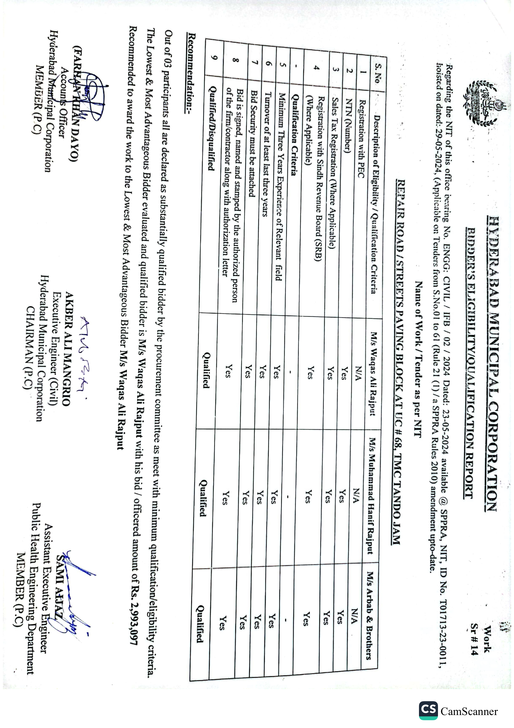 | T01713-23-0011 | BE01713-23-00011-14 | 14 REPAIR ROAD / STREETS PAVING BLOCK AT UC # 68, TMC TANDO JAM | Office of Mayor Hyderabad Municipal Corporation Hyderabad (27-Local Government Department) | 25-06-2024 | Hyderabad | Active |