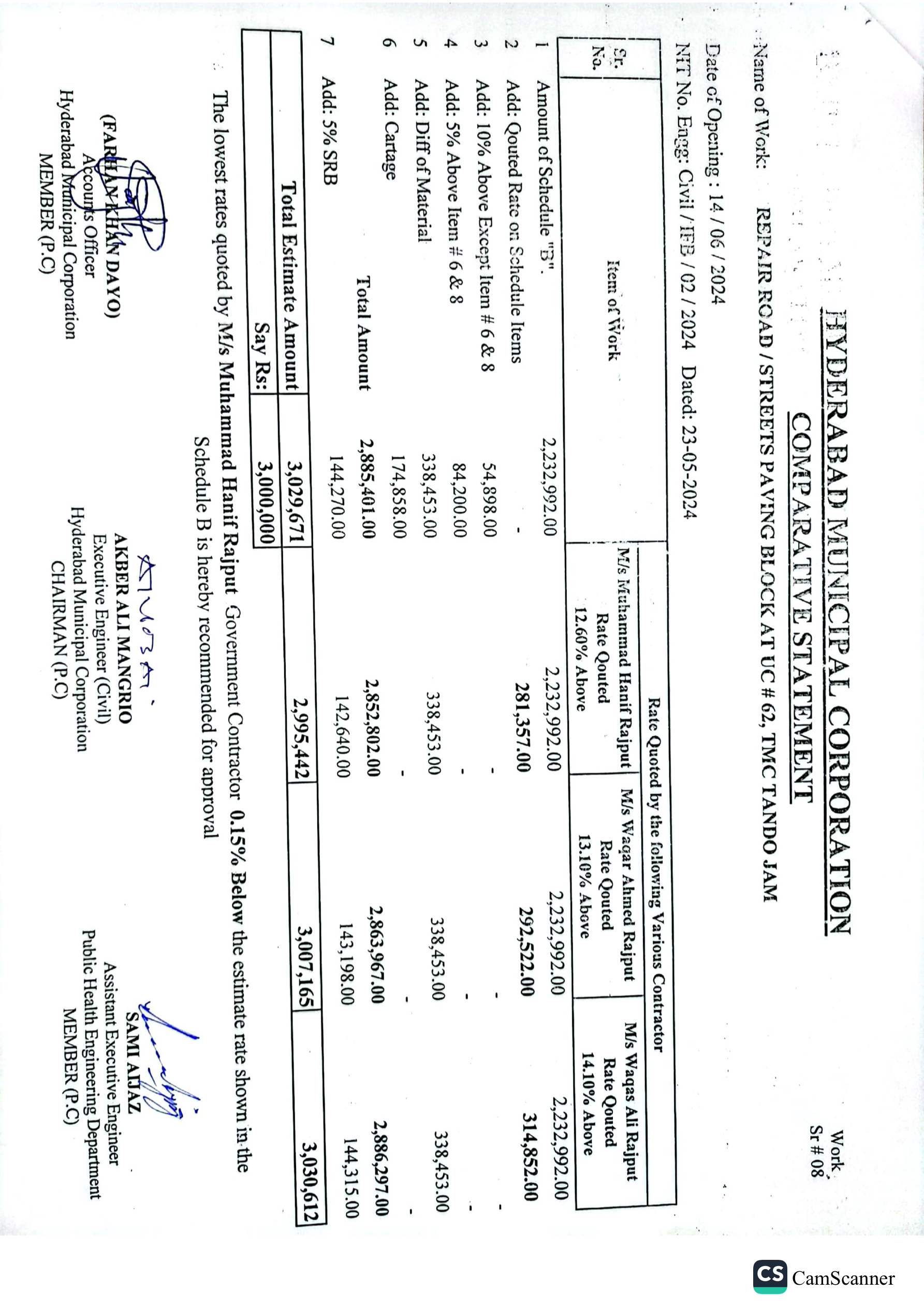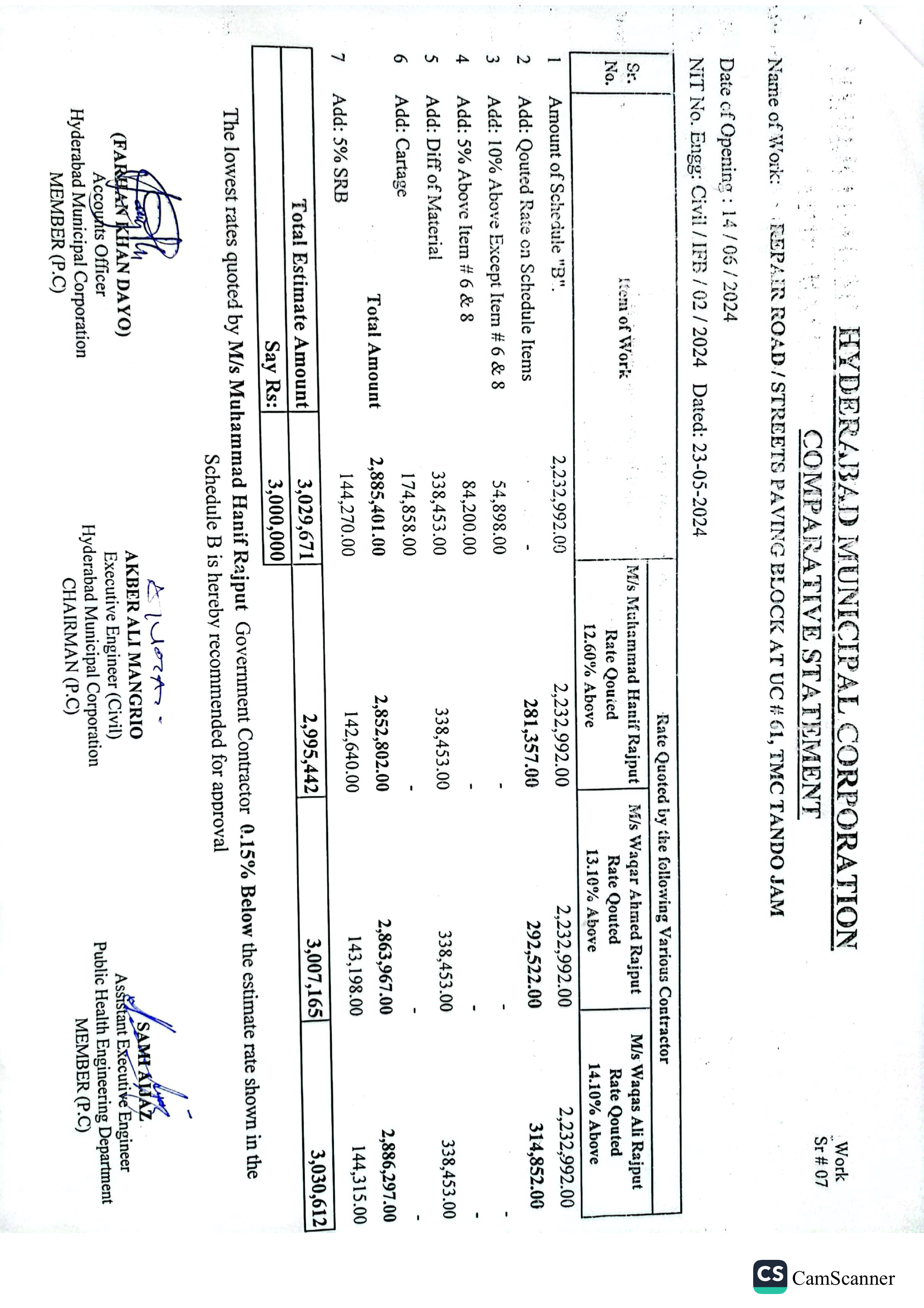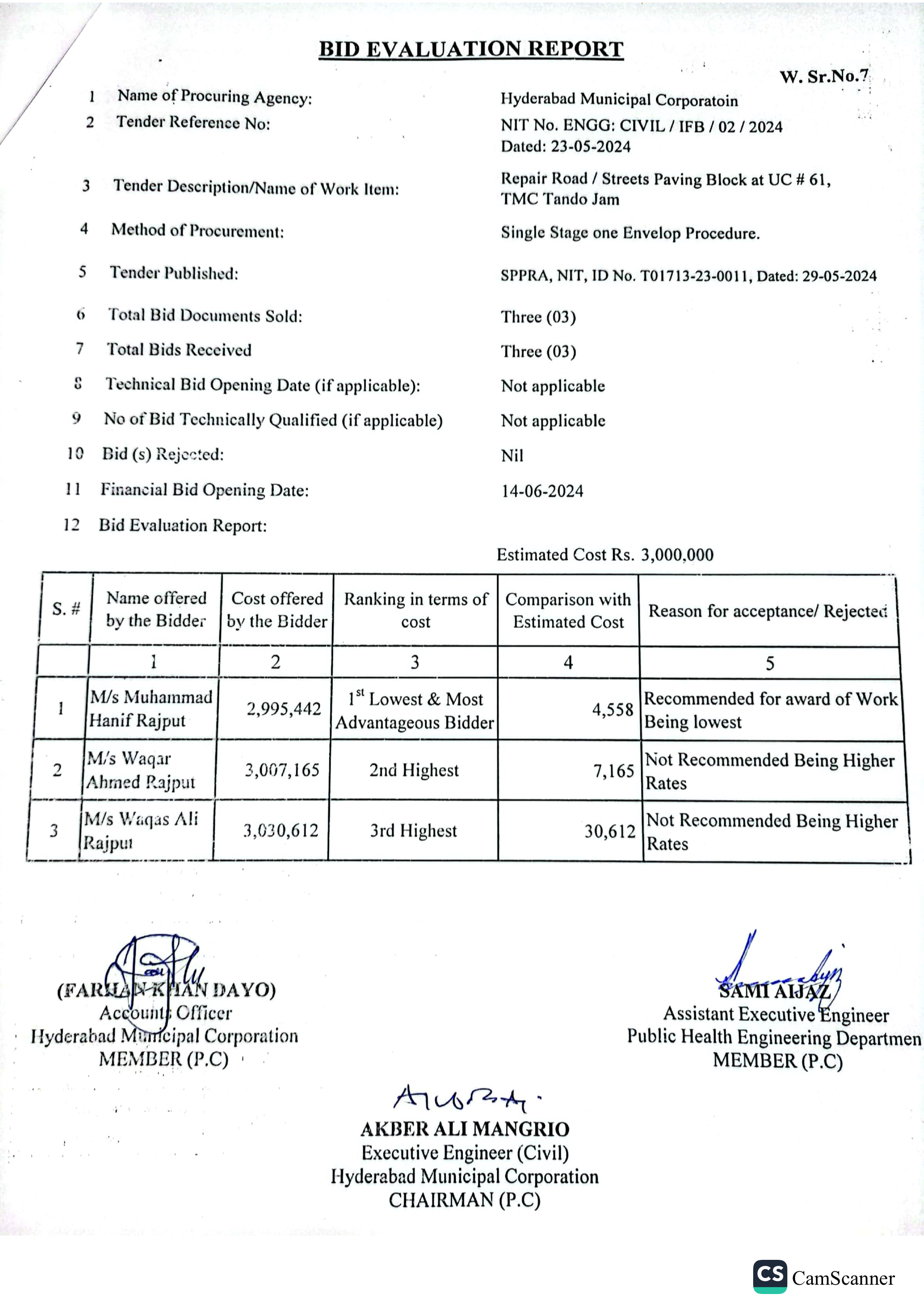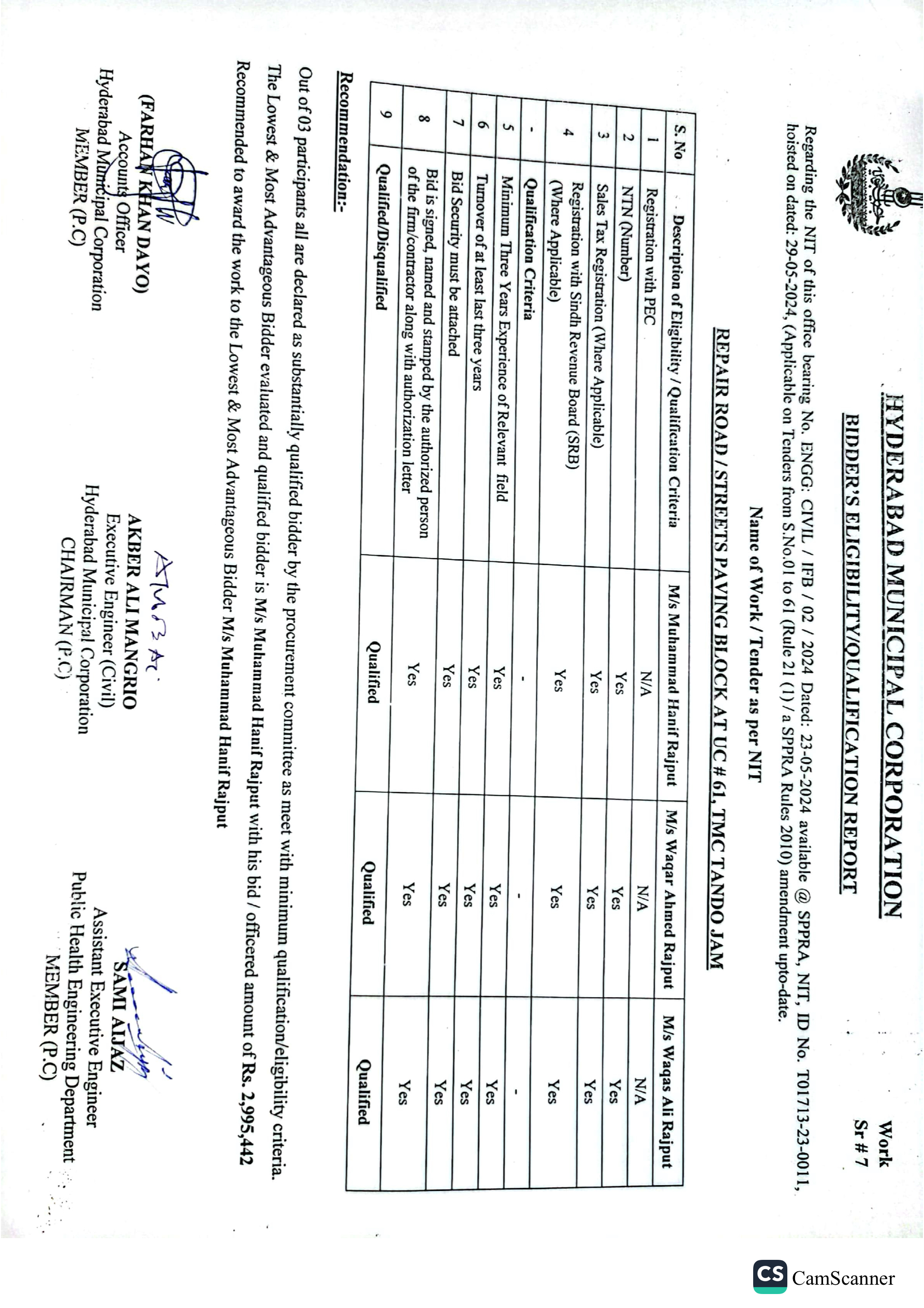 | T01713-23-0011 | BE01713-23-00011-7 | 7 REPAIR ROAD / STREETS PAVING BLOCK AT UC # 61, TMC TANDO JAM | Office of Mayor Hyderabad Municipal Corporation Hyderabad (27-Local Government Department) | 25-06-2024 | Hyderabad | Active |