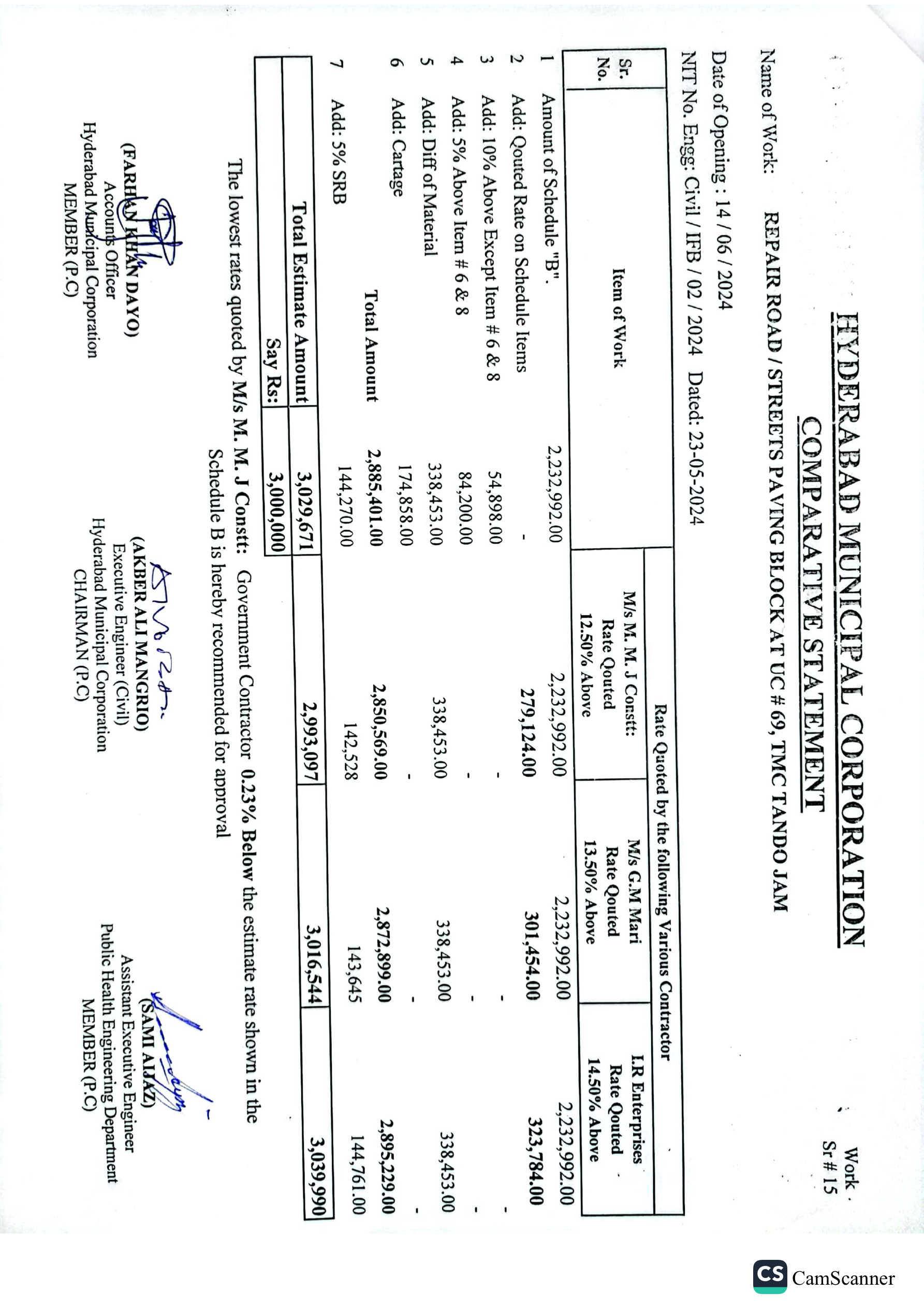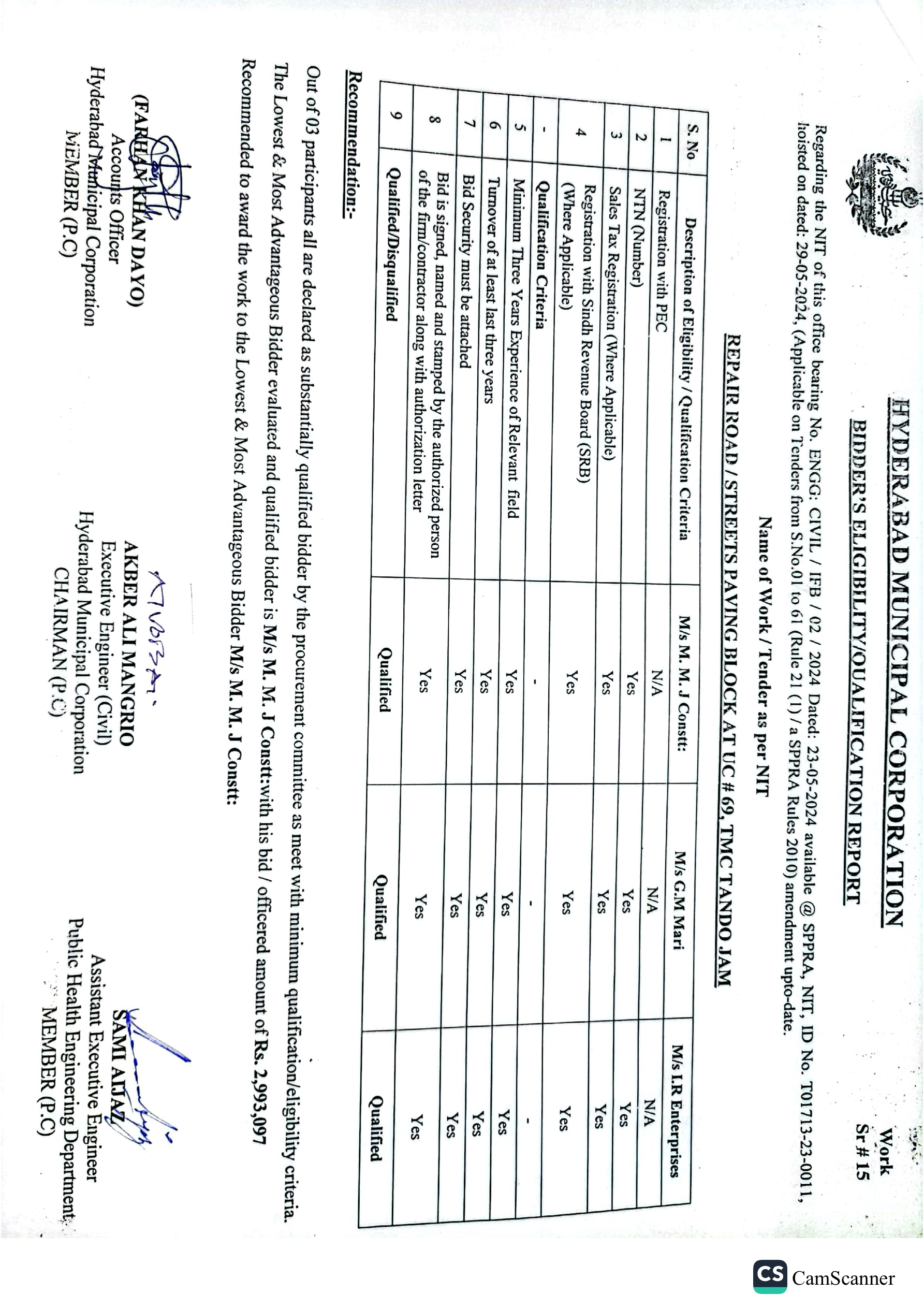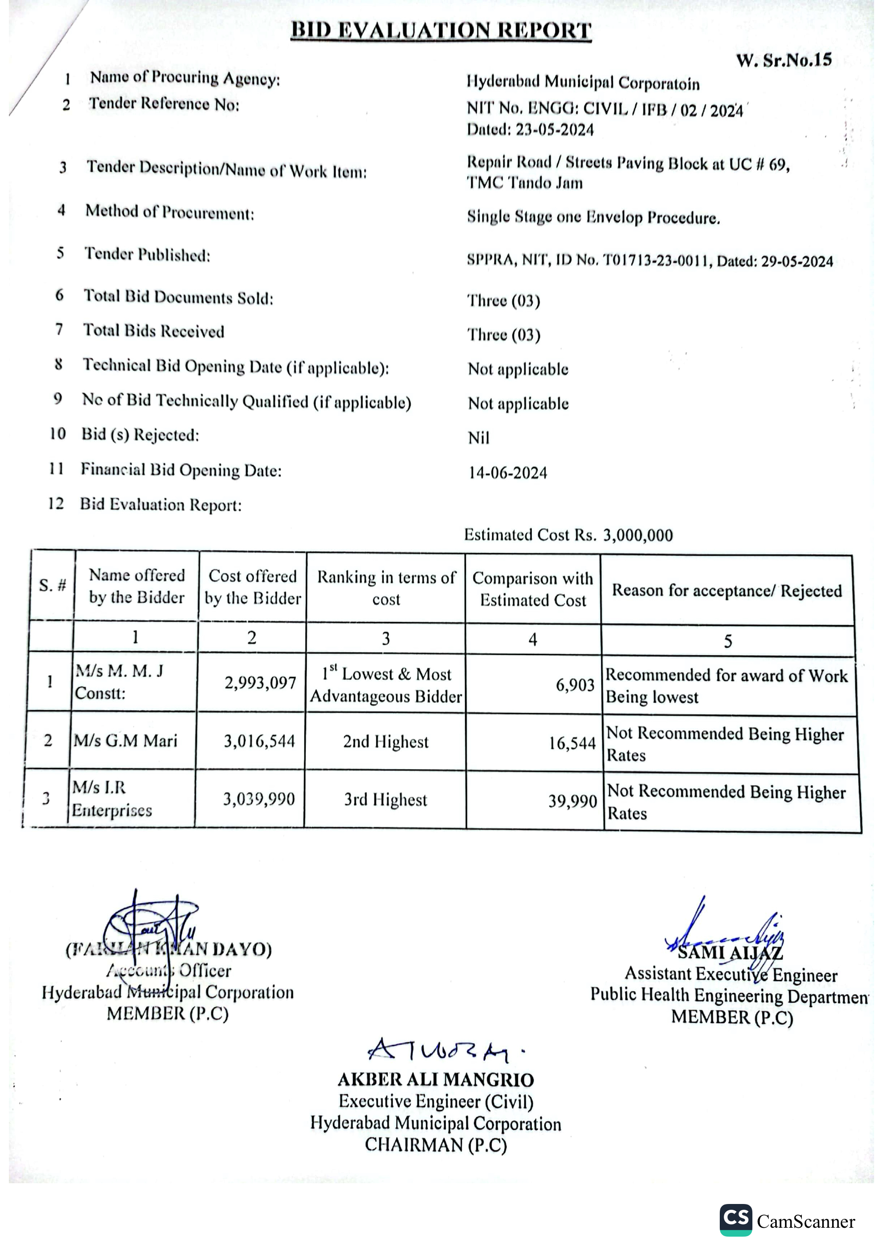 | T01713-23-0011 | BE01713-23-00011-15 | 15 REPAIR ROAD / STREETS PAVING BLOCK AT UC # 69, TMC TANDO JAM | Office of Mayor Hyderabad Municipal Corporation Hyderabad (27-Local Government Department) | 25-06-2024 | Hyderabad | Active |