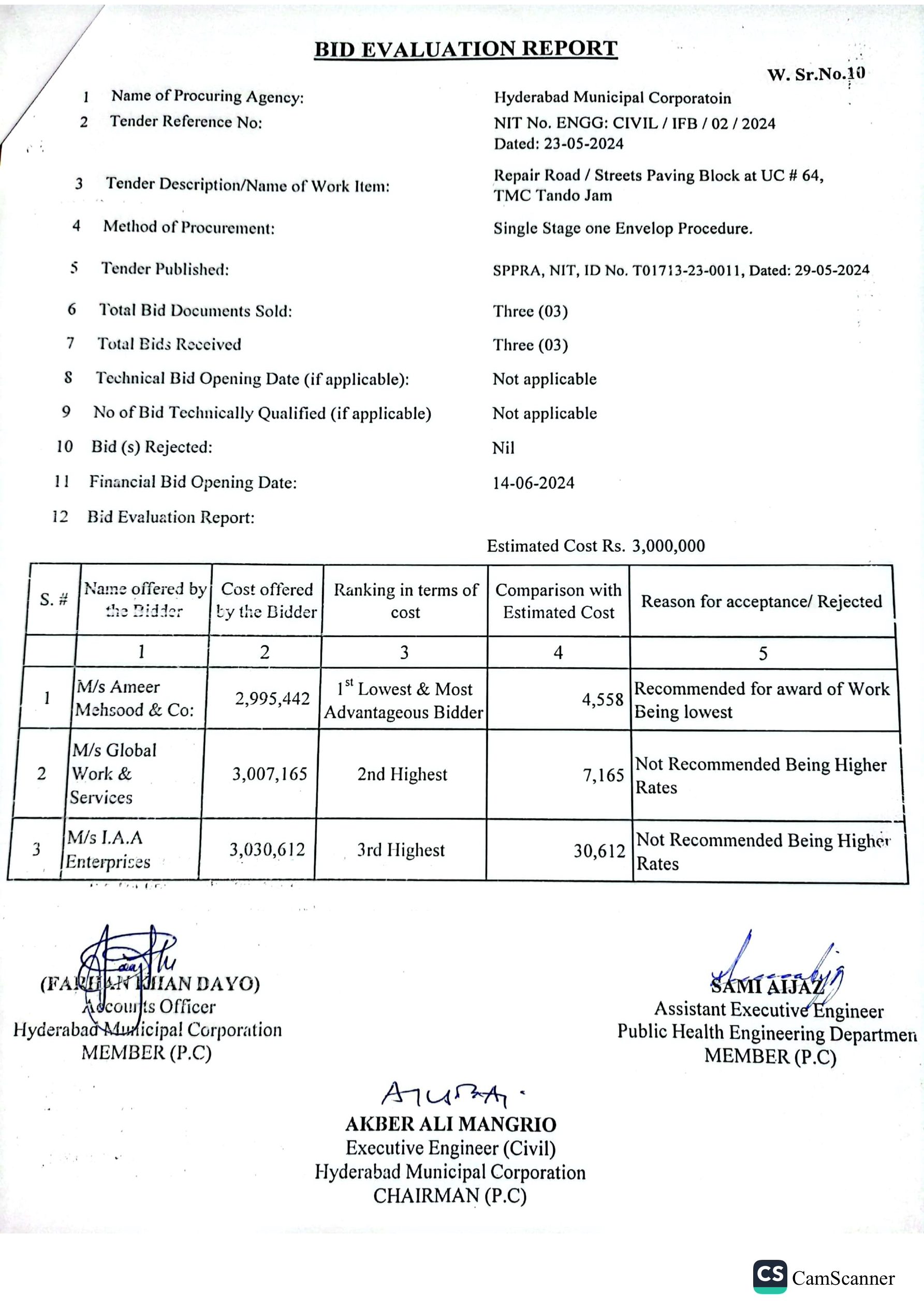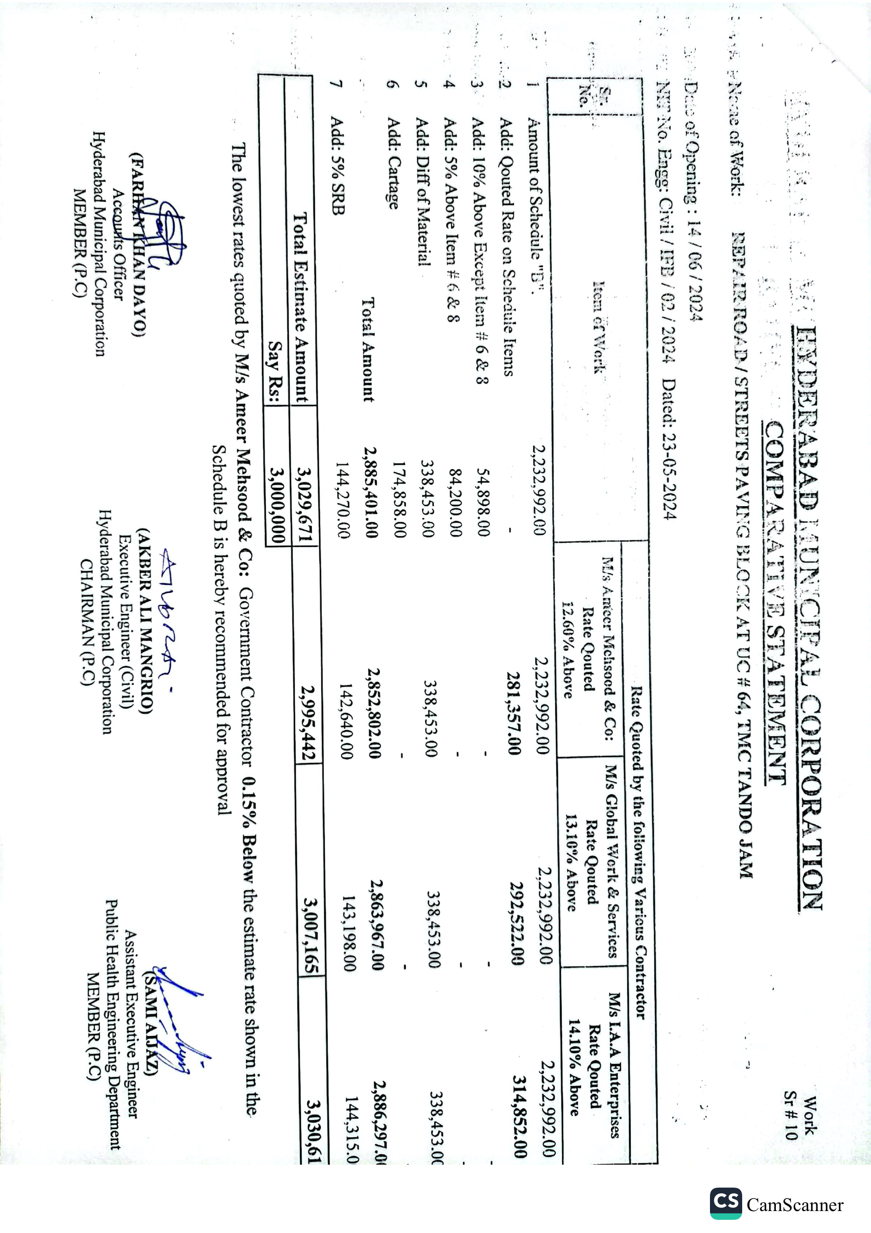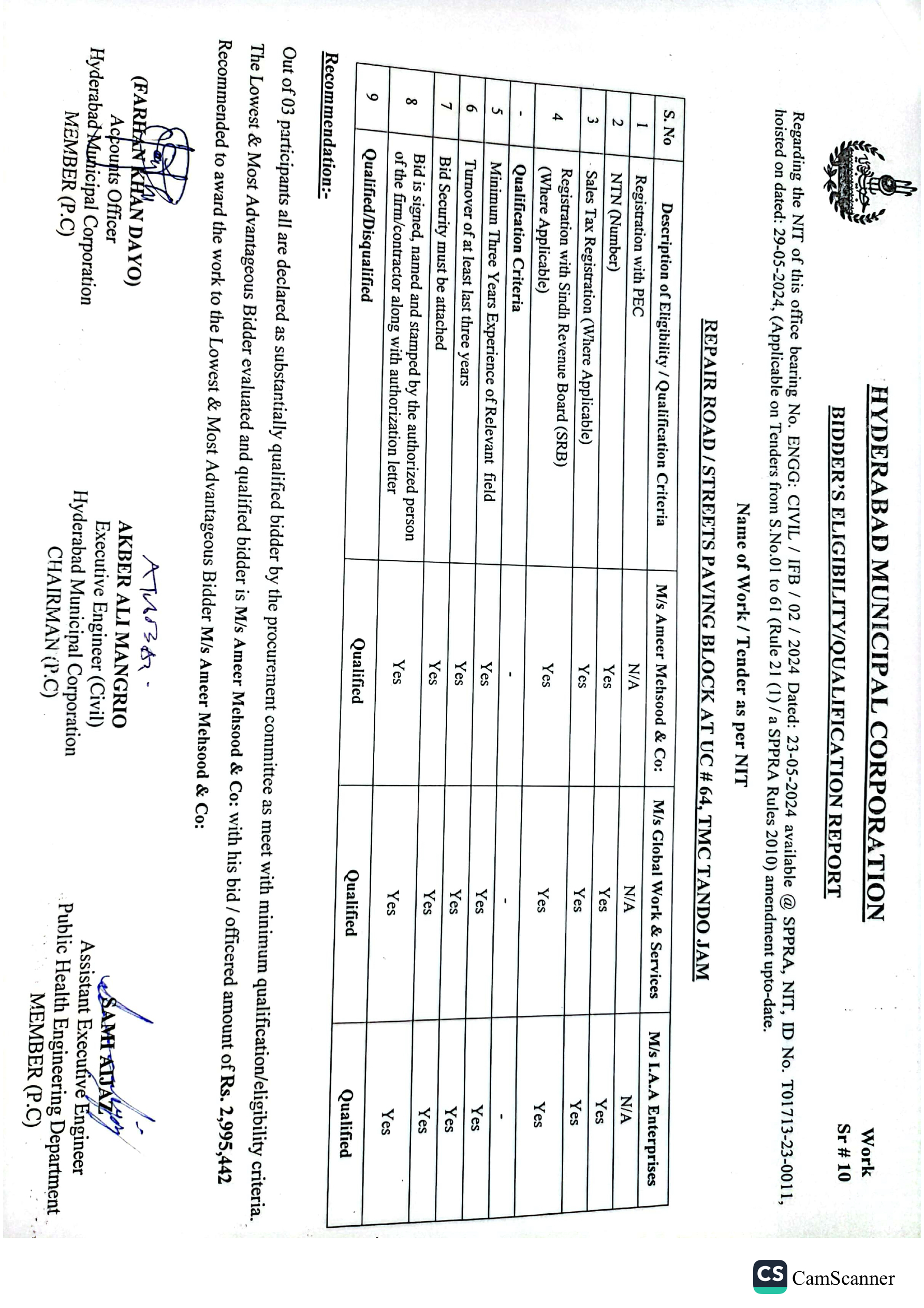| T01713-23-0011 | BE01713-23-00011-10 | 10 REPAIR ROAD / STREETS PAVING BLOCK AT UC # 64, TMC TANDO JAM | Office of Mayor Hyderabad Municipal Corporation Hyderabad (27-Local Government Department) | 25-06-2024 | Hyderabad | Active |
