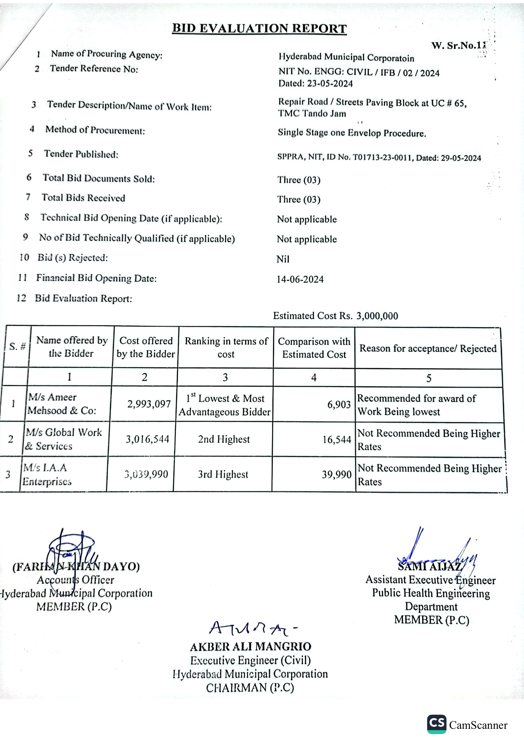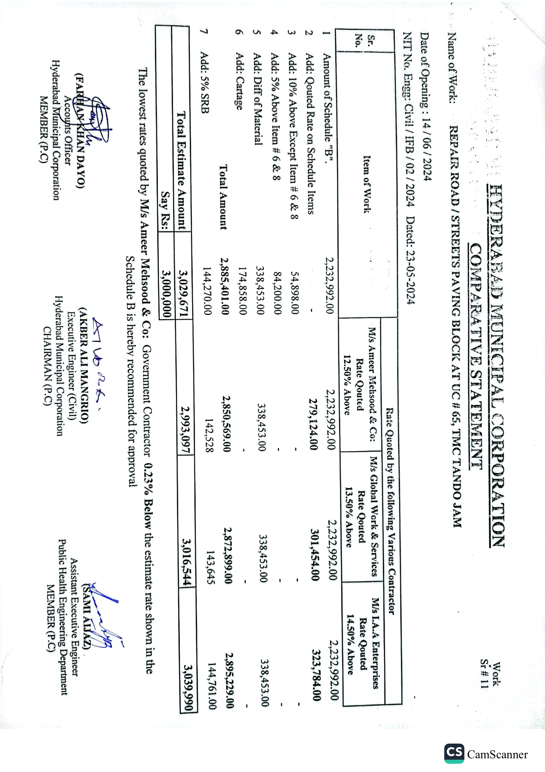 | T01713-23-0011 | BE01713-23-00011-11 | 11 REPAIR ROAD / STREETS PAVING BLOCK AT UC # 65, TMC TANDO JAM | Office of Mayor Hyderabad Municipal Corporation Hyderabad (27-Local Government Department) | 25-06-2024 | Hyderabad | Active |