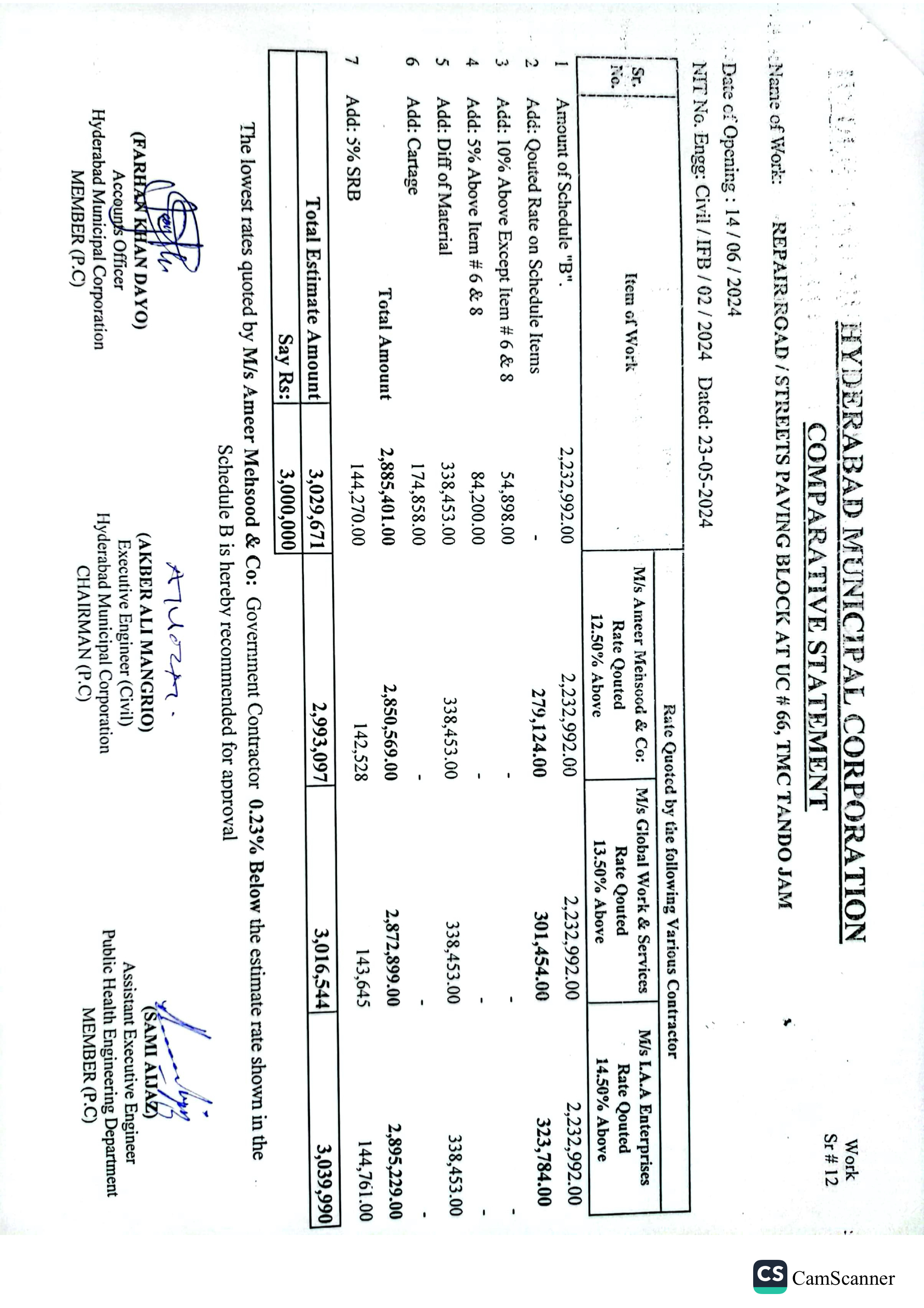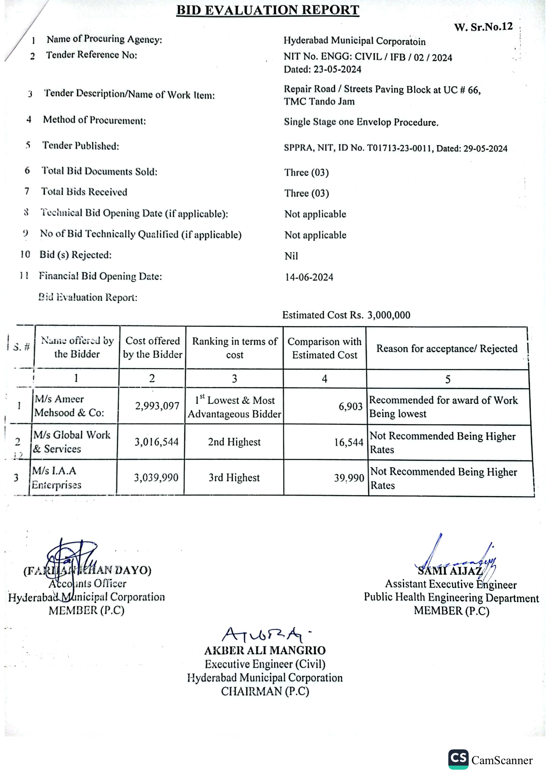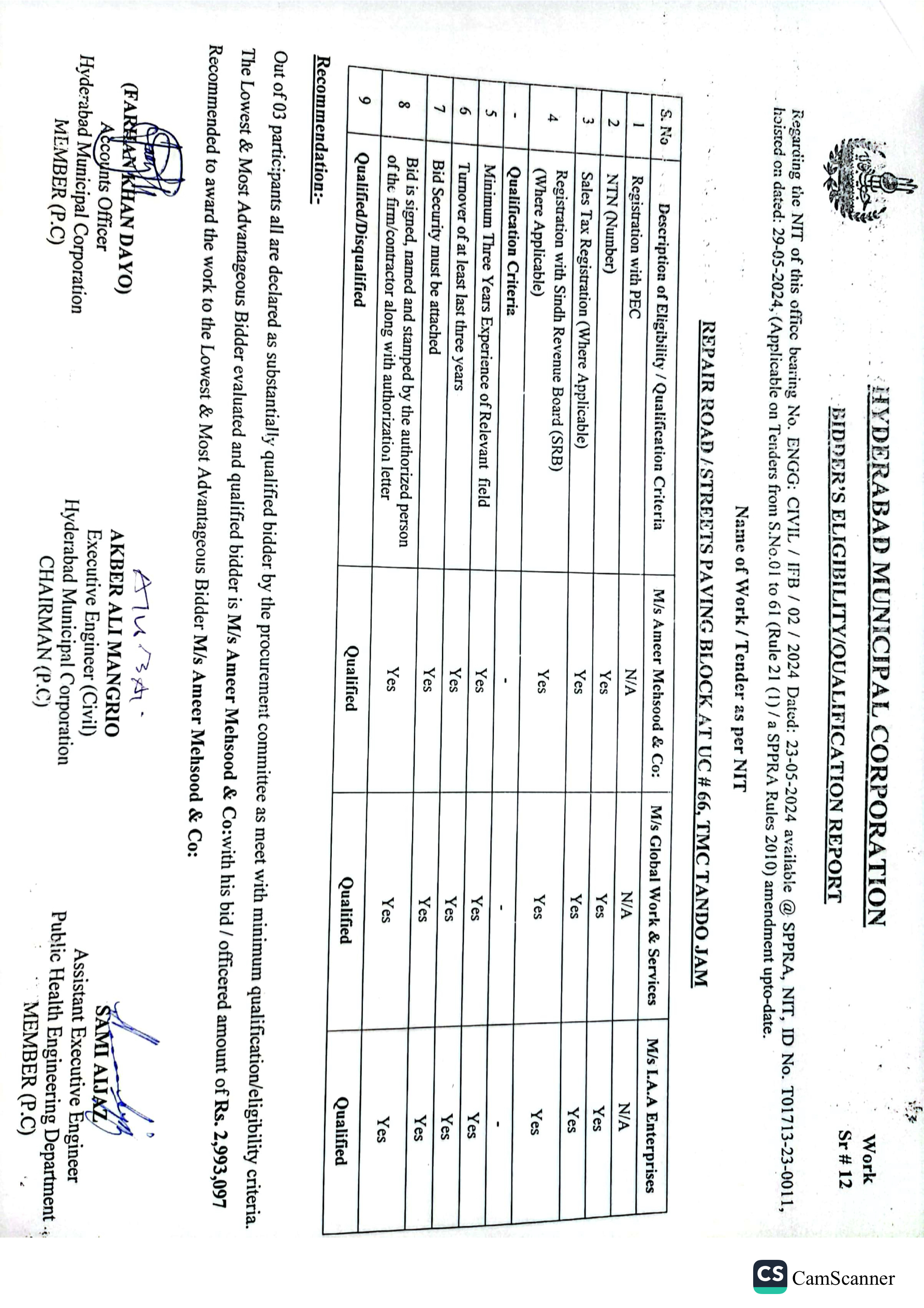 | T01713-23-0011 | BE01713-23-00011-12 | 12 REPAIR ROAD / STREETS PAVING BLOCK AT UC # 66, TMC TANDO JAM | Office of Mayor Hyderabad Municipal Corporation Hyderabad (27-Local Government Department) | 25-06-2024 | Hyderabad | Active |