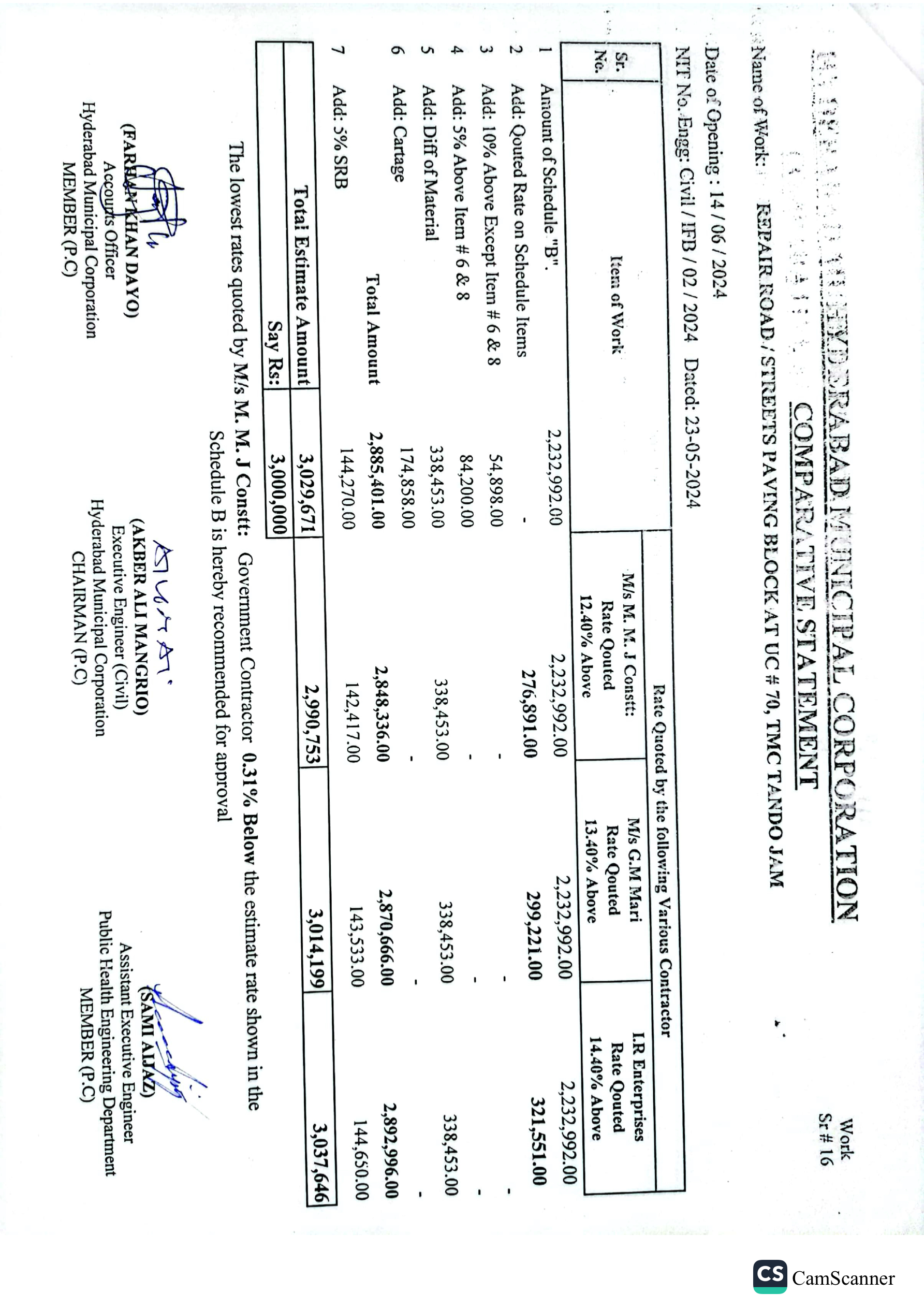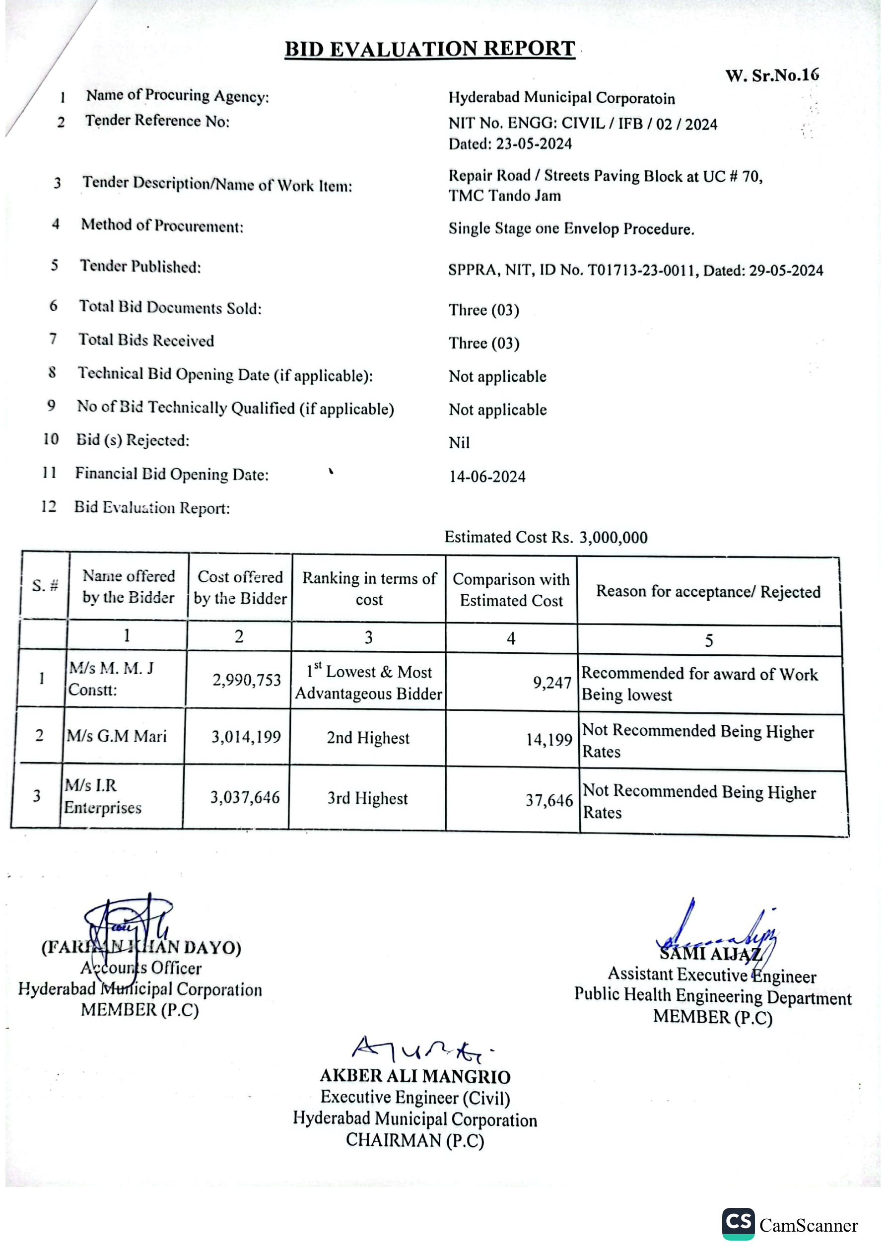 | T01713-23-0011 | BE01713-23-00011-16 | 16 REPAIR ROAD / STREETS PAVING BLOCK AT UC # 70, TMC TANDO JAM | Office of Mayor Hyderabad Municipal Corporation Hyderabad (27-Local Government Department) | 25-06-2024 | Hyderabad | Active |