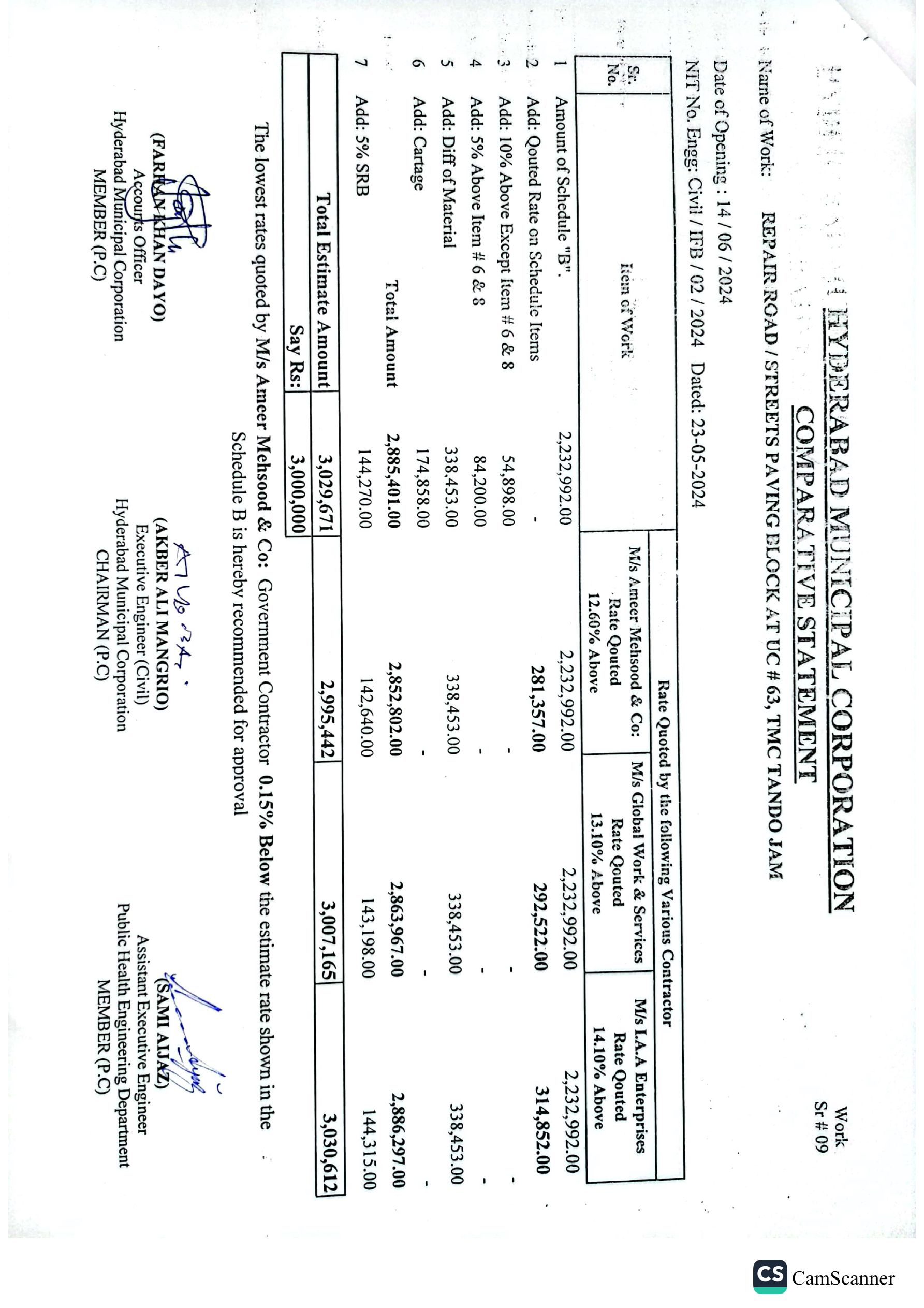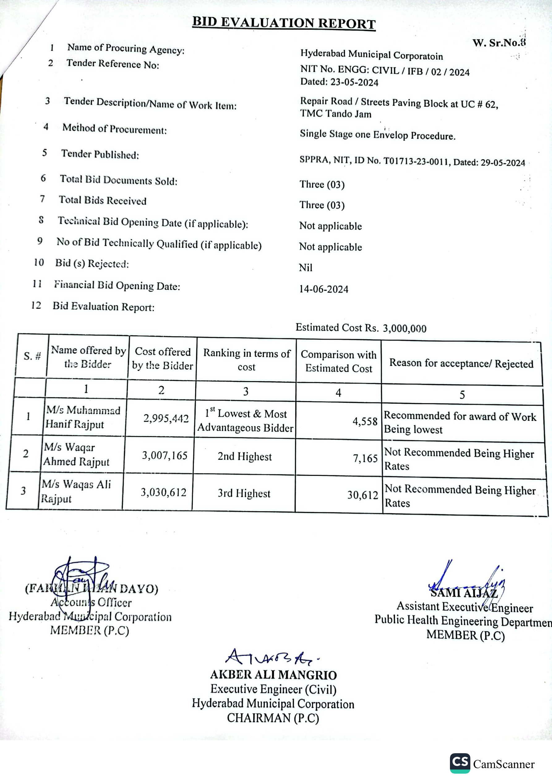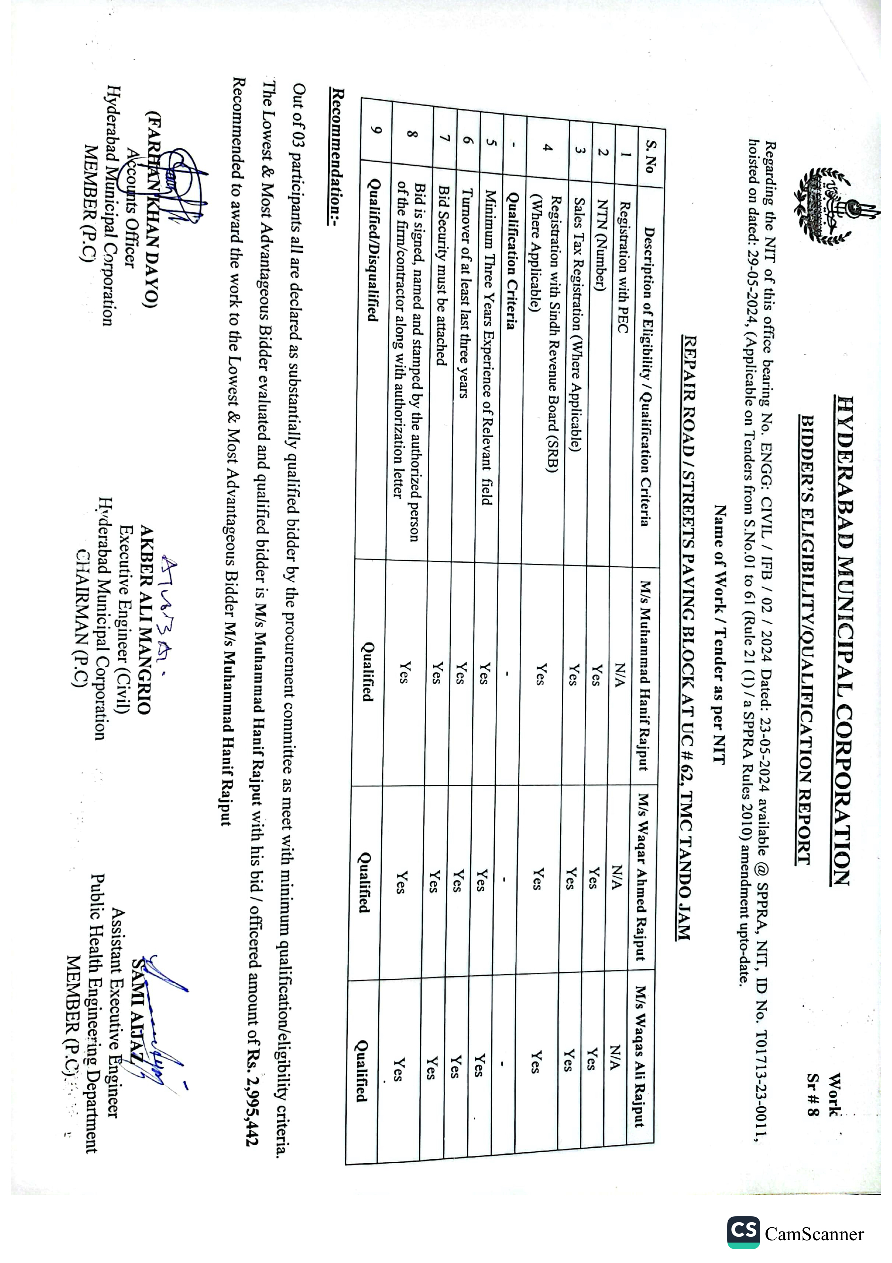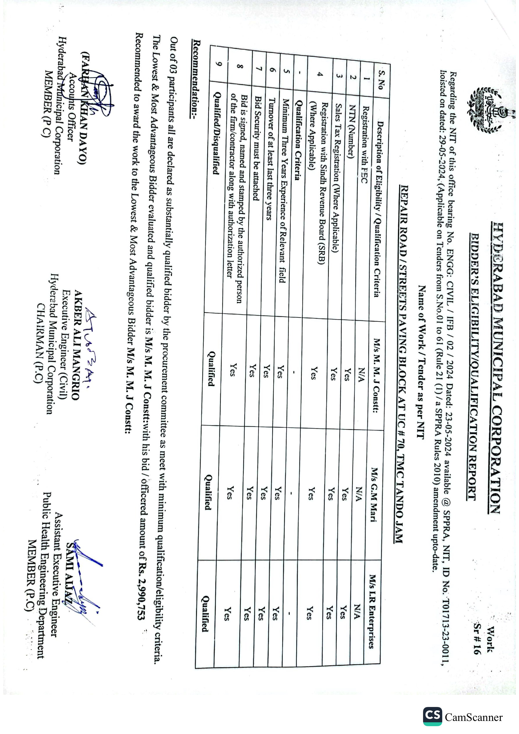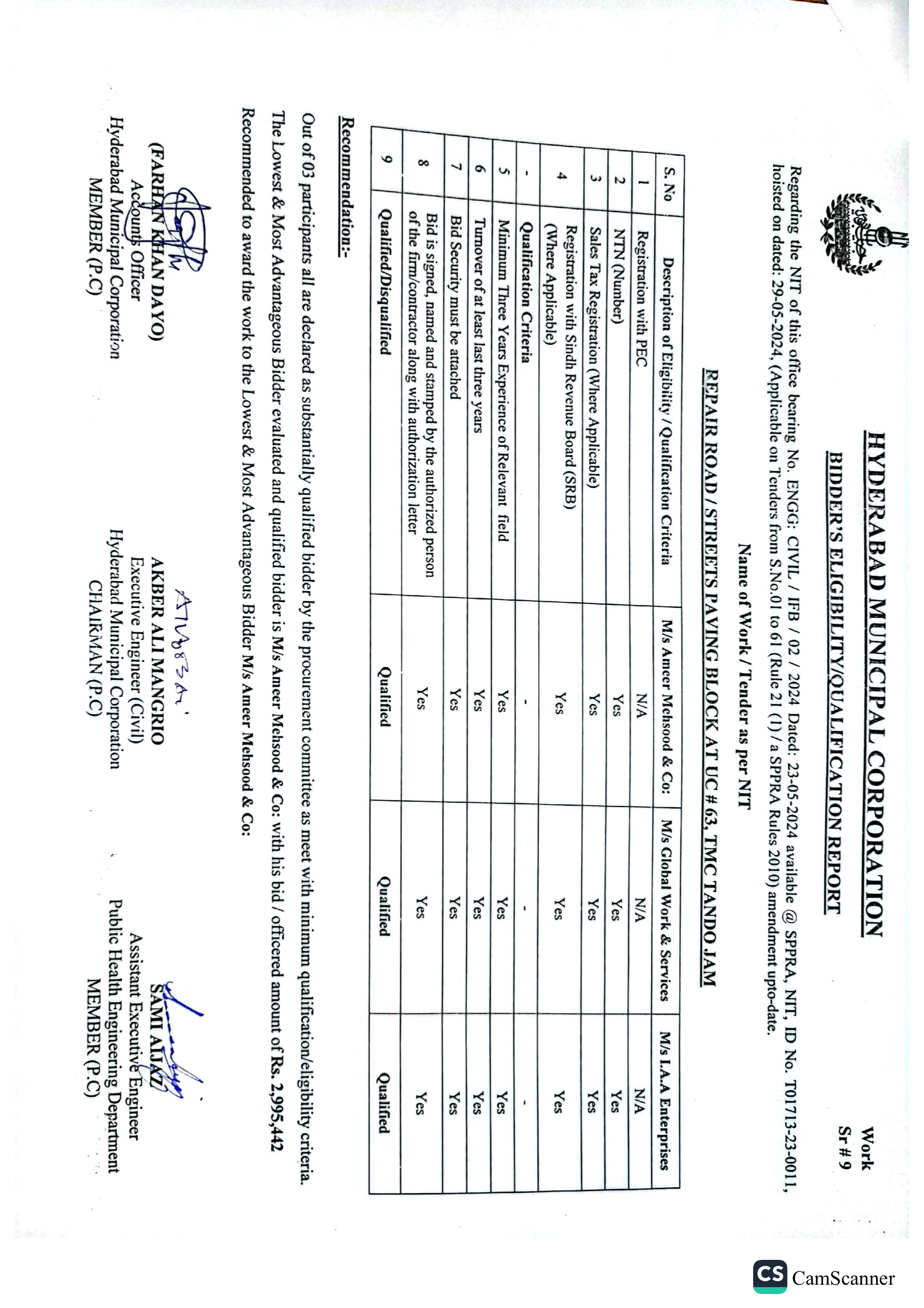 | T01713-23-0011 | BE01713-23-00011-9 | 9 REPAIR ROAD / STREETS PAVING BLOCK AT UC # 63, TMC TANDO JAM | Office of Mayor Hyderabad Municipal Corporation Hyderabad (27-Local Government Department) | 25-06-2024 | Hyderabad | Active |