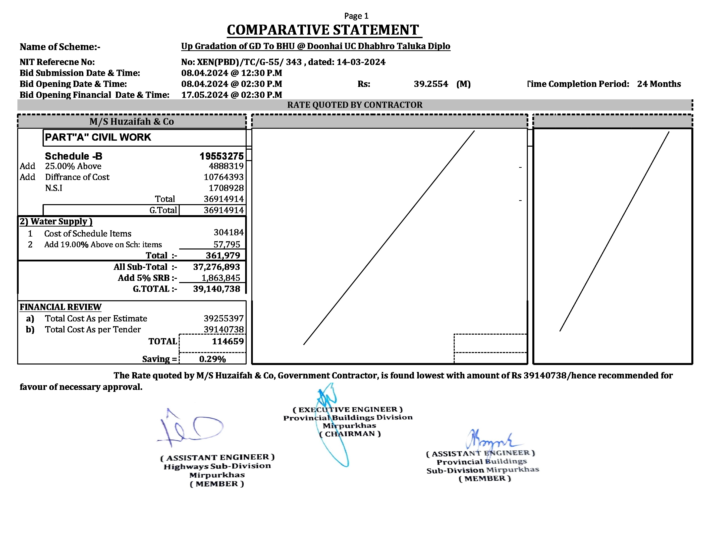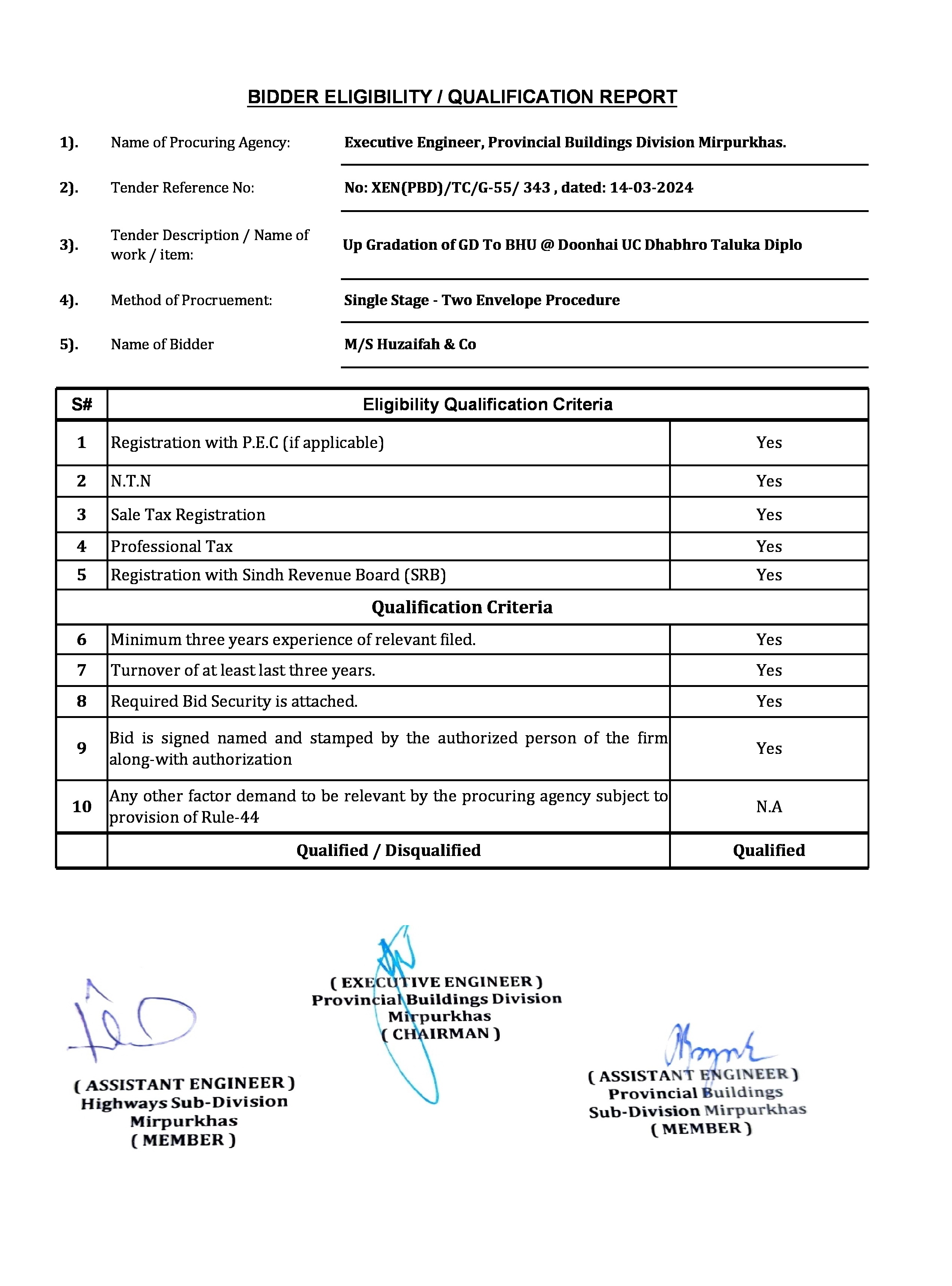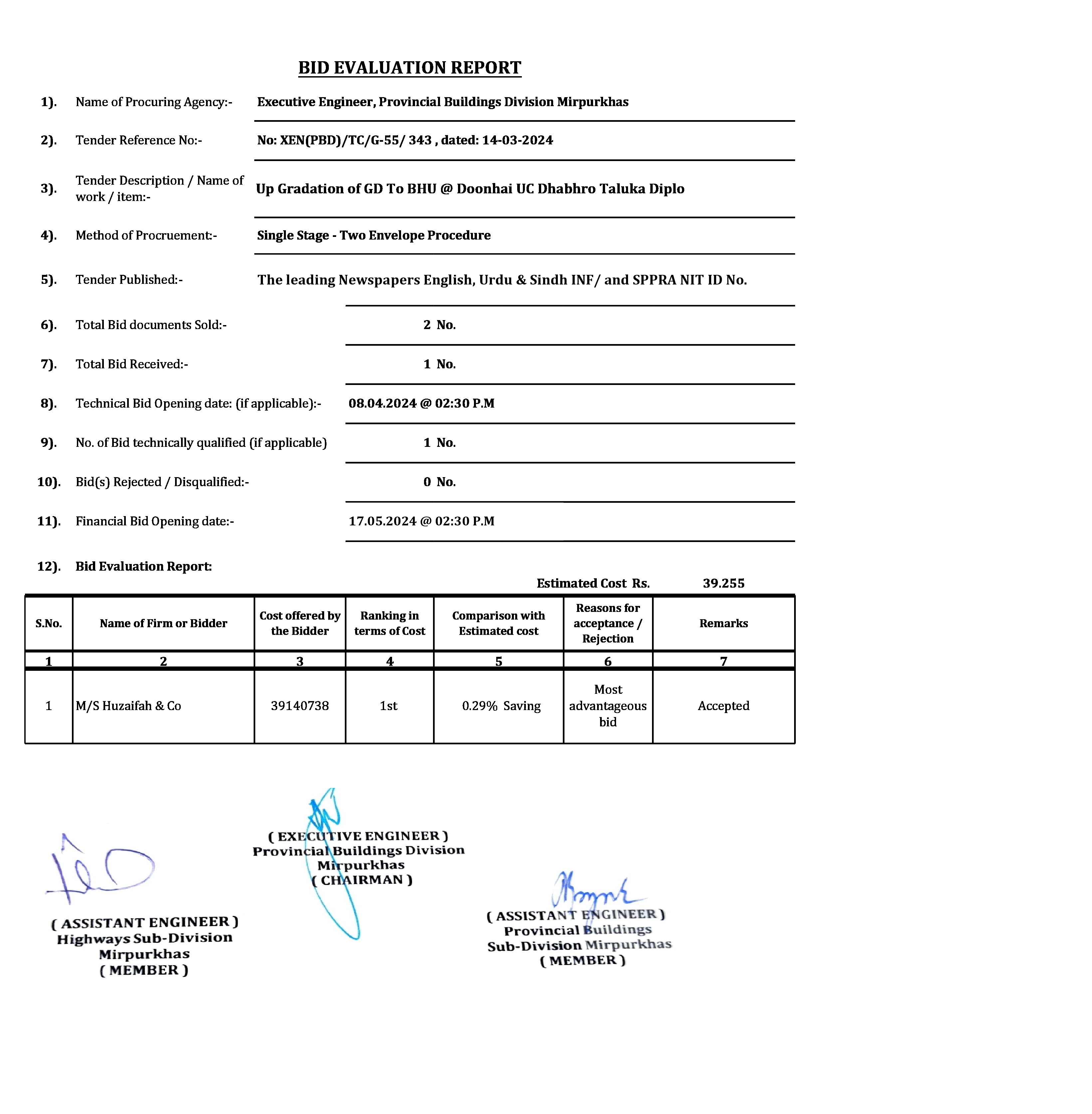| T00734-23-0002 | BE00734-23-0001-1 | 1 Up Gradation of GD To BHU @ Doonhai UC Dhabhro Taluka Diplo | Provincial Building Division Mirpurkhas (51-Works and Services Department) | 20-05-2024 | Mirpur Khas | Active |