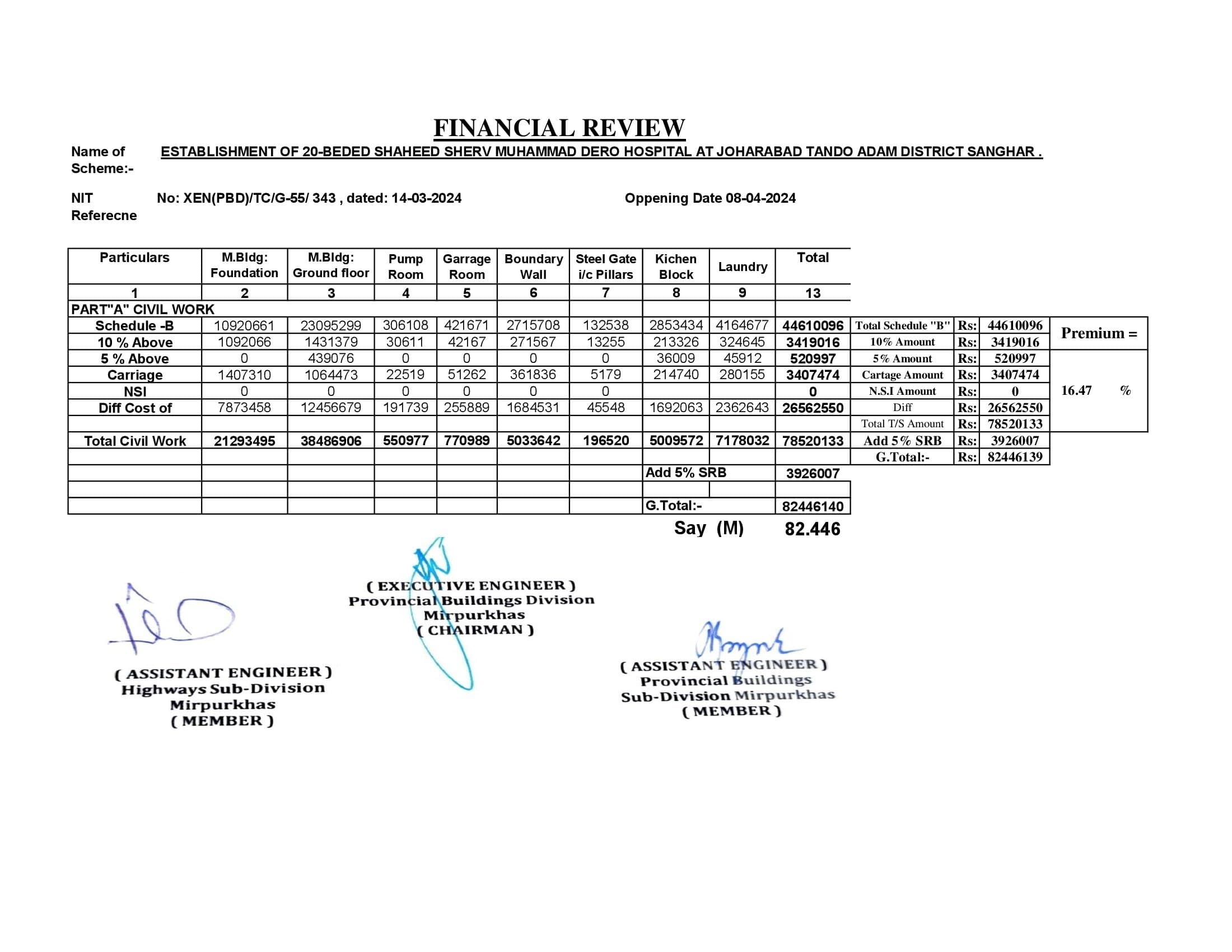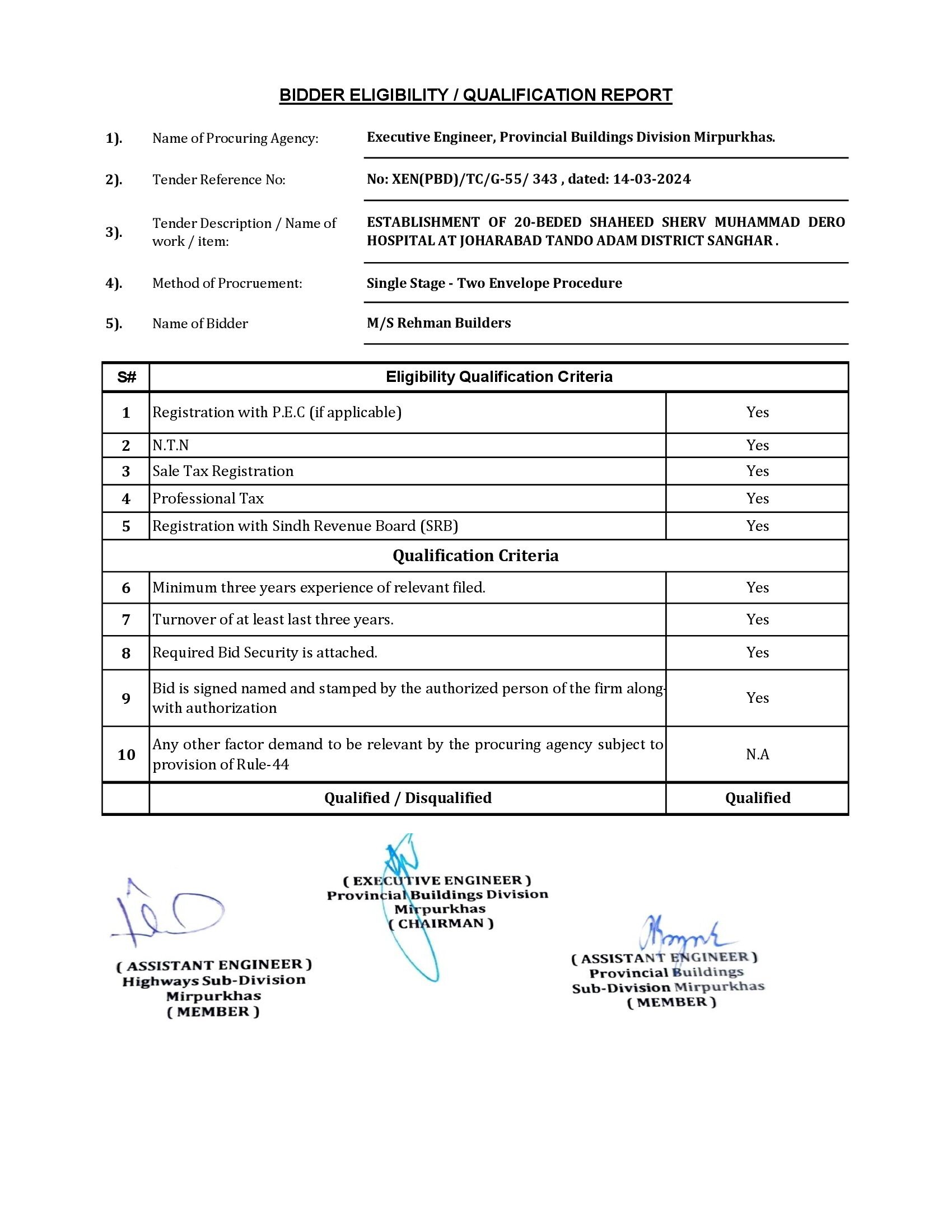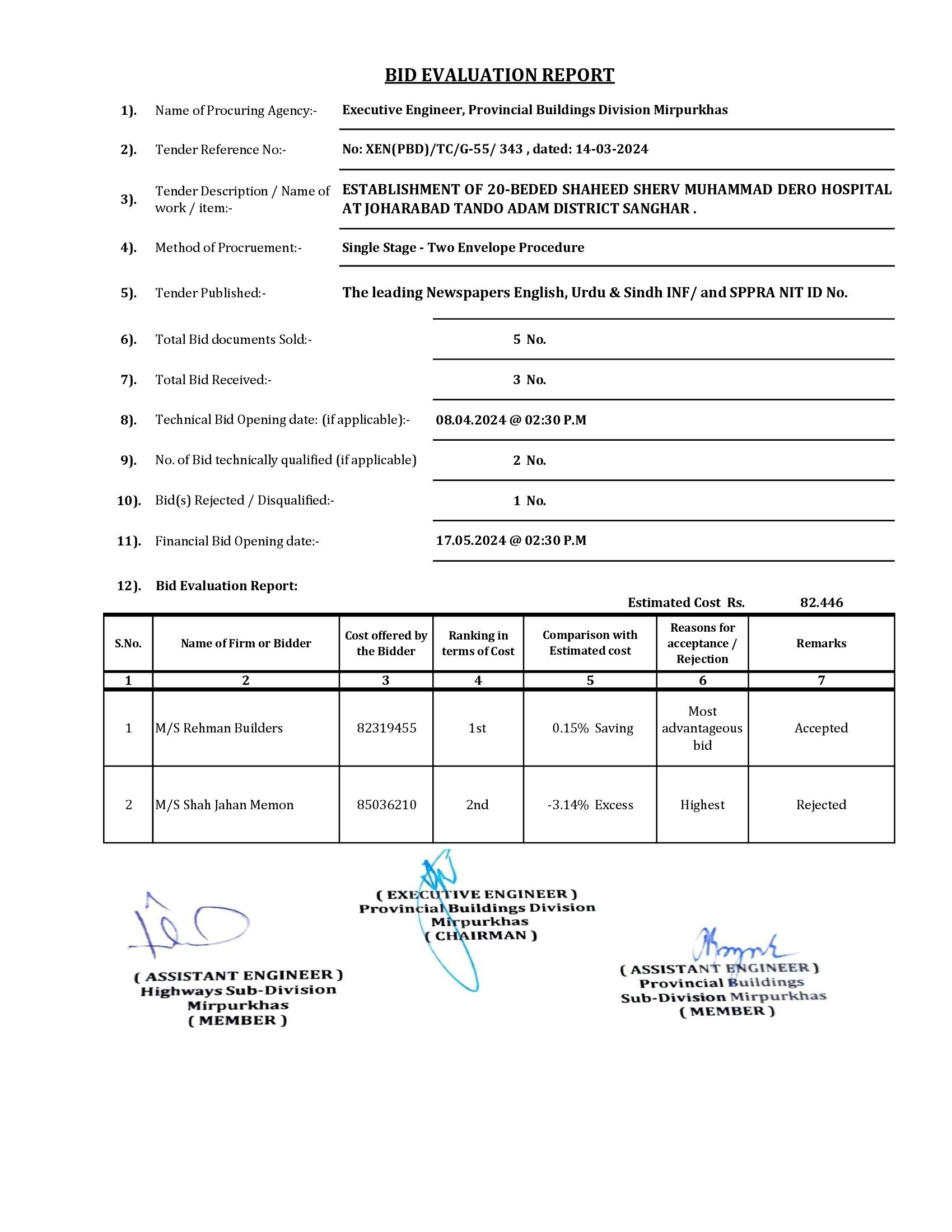 | T00734-23-0002 | BE00734-23-0001-3 | 8 ESTABLISHMENT OF 20-BEDED SHAHEED SHERV MUHAMMAD DERO HOSPITAL AT JOHARABAD TANDO ADAM DISTRICT SANGHAR. | Provincial Building Division Mirpurkhas (51-Works and Services Department) | 20-05-2024 | Mirpur Khas | Active |