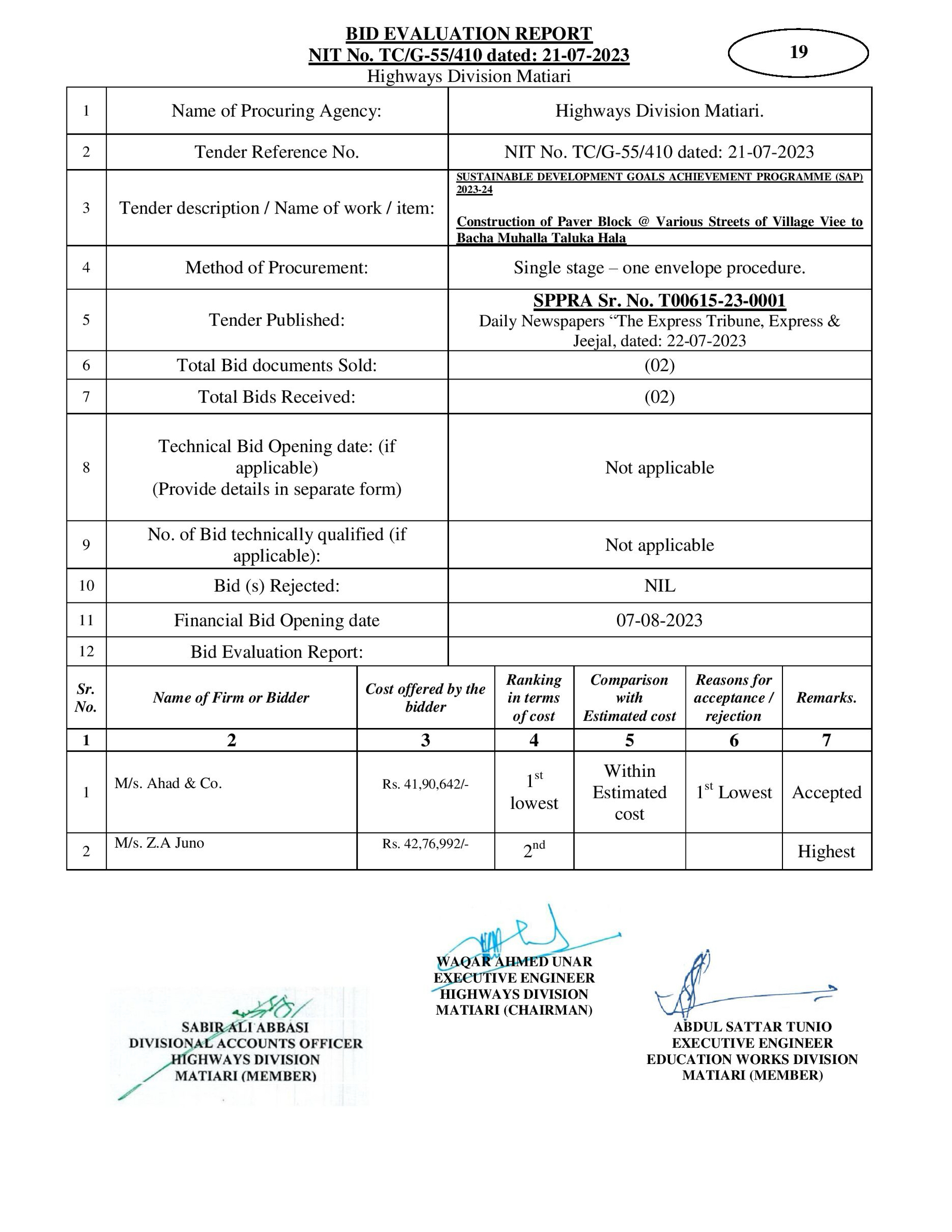 | T00615-23-0001 | BE00615-23-0001-19 | 19-Construction of Paver Block @ Various Streets of Village Viee to Bacha Muhalla Taluka Hala | XEN Highway Division Matiari (51-Works and Services Department) | 08-08-2023 | Matiari | Active |