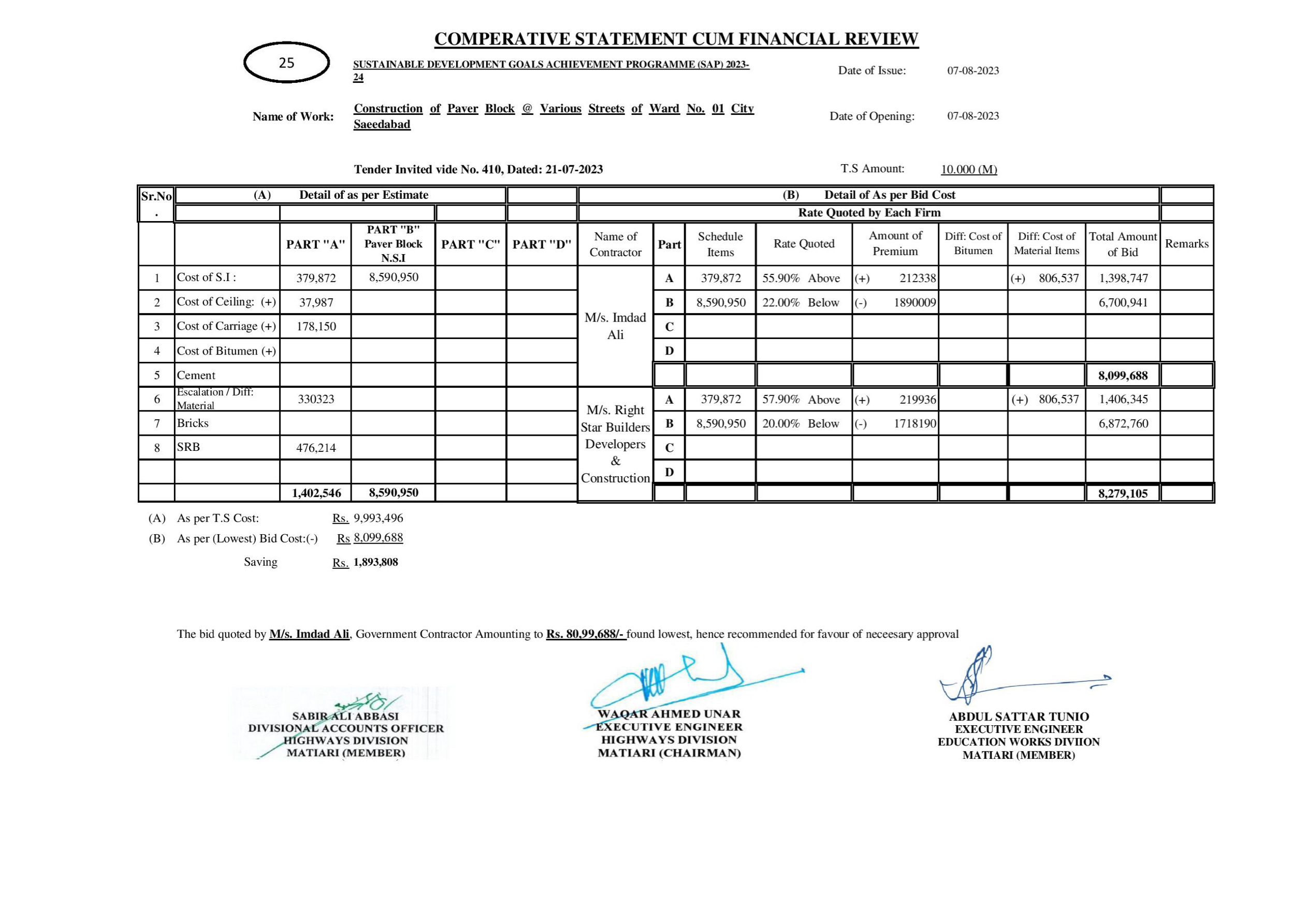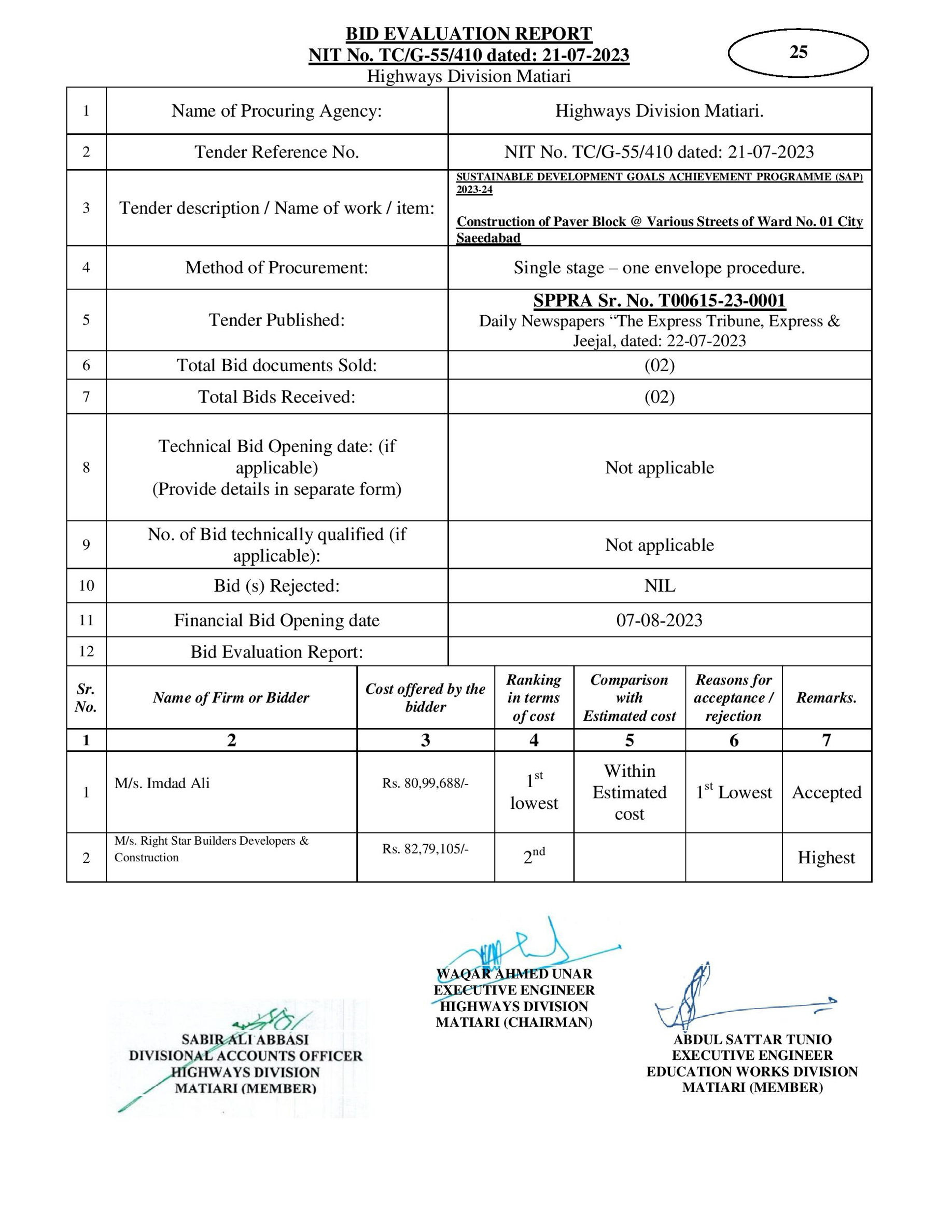 | T00615-23-0001 | BE00615-23-0001-25 | 25-Construction of Paver Block @ Various Streets of Ward No. 01 City Saeedabad | XEN Highway Division Matiari (51-Works and Services Department) | 08-08-2023 | Matiari | Active |