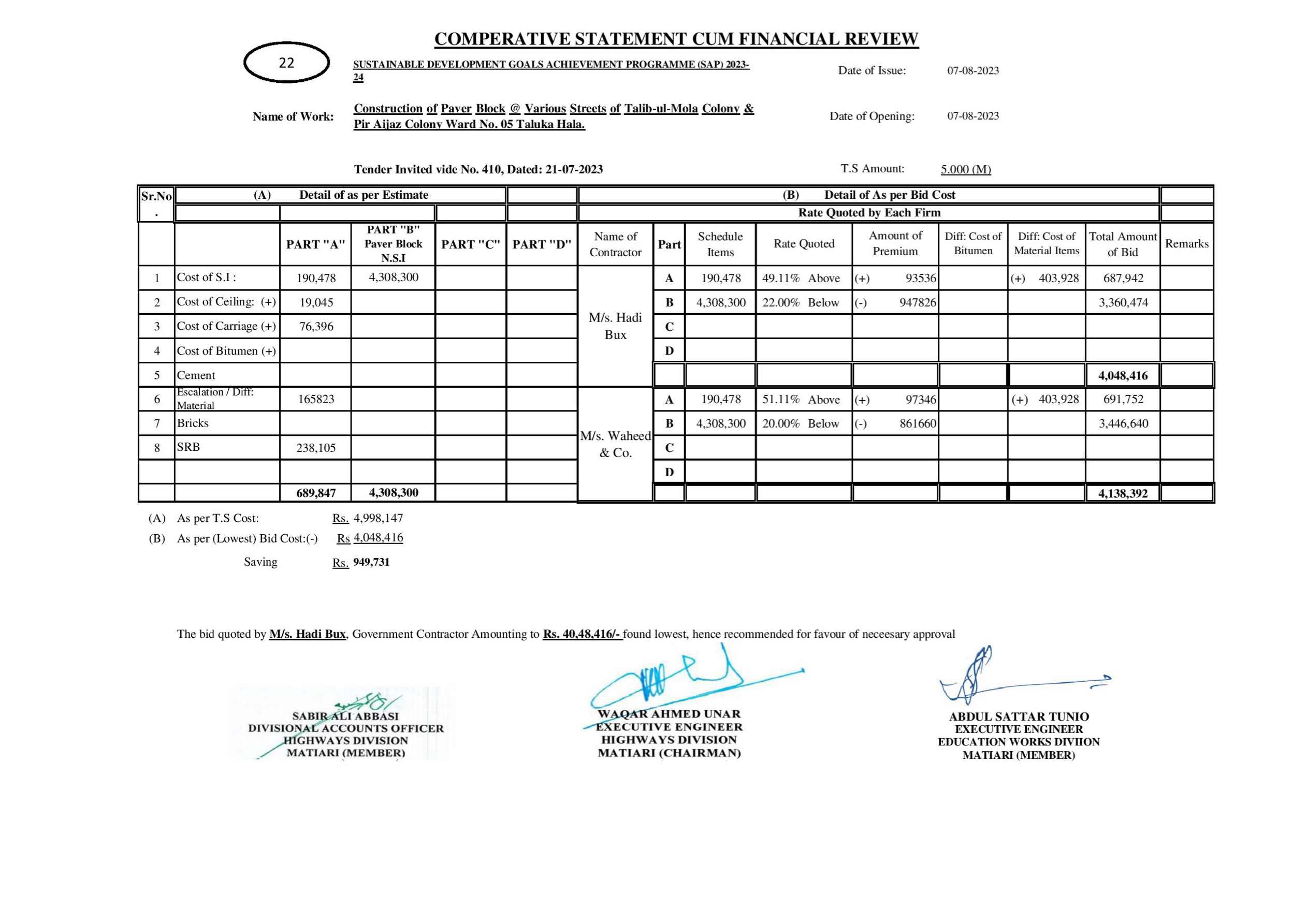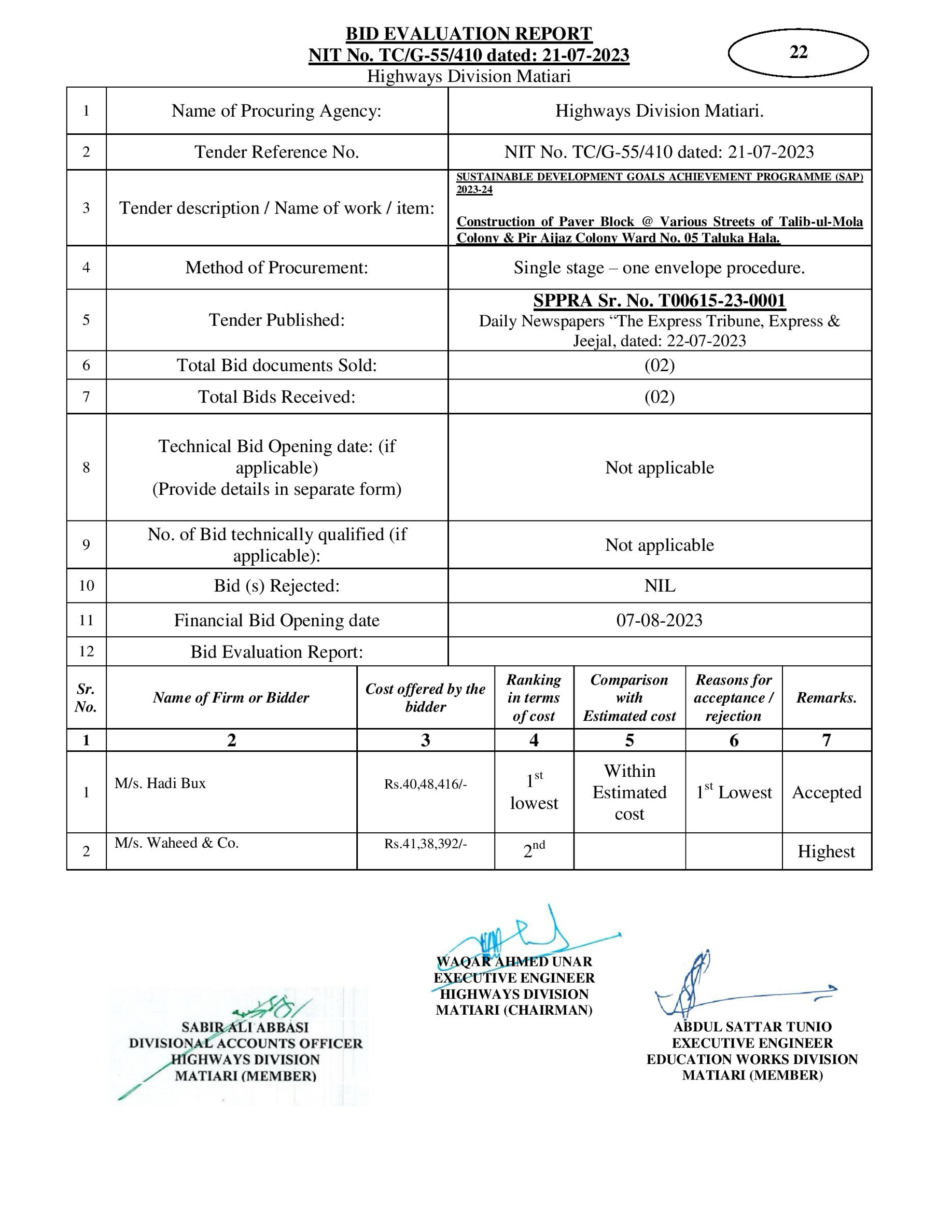 | T00615-23-0001 | BE00615-23-0001-22 | 22-Construction of Paver Block @ Various Streets of Talib-ul-Mola Colony & Pir Aijaz Colony Ward No. 05 Taluka Hala. | XEN Highway Division Matiari (51-Works and Services Department) | 08-08-2023 | Matiari | Active |