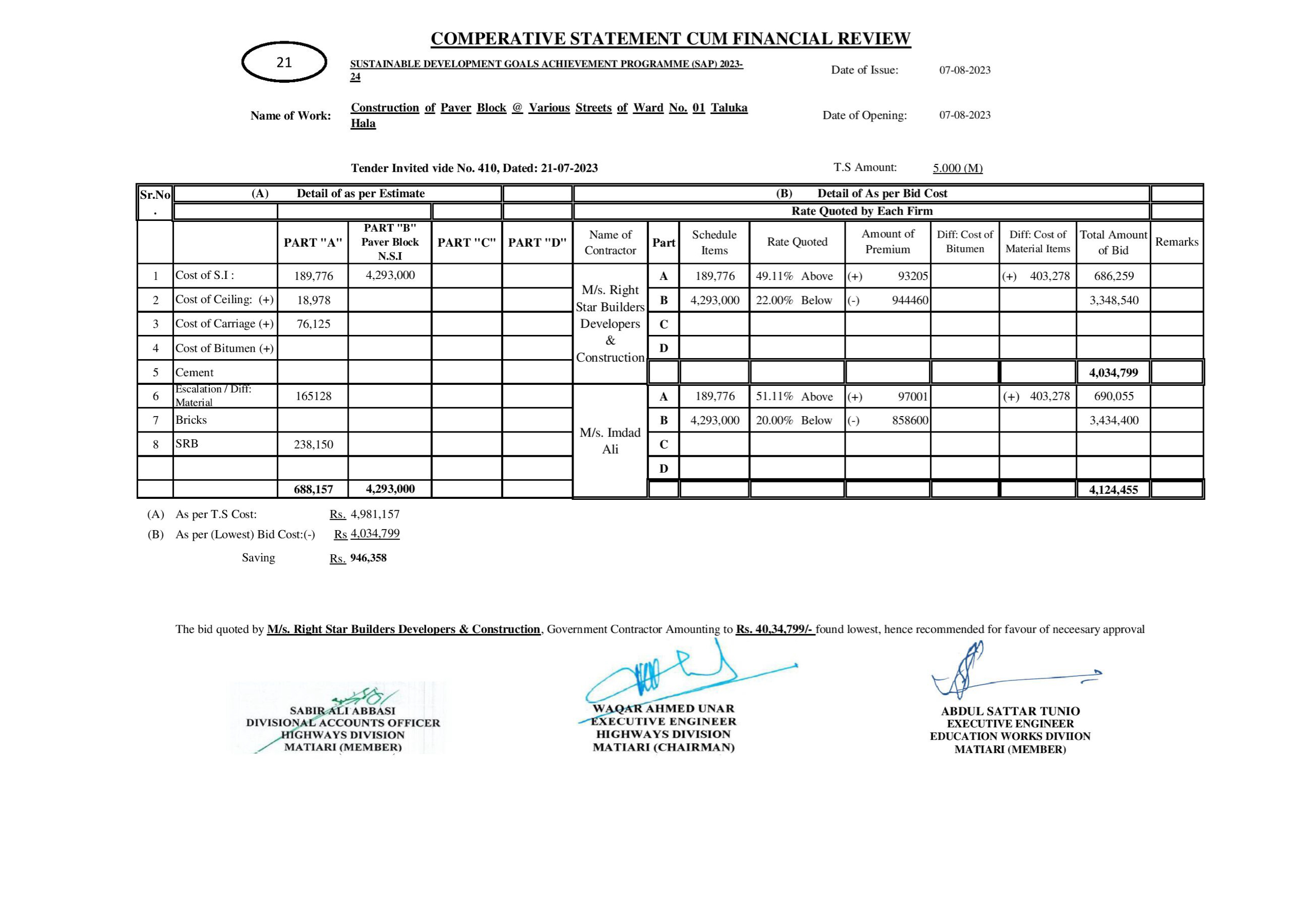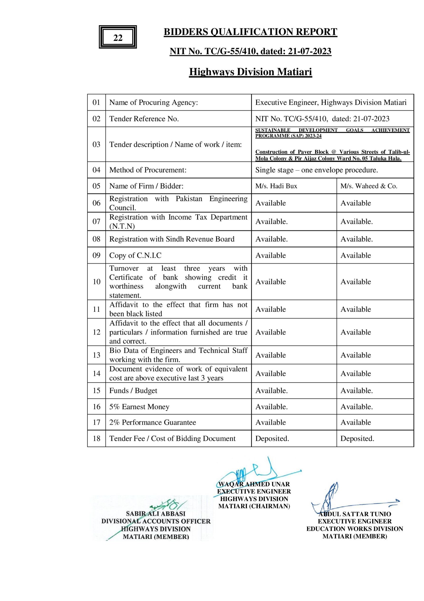 | T00615-23-0001 | BE00615-23-0001-21 | 21-Construction of Paver Block @ Various Streets of Ward No. 01 Taluka Hala | XEN Highway Division Matiari (51-Works and Services Department) | 08-08-2023 | Matiari | Active |