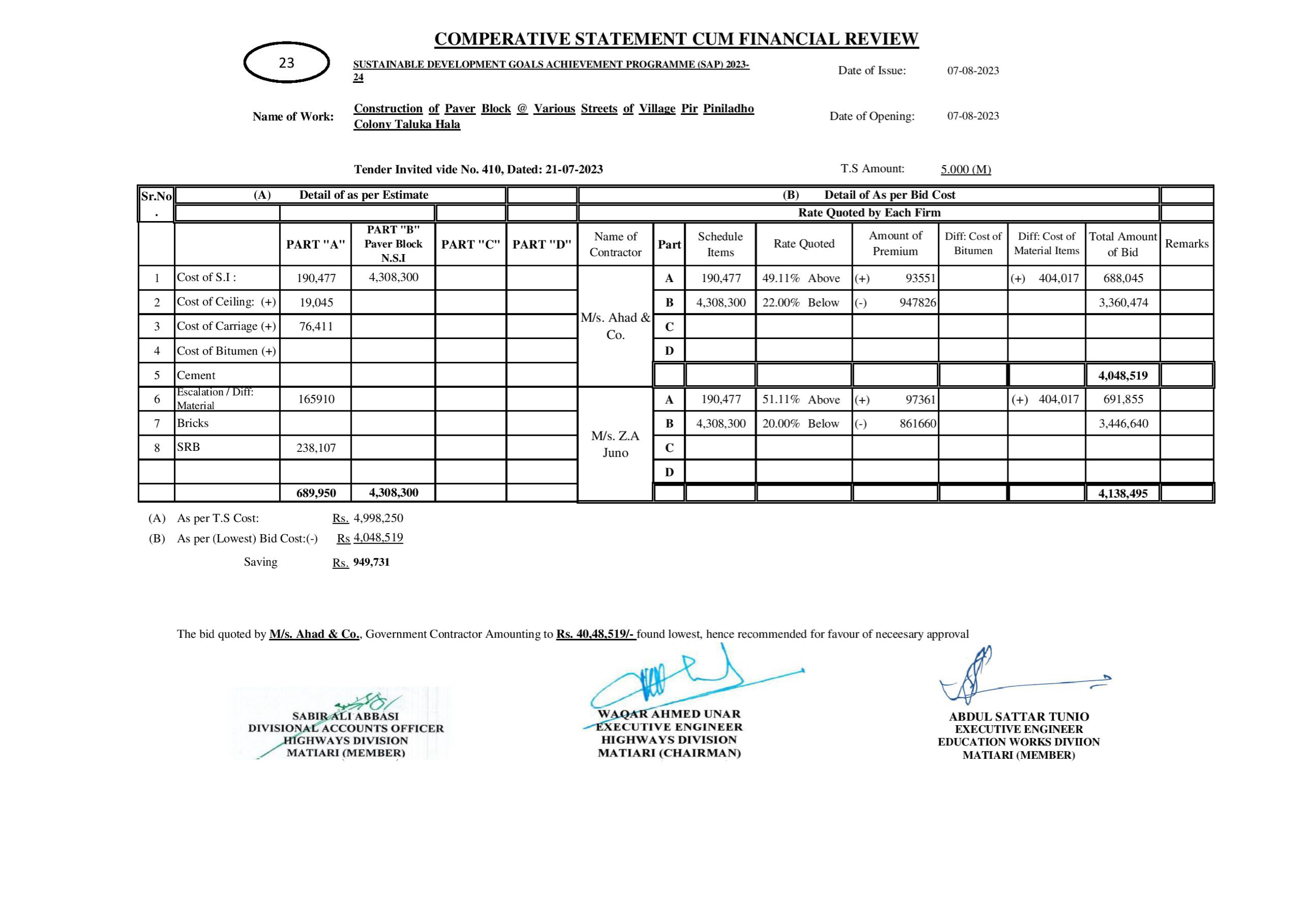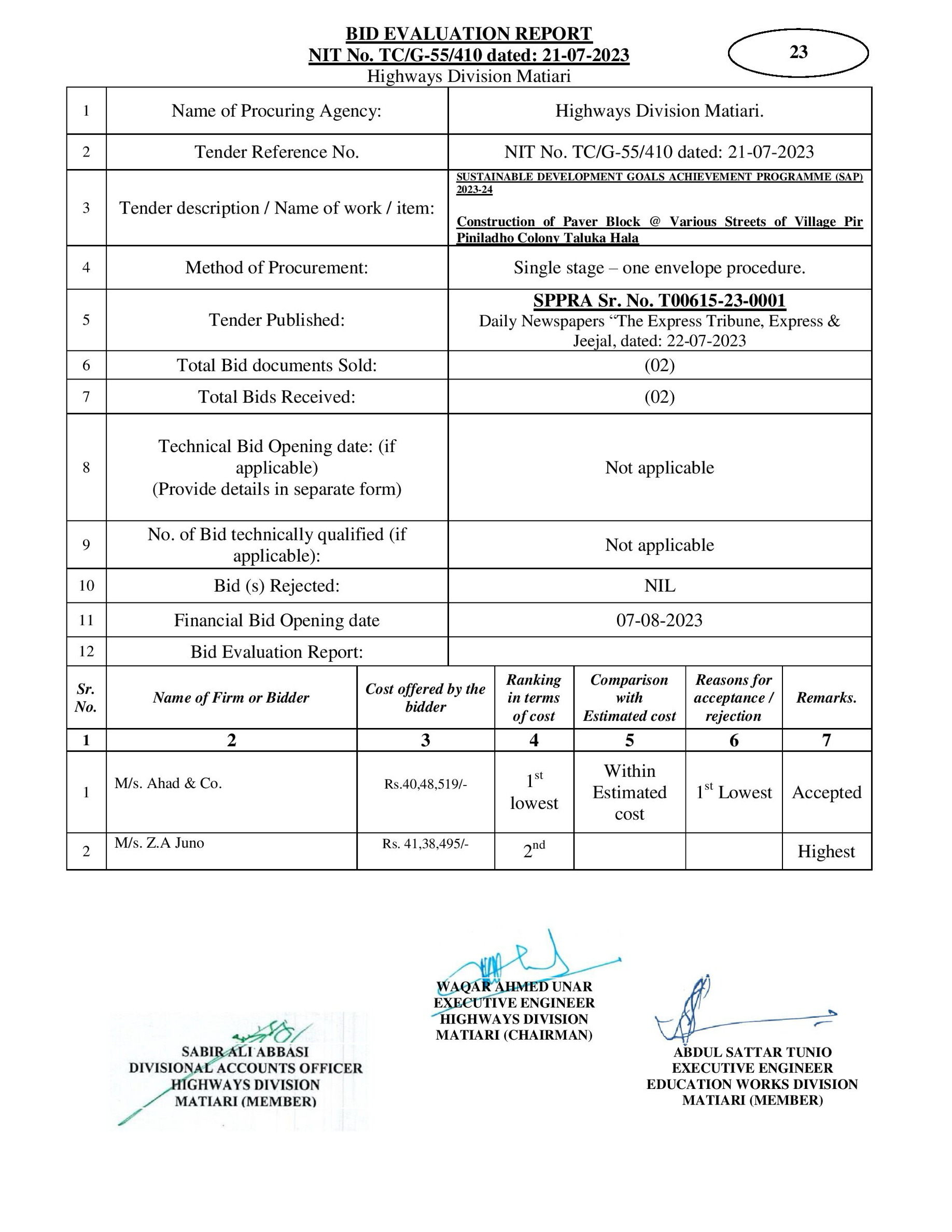 | T00615-23-0001 | BE00615-23-0001-23 | 23-Construction of Paver Block @ Various Streets of Village Pir Piniladho Colony Taluka Hala | XEN Highway Division Matiari (51-Works and Services Department) | 08-08-2023 | Matiari | Active |