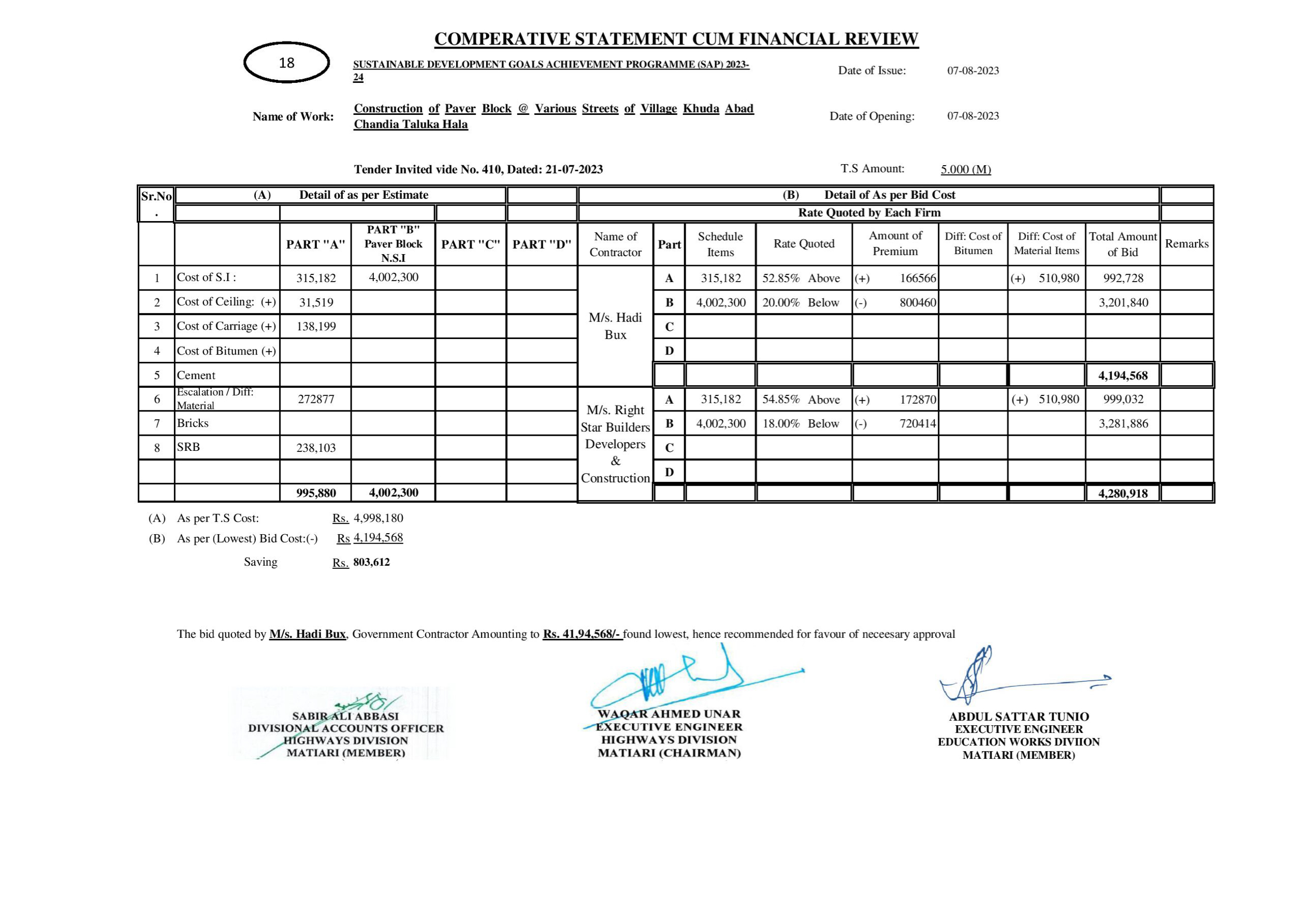 | T00615-23-0001 | BE00615-23-0001-18 | 18-Construction of Paver Block @ Various Streets of Village Khuda Abad Chandia Taluka Hala | XEN Highway Division Matiari (51-Works and Services Department) | 08-08-2023 | Matiari | Active |