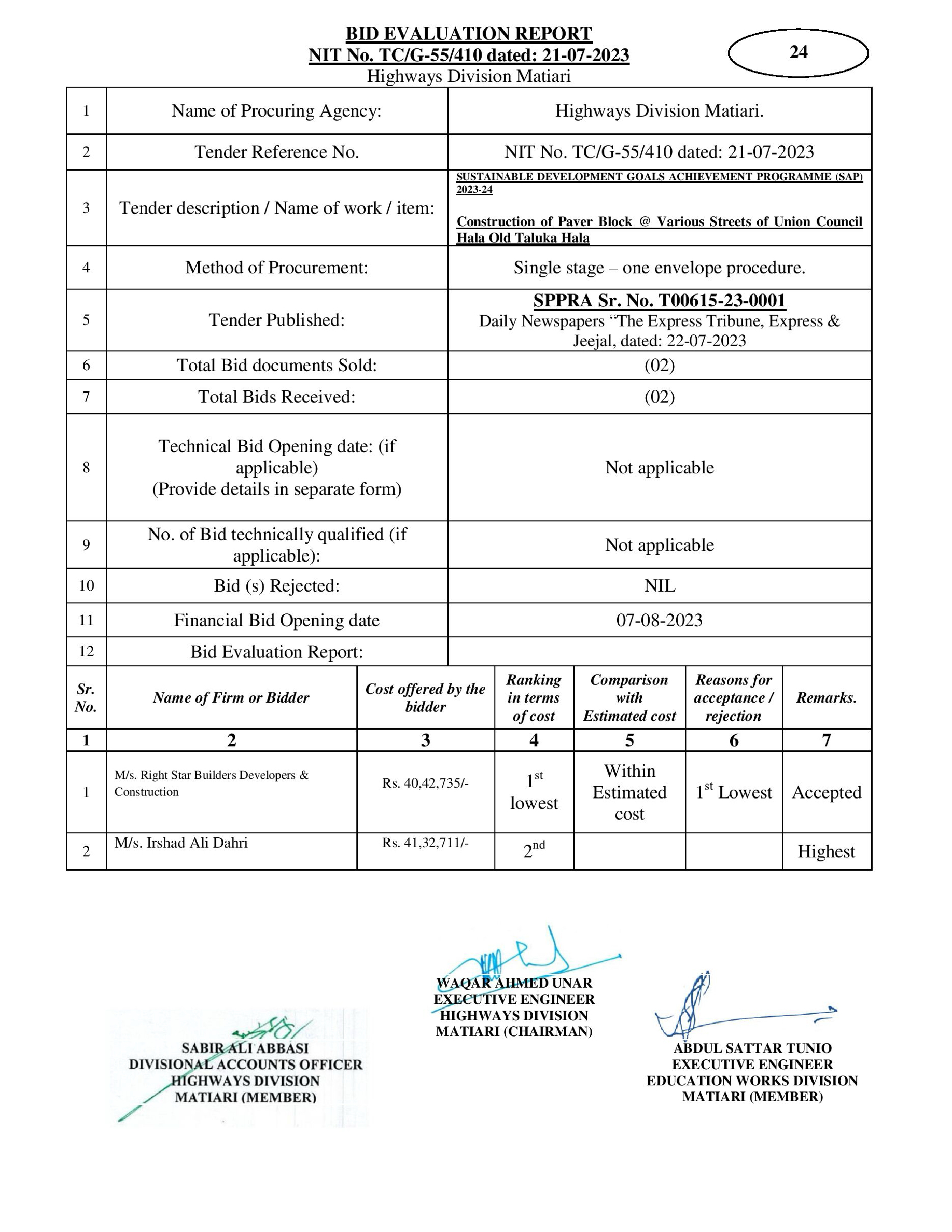 | T00615-23-0001 | BE00615-23-0001-24 | 24-Construction of Paver Block @ Various Streets of Union Council Hala Old Taluka Hala | XEN Highway Division Matiari (51-Works and Services Department) | 08-08-2023 | Matiari | Active |