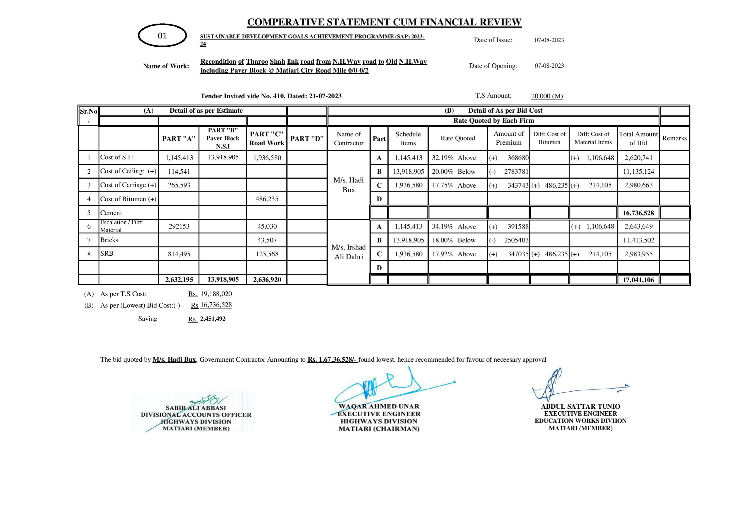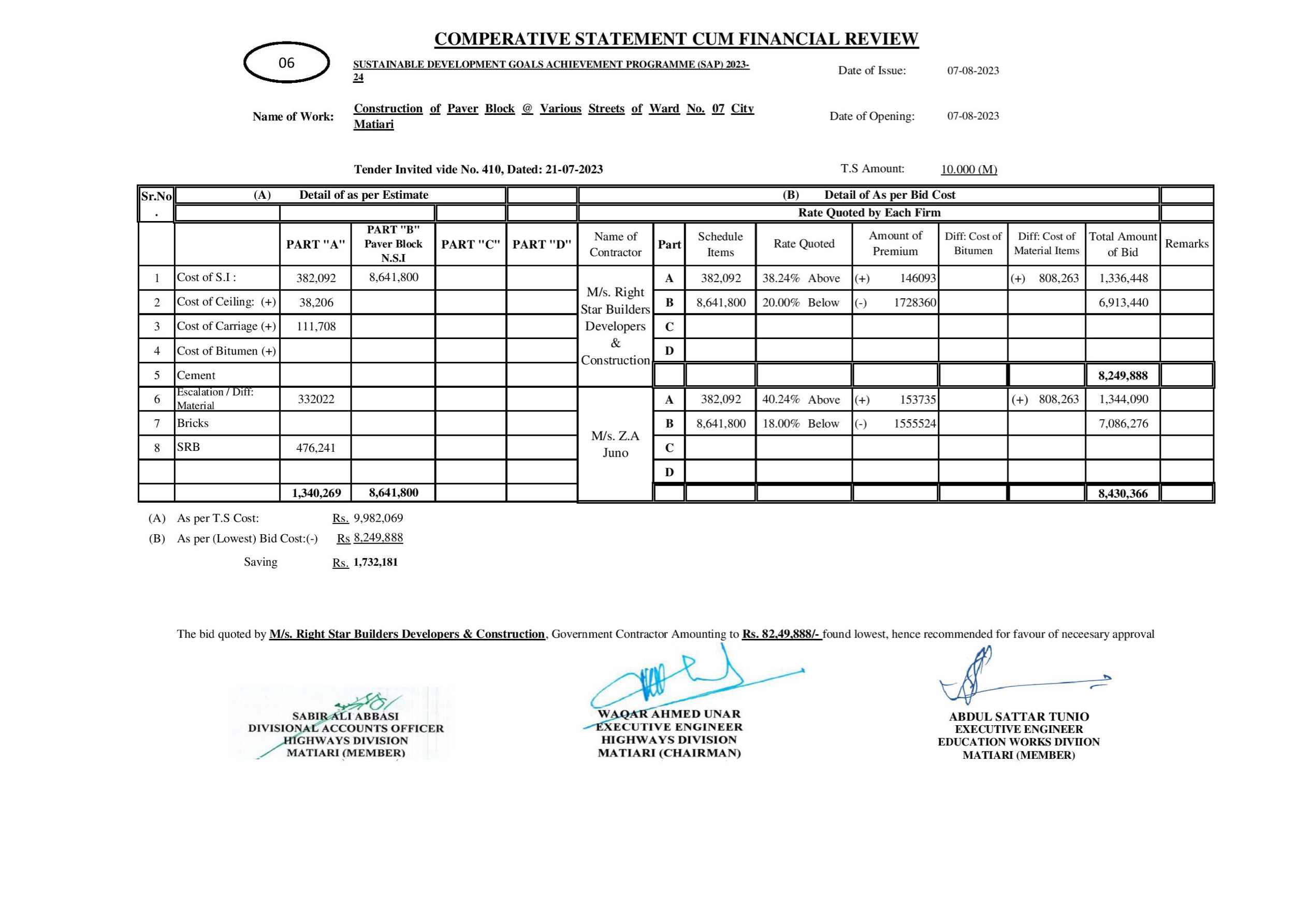 | T00615-23-0001 | BE00615-23-0001-6 | 06-Construction of Paver Block @ Various Streets of Ward No. 07 City Matiari | XEN Highway Division Matiari (51-Works and Services Department) | 08-08-2023 | Matiari | Active |