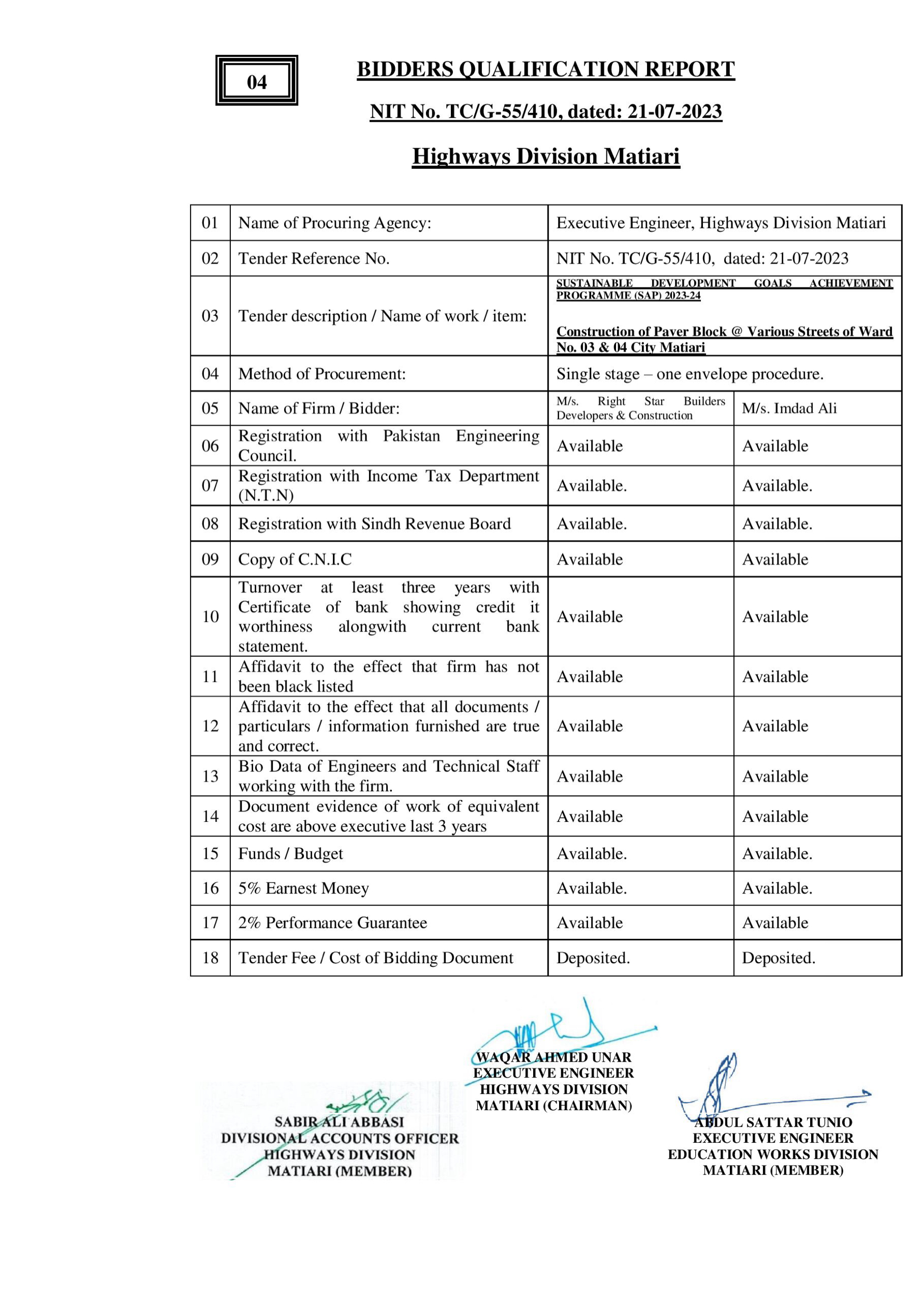 | T00615-23-0001 | BE00615-23-0001-4 | 04-Construction of Paver Block @ Various Streets of Ward No. 03 & 04 City Matiari | XEN Highway Division Matiari (51-Works and Services Department) | 08-08-2023 | Matiari | Active |