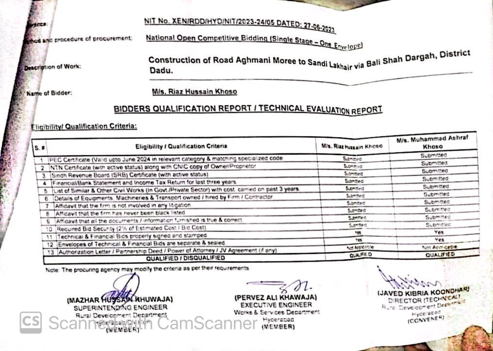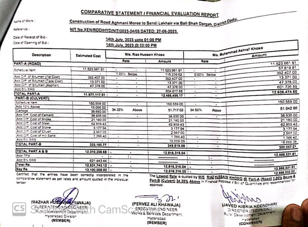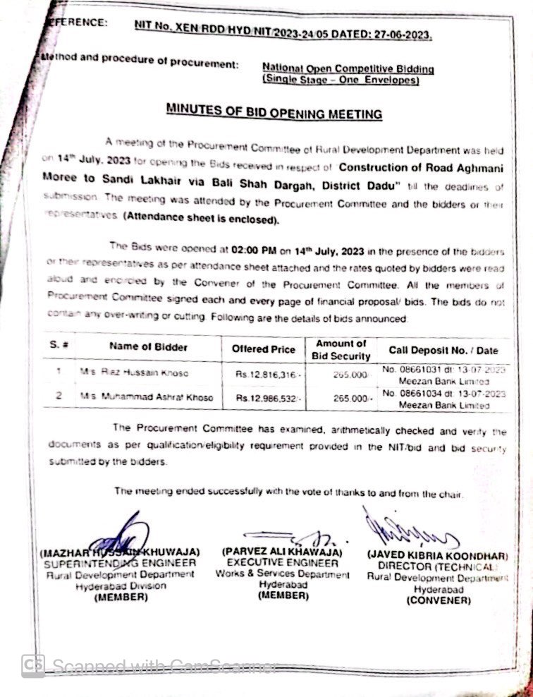 | T01703-22-0001 | BE01703-22-0001-1 | CONSTRUCTION OF ROAD AGHMANI MOREE TO SANDI LAKHAIR VIA BALI SHAH DARGAH, DISTRICT DADU. | XEN RuralDevlopment Hyderabad Division (56-Rural Development Department) | 17-07-2023 | Hyderabad | Active |