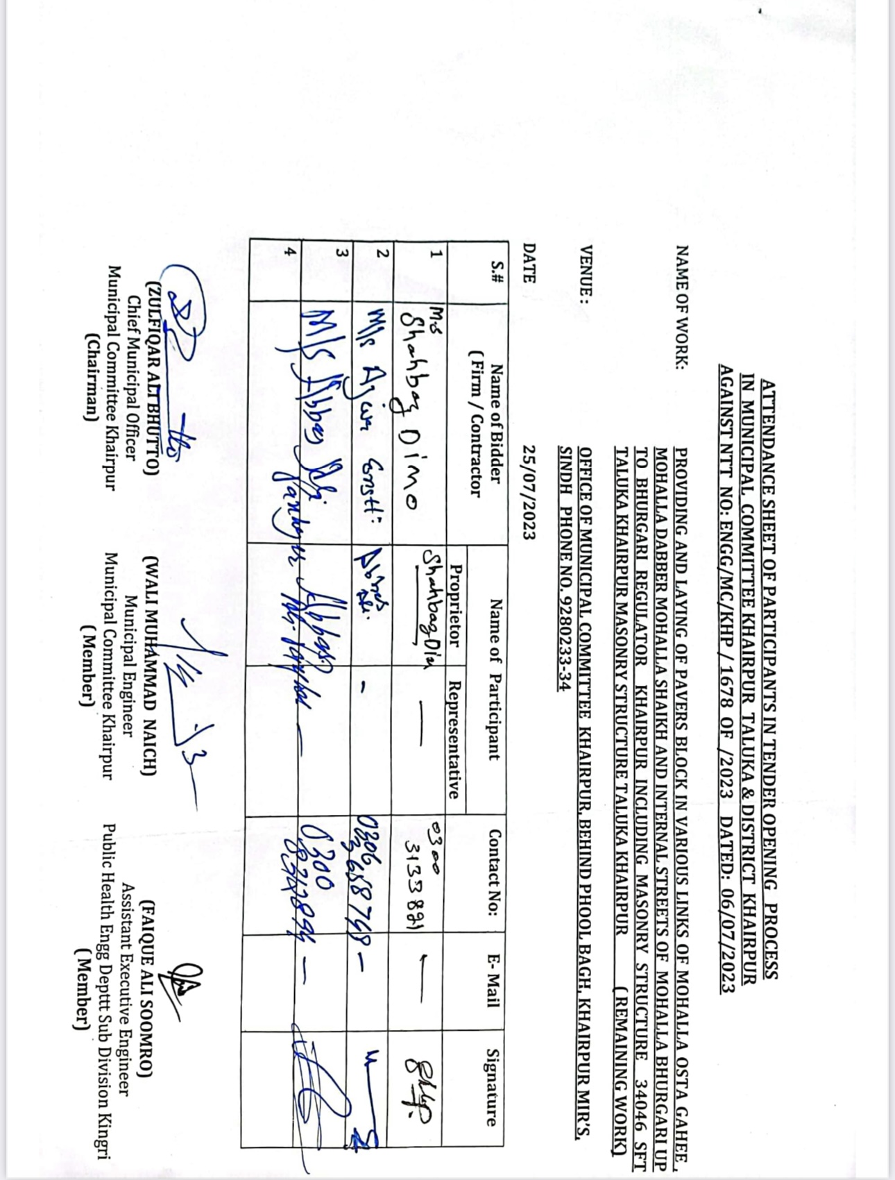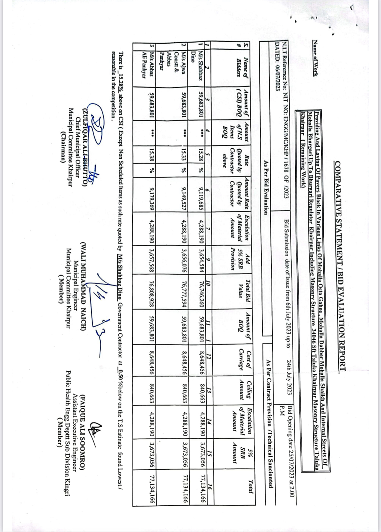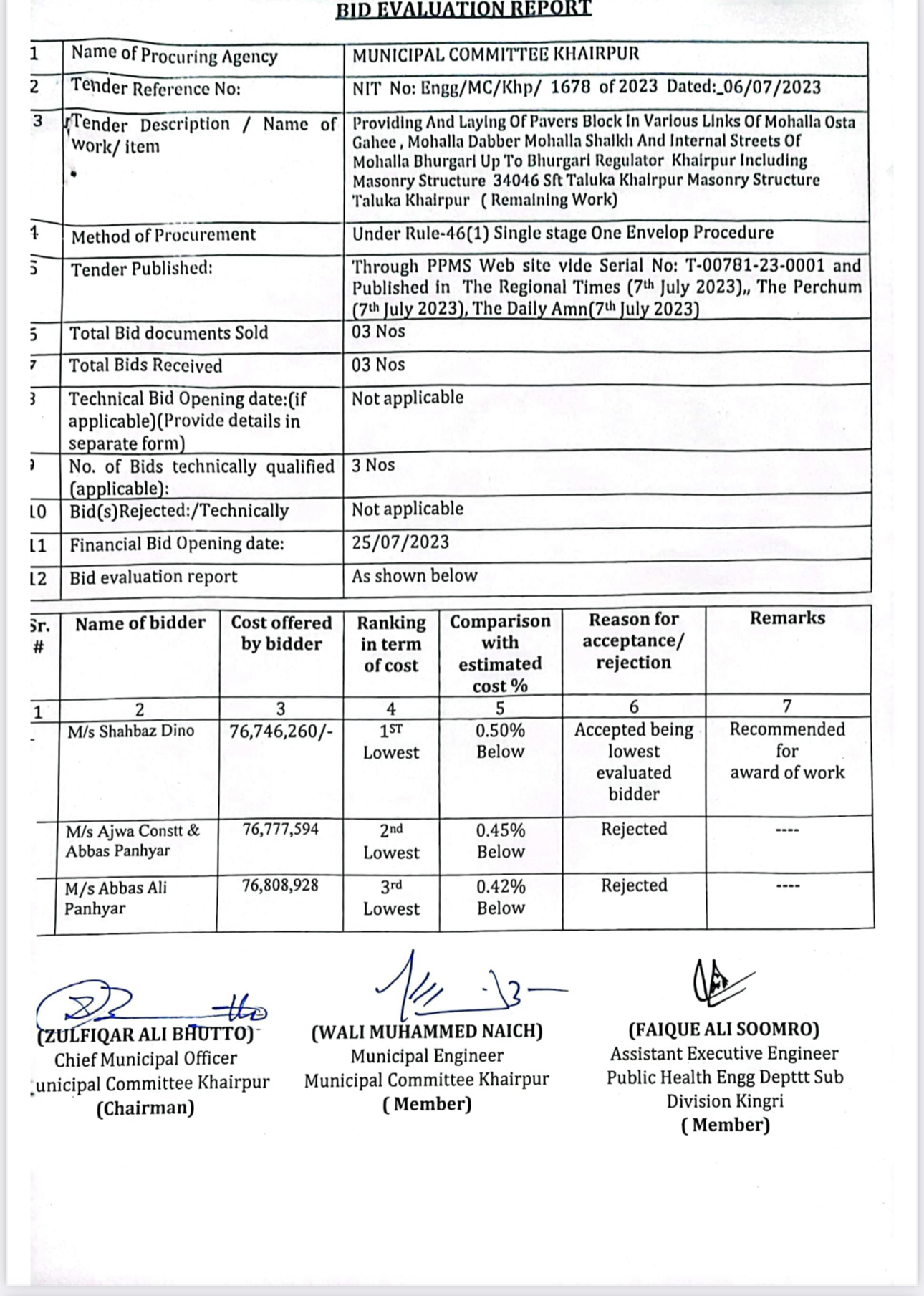 | T00781-23-0001 | BE00781-23-0001-1 | 1PROVIDING AND LAYING OF PAVERS BLOCK IN VARIOUS LINKS OF MOHALLA OSTA GAHEE, MOHALLA DABBER MOHALLA SHAIKH AND INTERNAL STREETS OF MOHALLA BHURGARI UP TO BHURGARI REGULATOR KHAIRPUR TALUKA KHAIRPUR (REMAINING WORK) | Municipal Committee Khairpur (27-Local Government Department) | 27-07-2023 | Khairpur | Active |