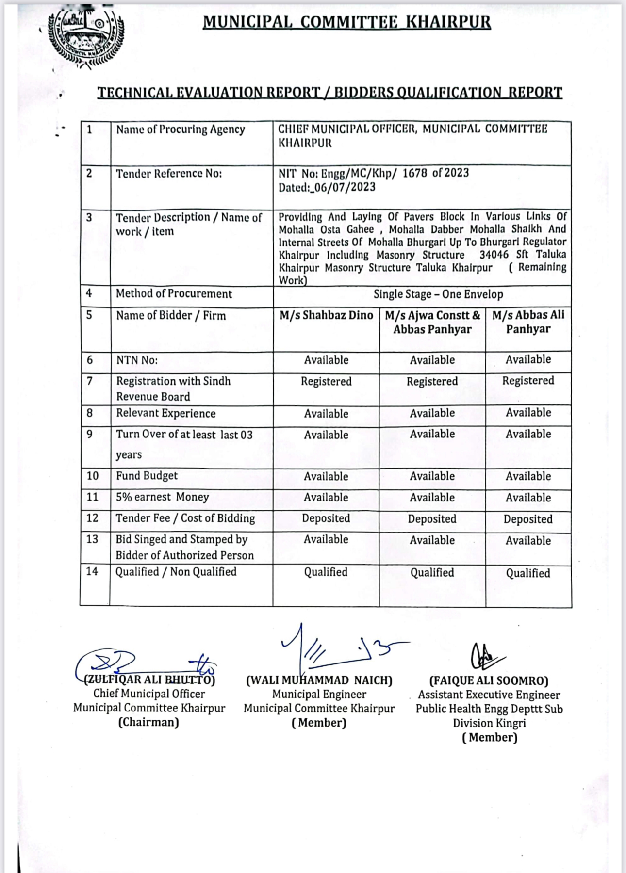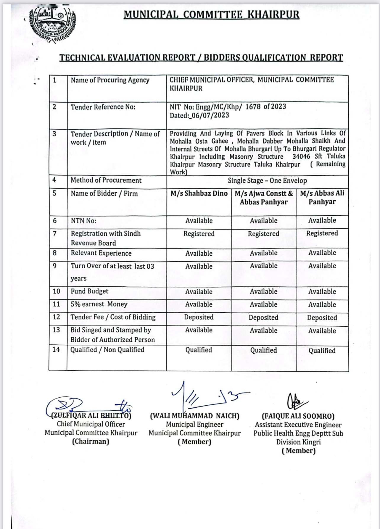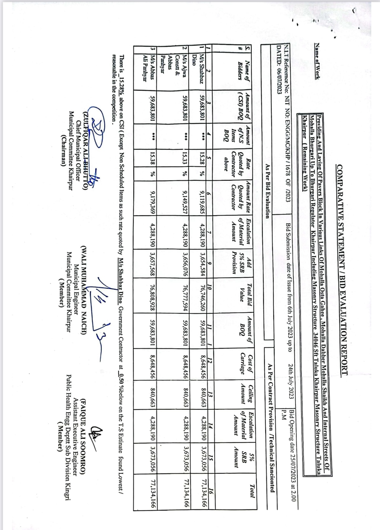 | T00781-23-0001 | BE00781-23-0001-1 | 1PROVIDING AND LAYING OF PAVERS BLOCK IN VARIOUS LINKS OF MOHALLA OSTA GAHEE, MOHALLA DABBER MOHALLA SHAIKH AND INTERNAL STREETS OF MOHALLA BHURGARI UP TO BHURGARI REGULATOR KHAIRPUR TALUKA KHAIRPUR (REMAINING WORK) | Municipal Committee Khairpur (27-Local Government Department) | 27-07-2023 | Khairpur | Active |