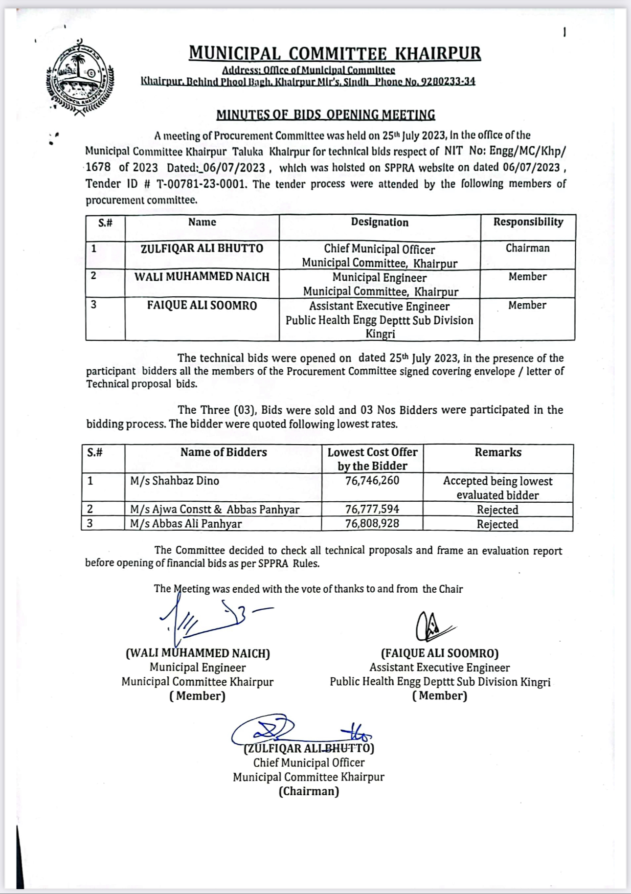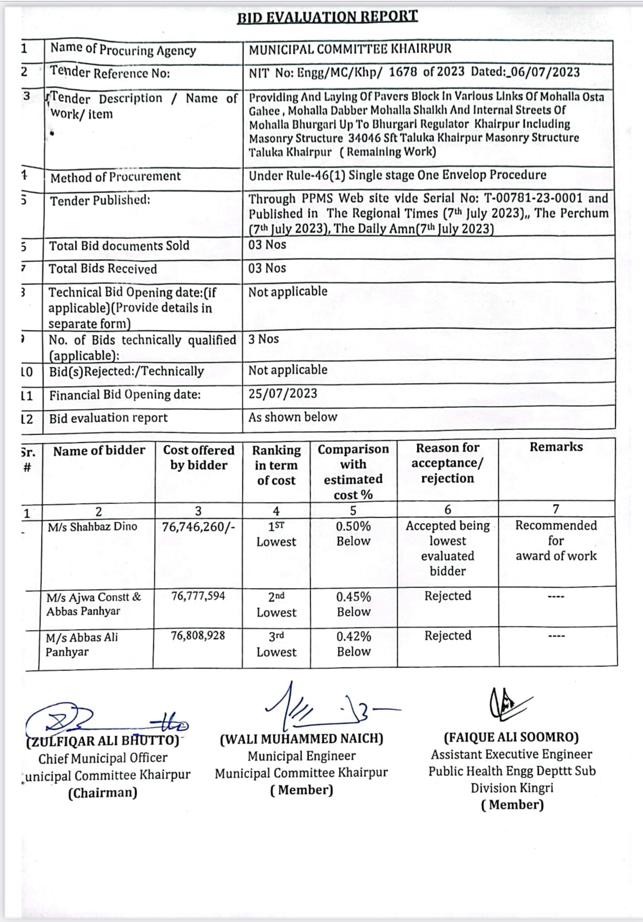 | T00781-23-0001 | BE00781-23-0001-2 | PROVIDING AND LAYING OF PAVERS BLOCK FROM FIRDOS MASJID MILL COLONY JINNAH COLONY ROAD AND TECHNICAL UNIVERSITY ROAD VIA FOOD GOODOWN INCLUDING VARIOUS STREETS OF KHANAN SHAH MOHALLA, MANGI MOHALLA NIZAMANI KHAIRPUR (REMAINING WORK) | Municipal Committee Khairpur (27-Local Government Department) | 27-07-2023 | Khairpur | Active |
