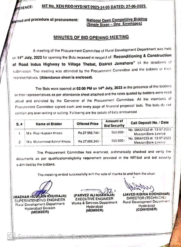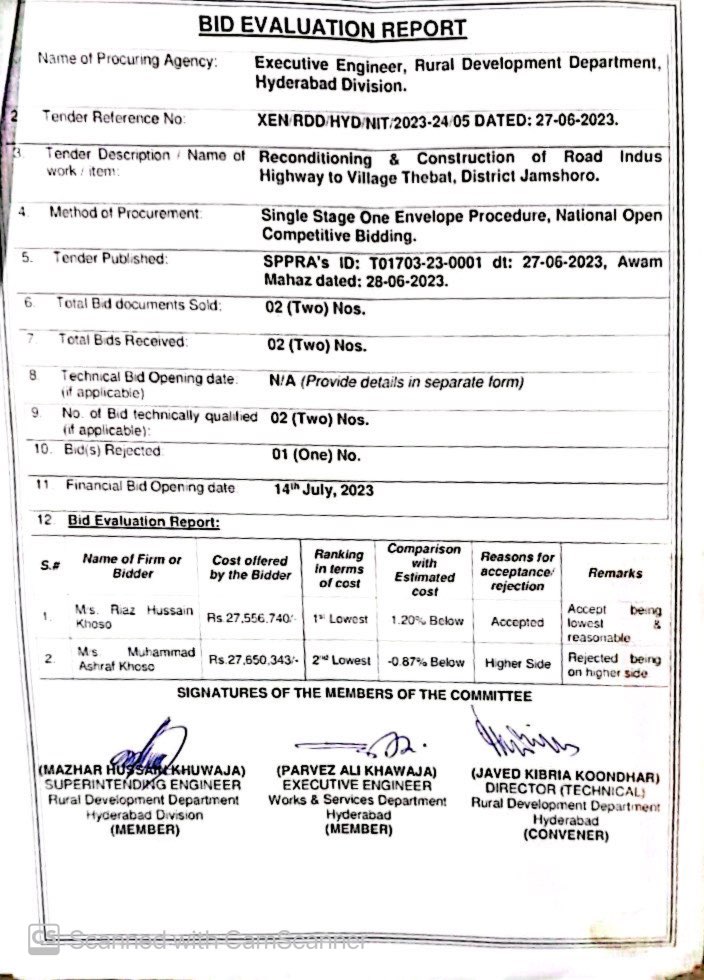 | T01703-22-0001 | BE01703-22-0001-2 | RECONDITIONING & CONSTRUCTION OF ROAD INDUS HIGHWAY TO VILLAGE THOBAL, DEISTIC JAMSHORO | XEN RuralDevlopment Hyderabad Division (56-Rural Development Department) | 17-07-2023 | Hyderabad | Active |